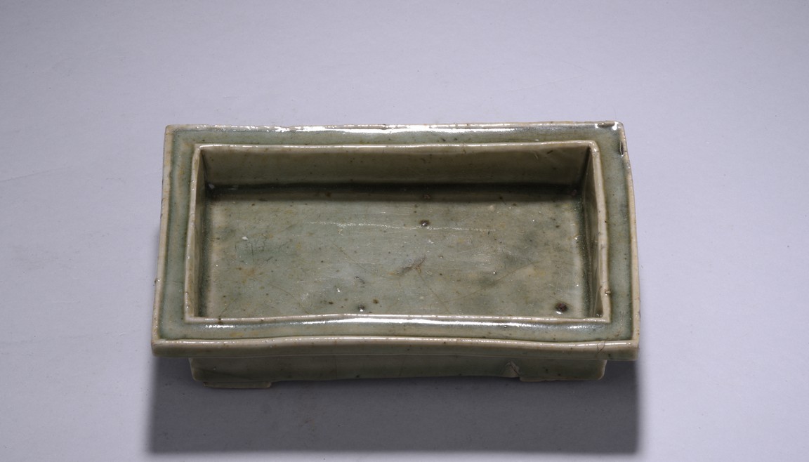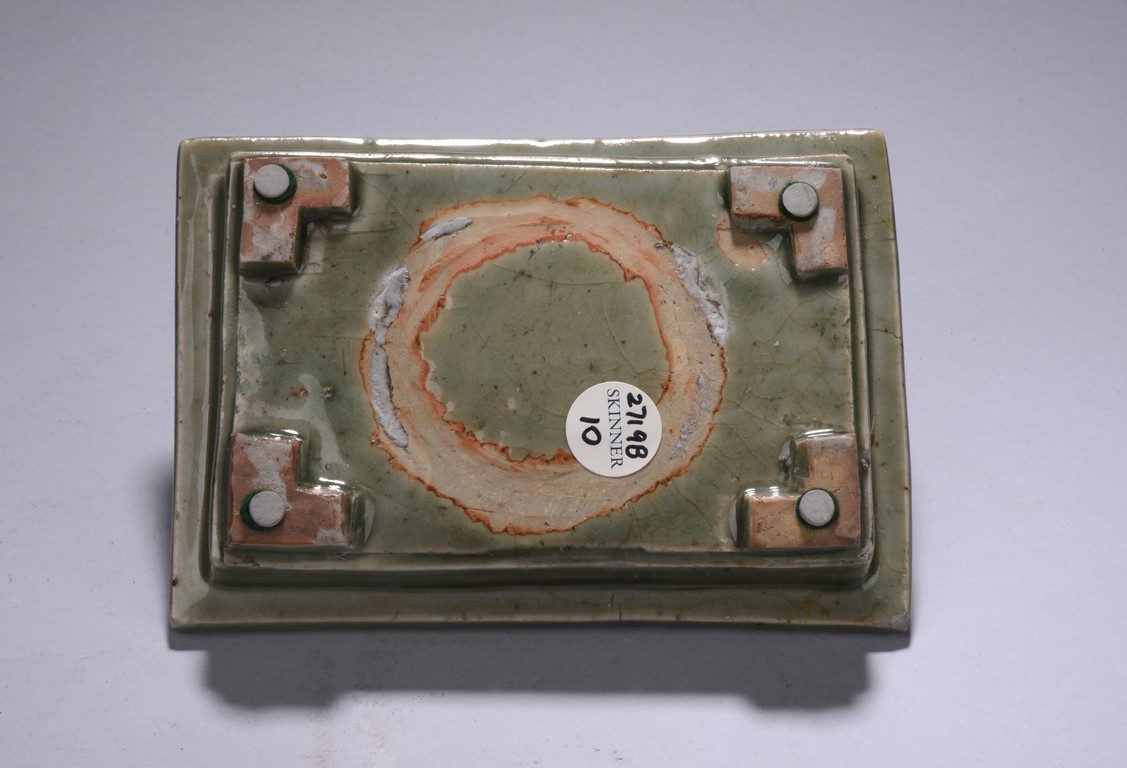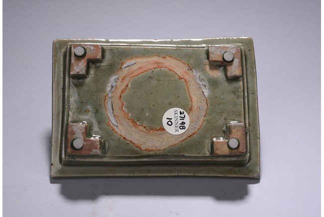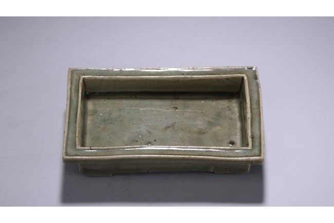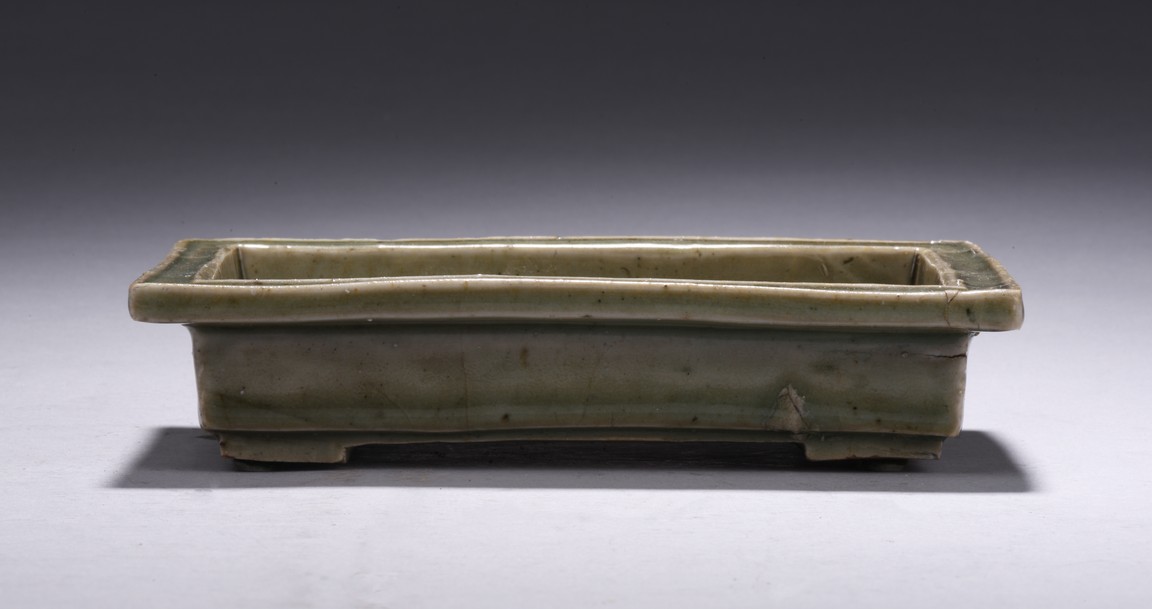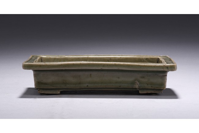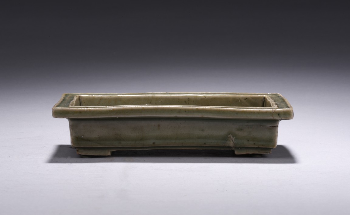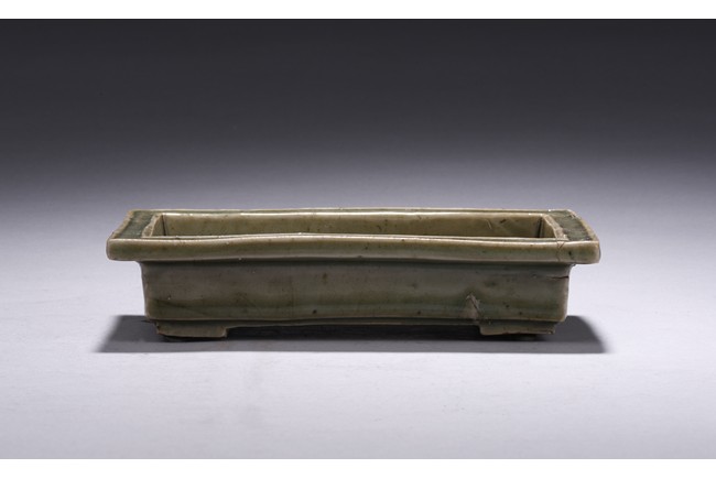 The rectangular planter supported on four short legs, with an rim decorated with two white borders, overall covered with deep green glaze. Ming Dynasty period