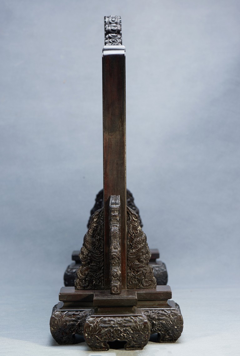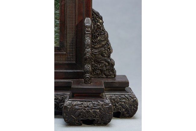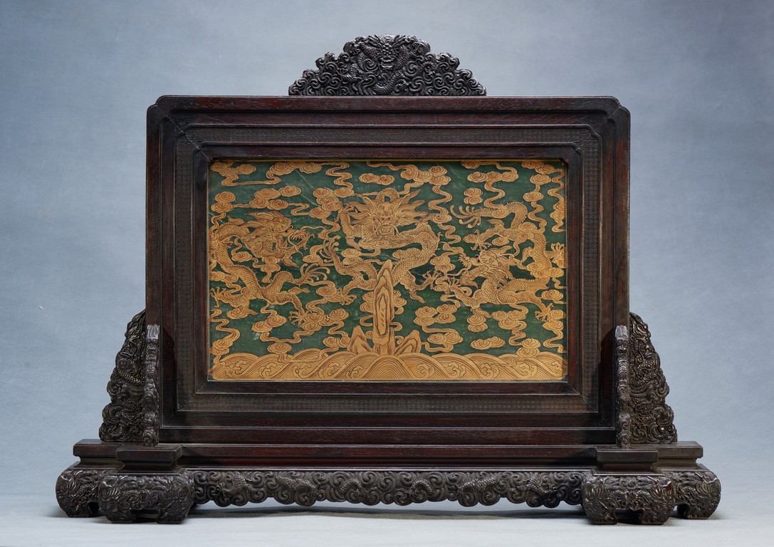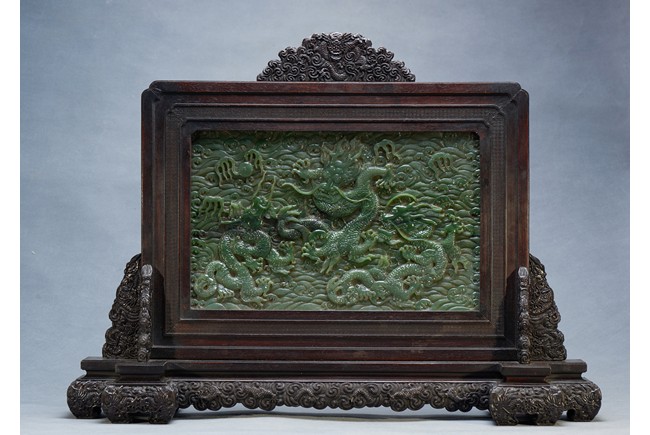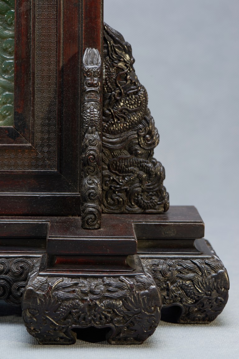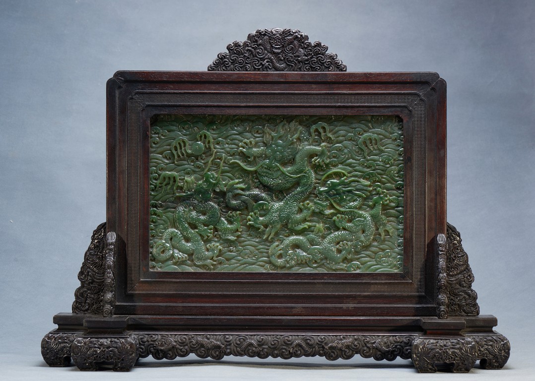 The rectangular spinach jade panel is finely carved in high relief with three striding dragon, each's head is highlighted by the bulbous eyes and long mane, with powerful claws amidst in layers of scrolling clouds, the reverse gilt-painted with three powerful five clawed dragons amongst clouds and above turbulent waves. The table screen supported on an fitted zitan stand with flanges and apron carved with intertwining archaistic and scrolling design.