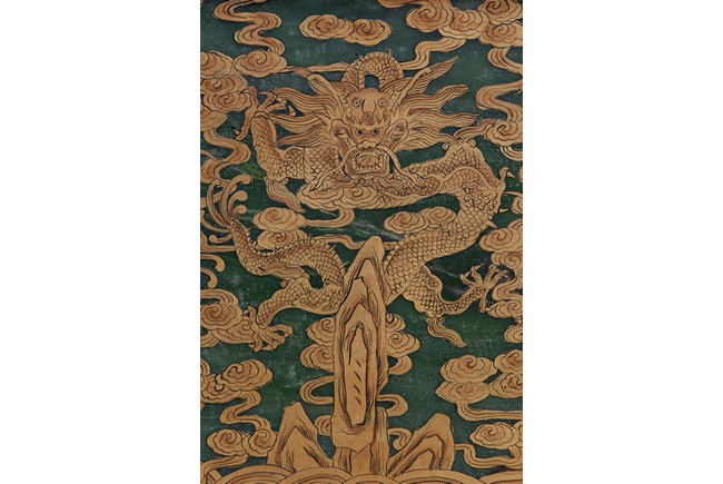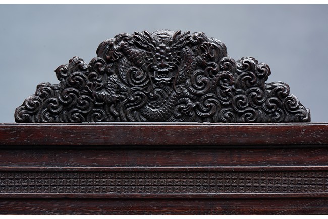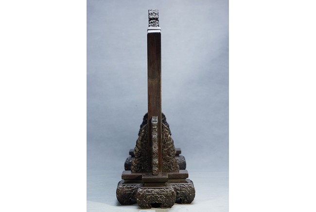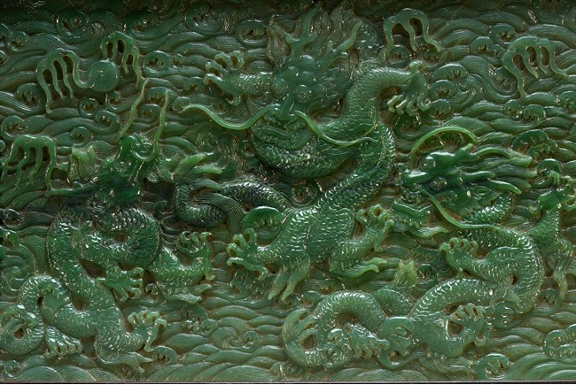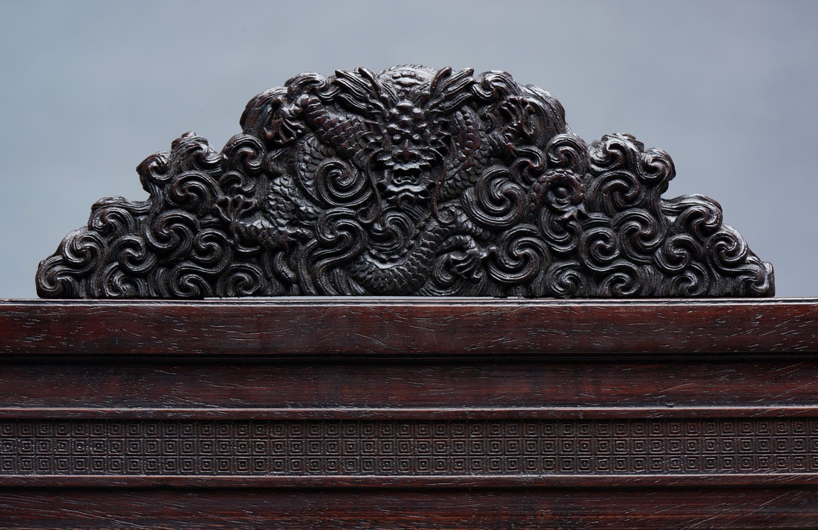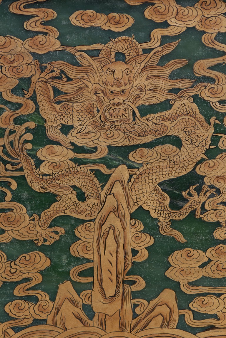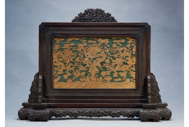 The rectangular spinach jade panel is finely carved in high relief with three striding dragon, each's head is highlighted by the bulbous eyes and long mane, with powerful claws amidst in layers of scrolling clouds, the reverse gilt-painted with three powerful five clawed dragons amongst clouds and above turbulent waves. The table screen supported on an fitted zitan stand with flanges and apron carved with intertwining archaistic and scrolling design.