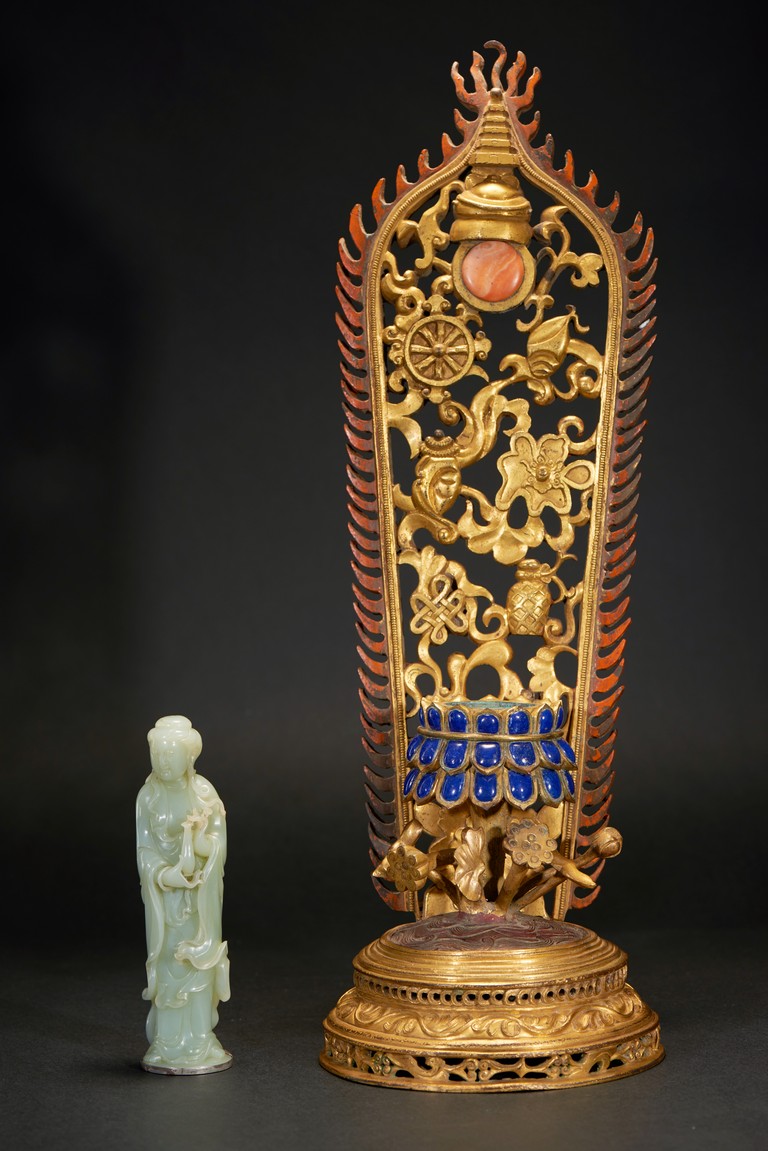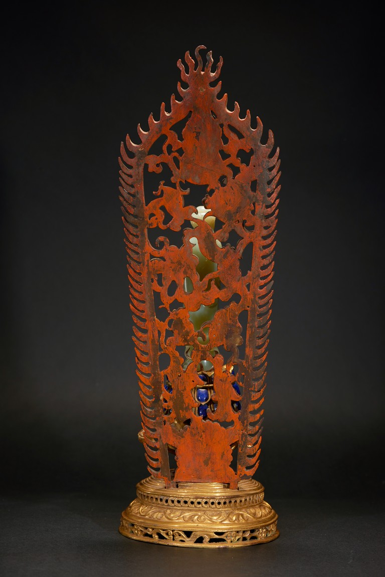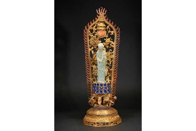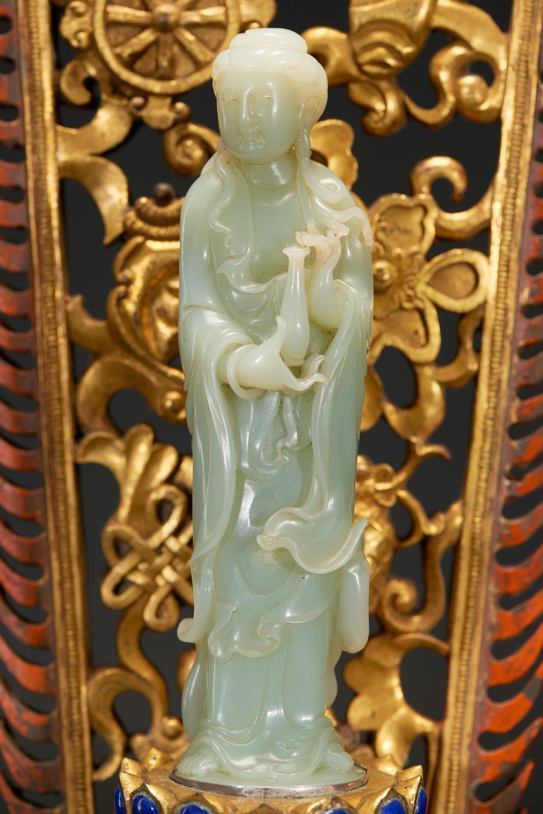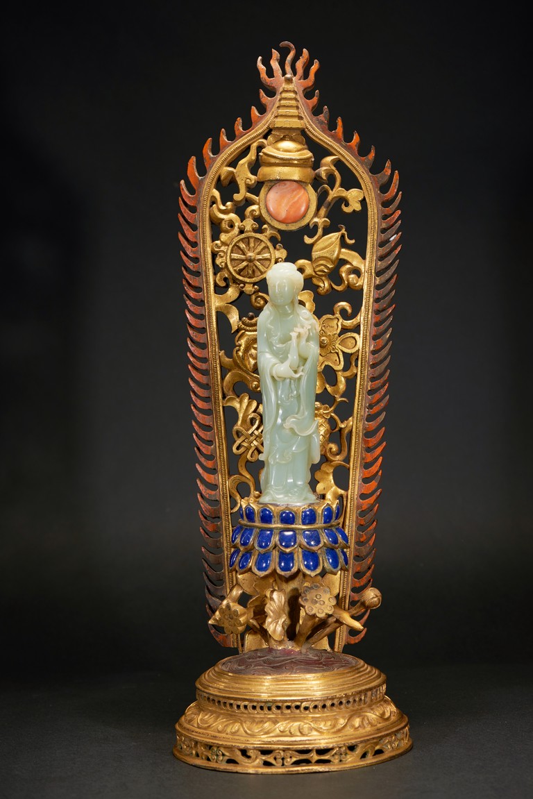 Standing upon lapis lazuli inlaid gilt bronze triple lotus throne, the Guanyin is shown finely carved standing, holding an long pear-shape vase in her hands,wearing long flowing robes, the stone of pale greenish-white tone, accompanied with an tall shaped mandorla with eight auspicious emblems framed by flame border, embellished with an large coral bead.