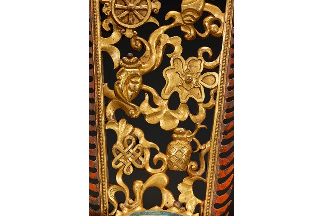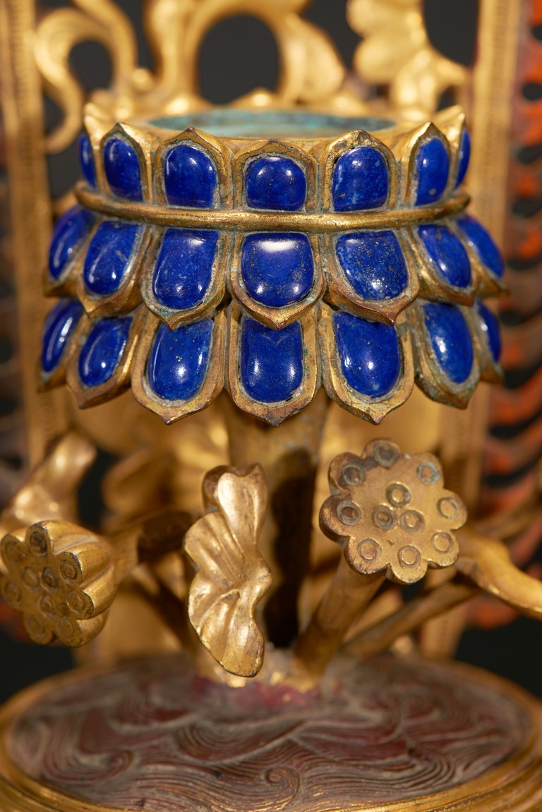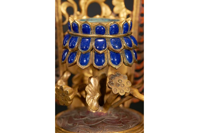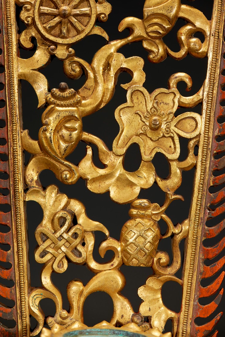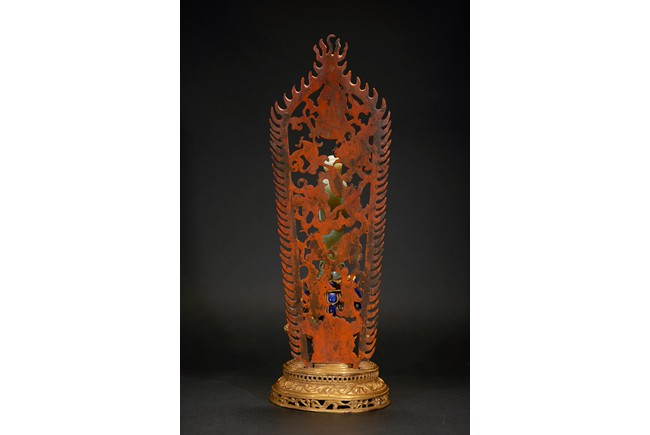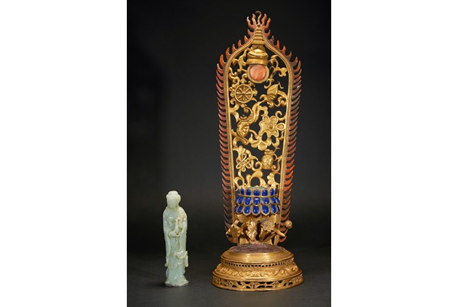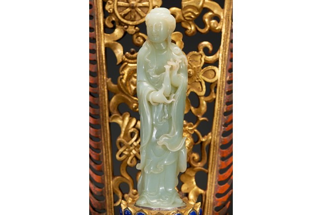 Standing upon lapis lazuli inlaid gilt bronze triple lotus throne, the Guanyin is shown finely carved standing, holding an long pear-shape vase in her hands,wearing long flowing robes, the stone of pale greenish-white tone, accompanied with an tall shaped mandorla with eight auspicious emblems framed by flame border, embellished with an large coral bead.
