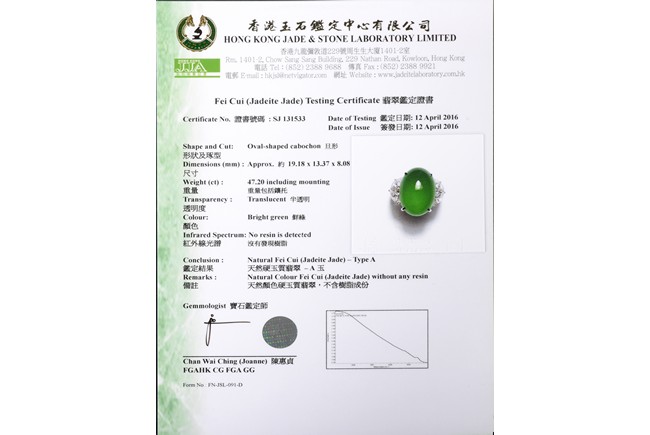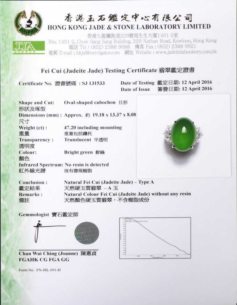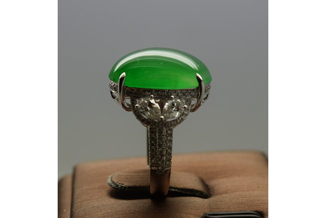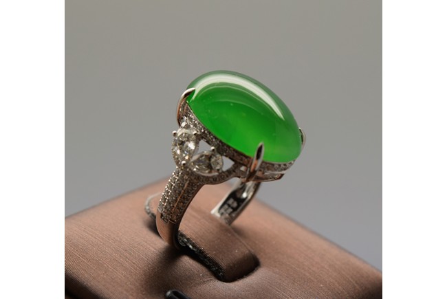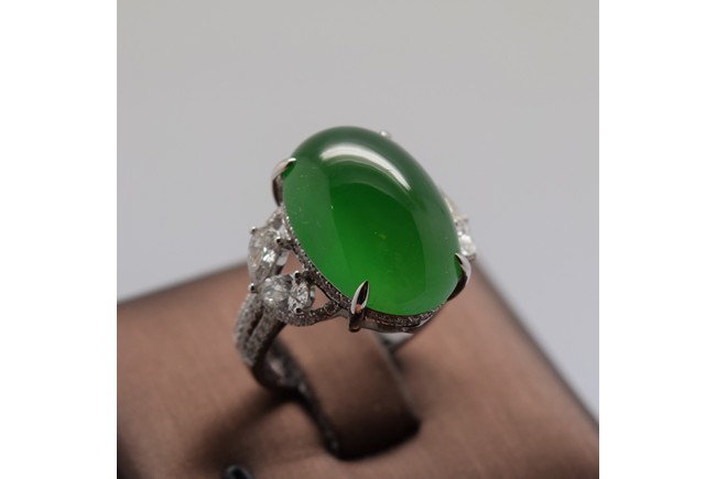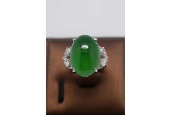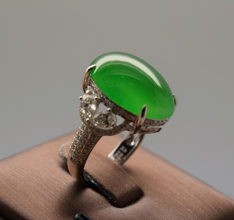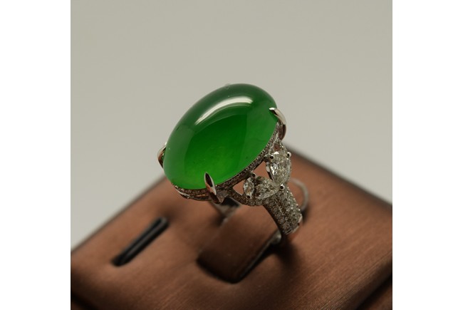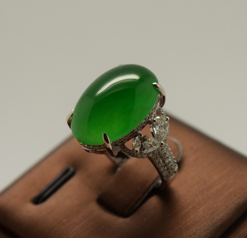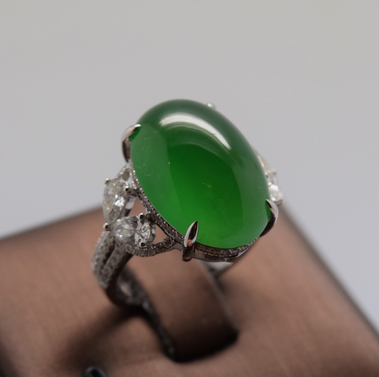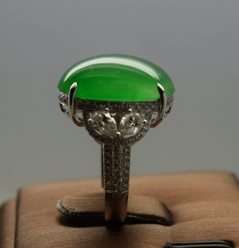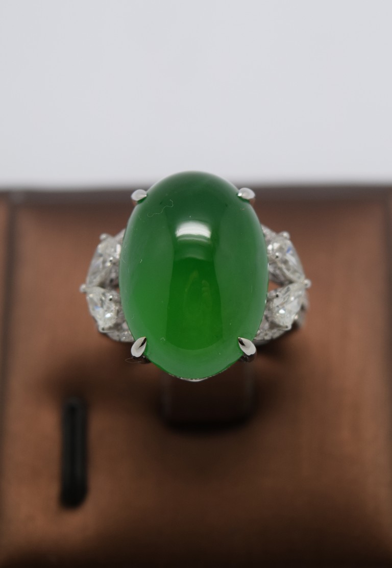 Set in 18K white gold and accented with 4 large pear shape diamond of VS clarity, as well as micro paved round diamond, this lady jadeite diamond ring is an true top quality bright green double cabochon measured at 19.18 x 13.37 x 8.08mm, with vibrant glowing luster from within. Accompanied by an Hong Kong Jade & Stone Lab certificate indicating natural Jadeite Jade Type an with no resin detected.