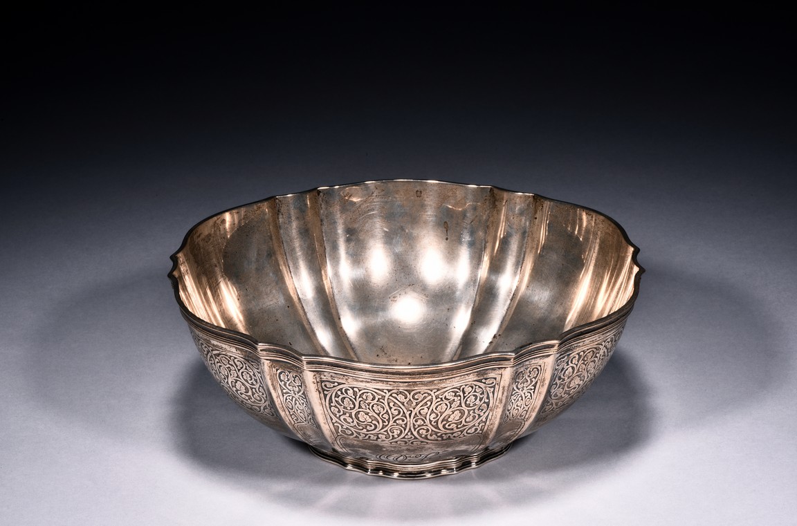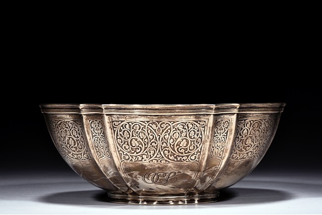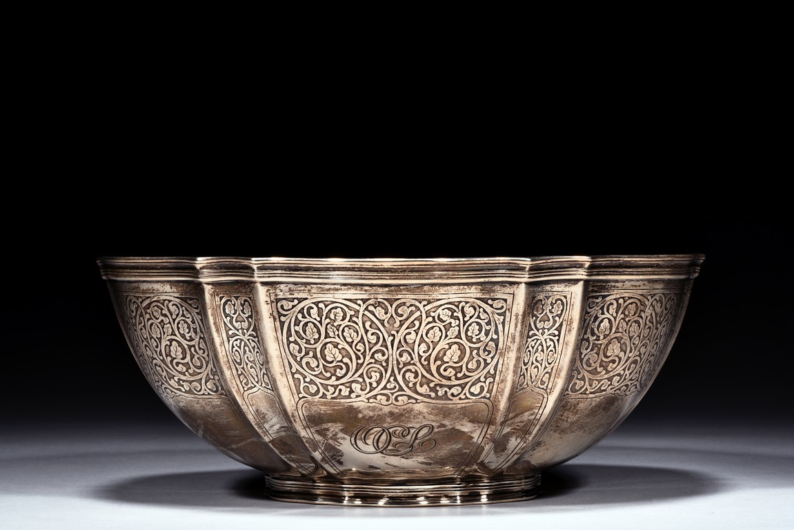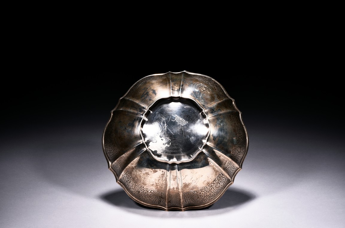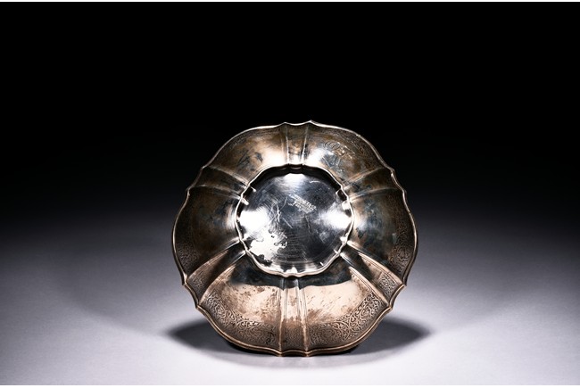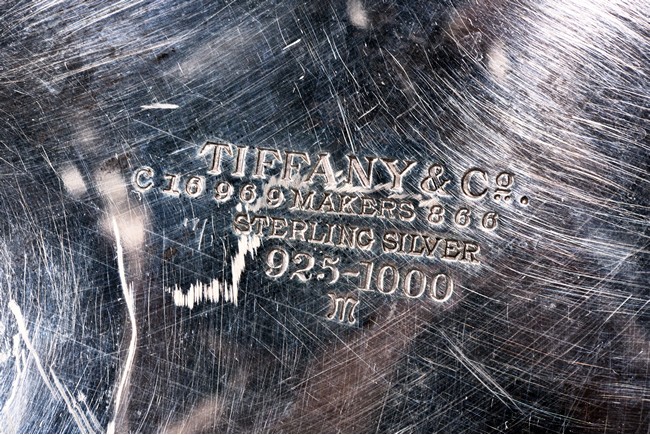 Of floriform from, the bowl intricately engraved with stylized foliate scroll decoration, the base bears mark Tiffany & Co. C 16969 Makers 866 sterling silver 925-1000.