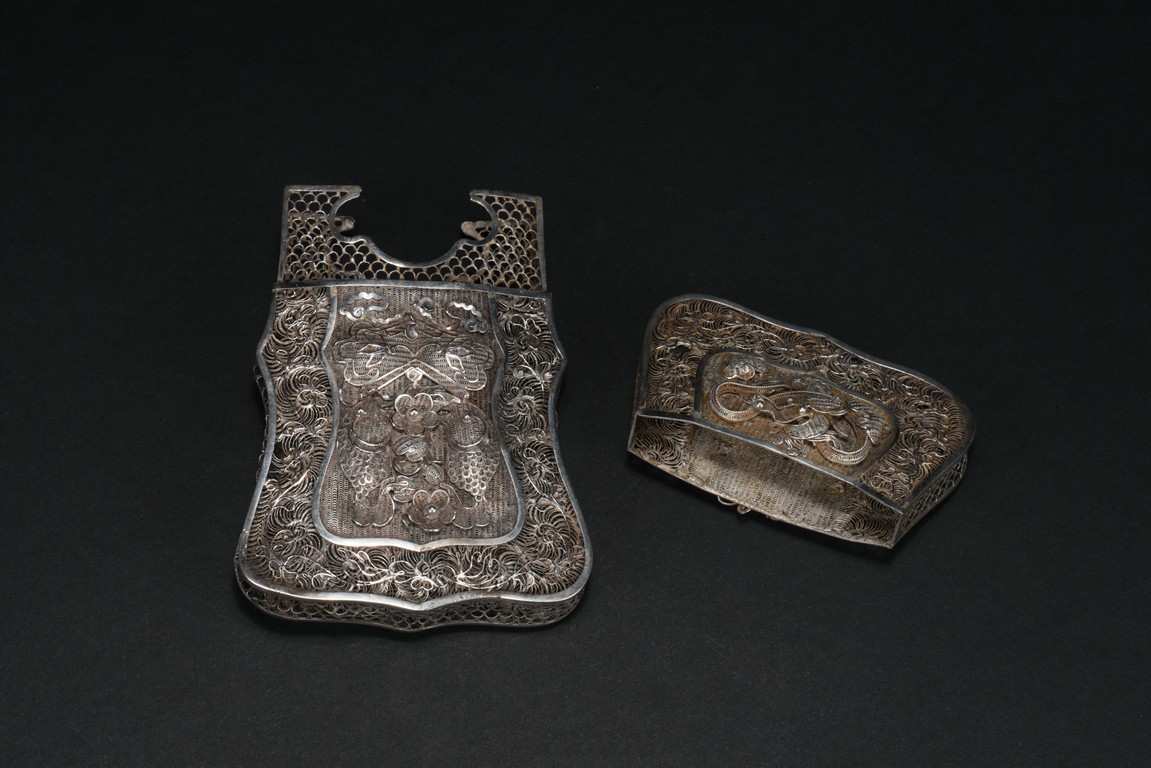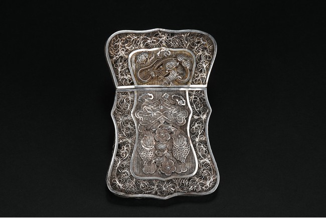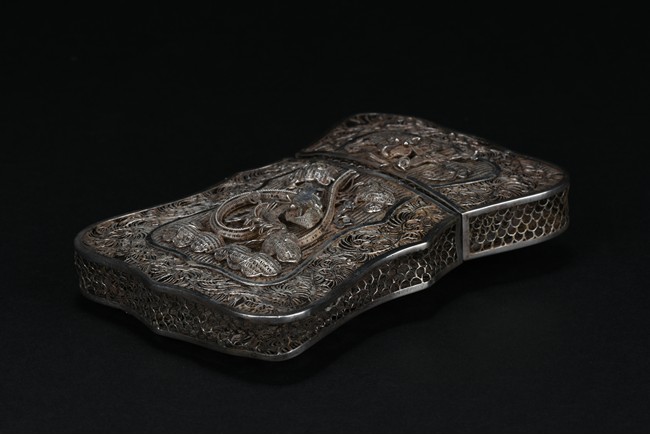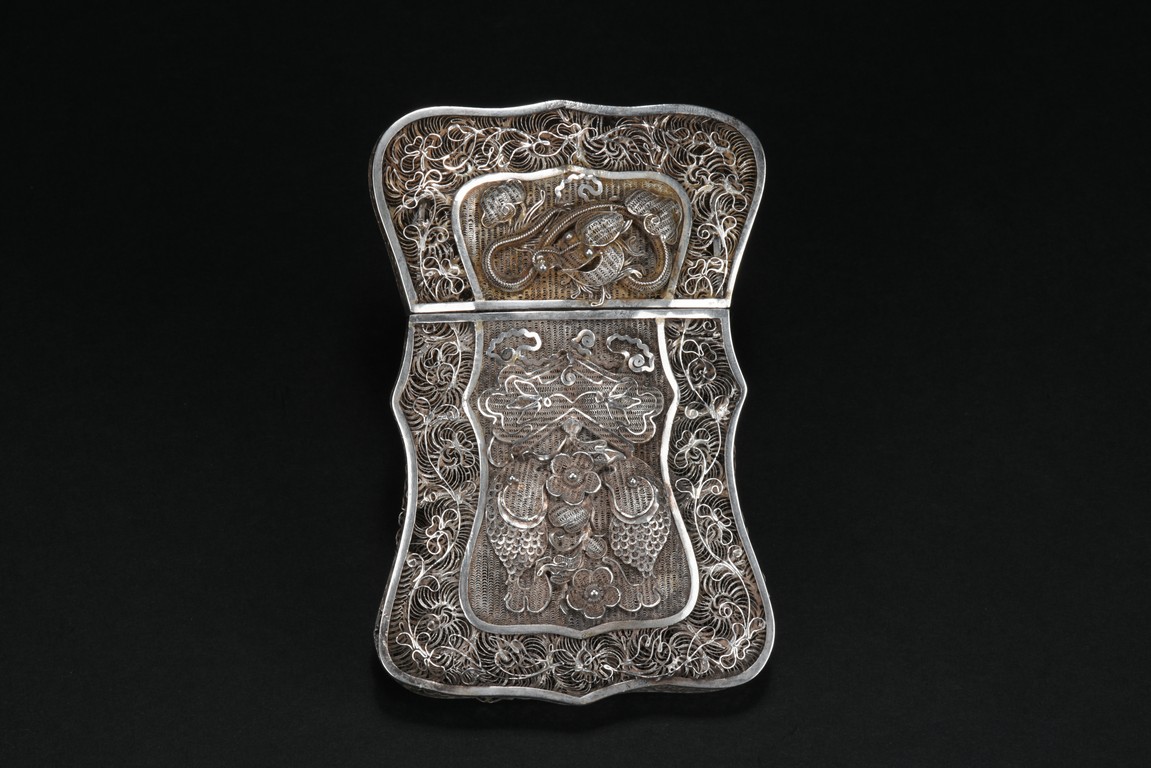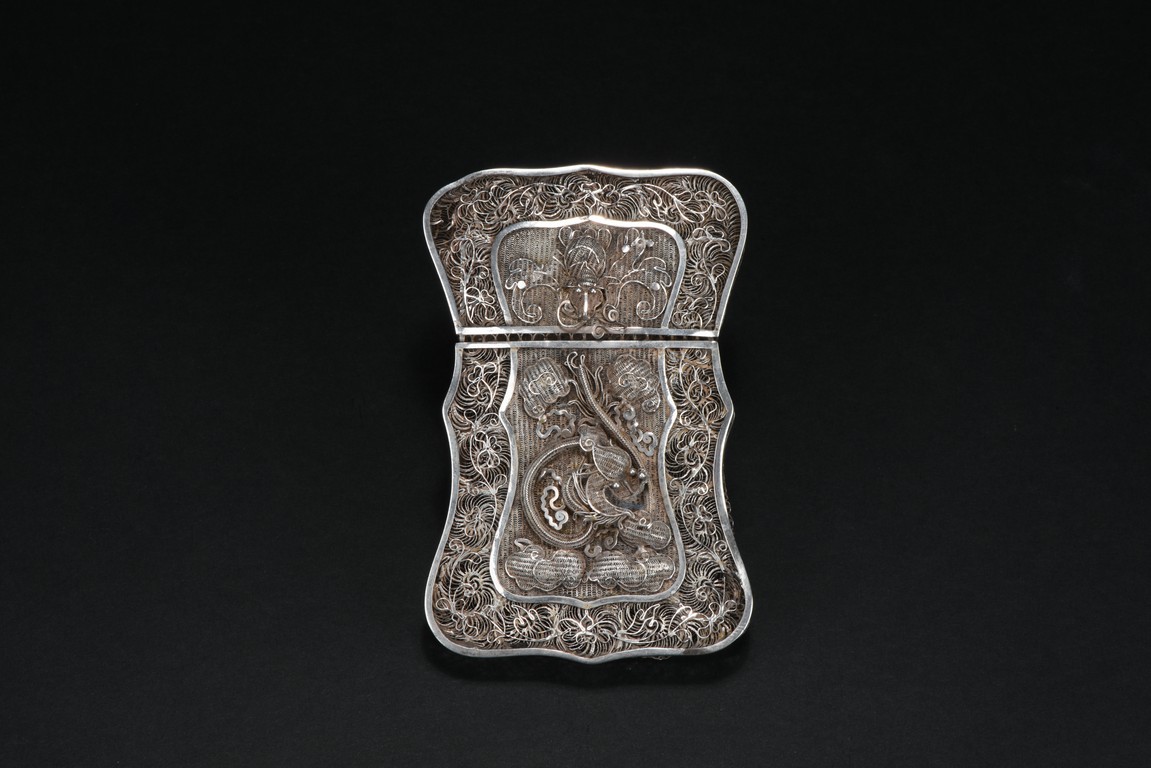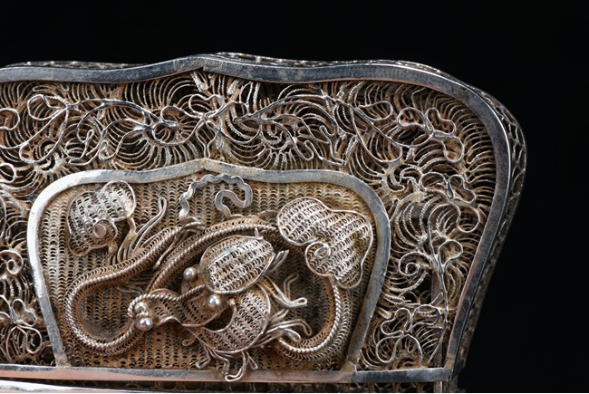 The case intricately worked with scrolled leafy flowers and dragon pattern in silver filigree. Republic period.