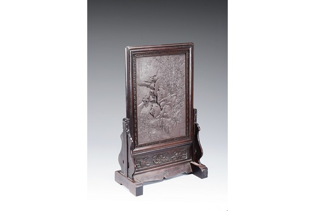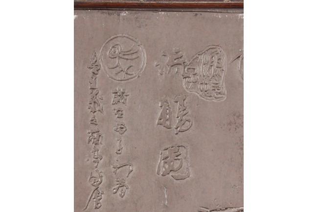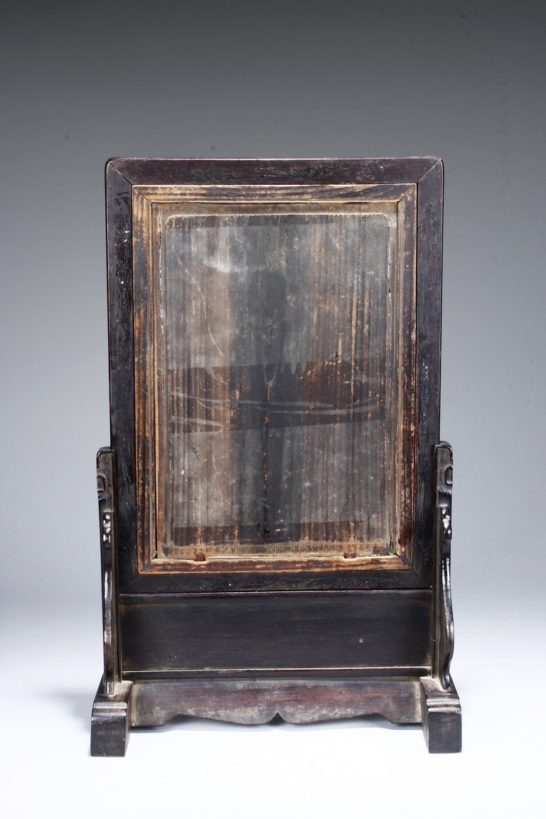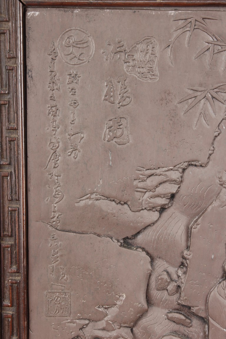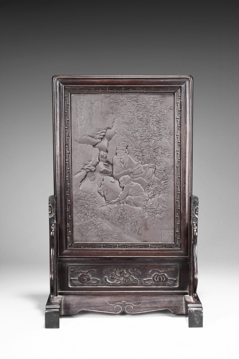 Of rectangular from, the Duan stone plaque depicts an elder and child in an riverside setting, resting near bamboo trees close to downstream , with poetry calligraphy and artist signature on top left, all enclosed in carved wooden frame, inset in original wooden stand, the front low relief carved with lotus flower and plants, the reverse in plain design. Qing Dynasty period.