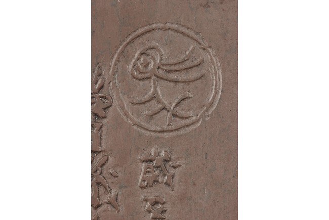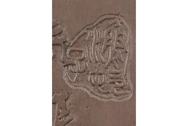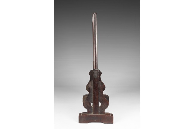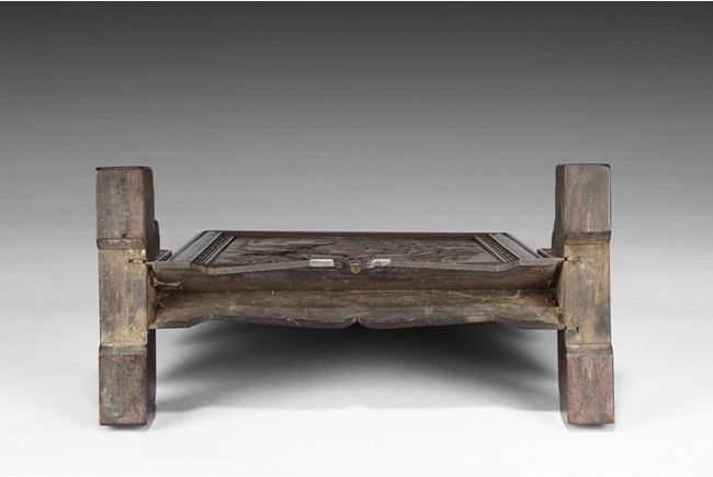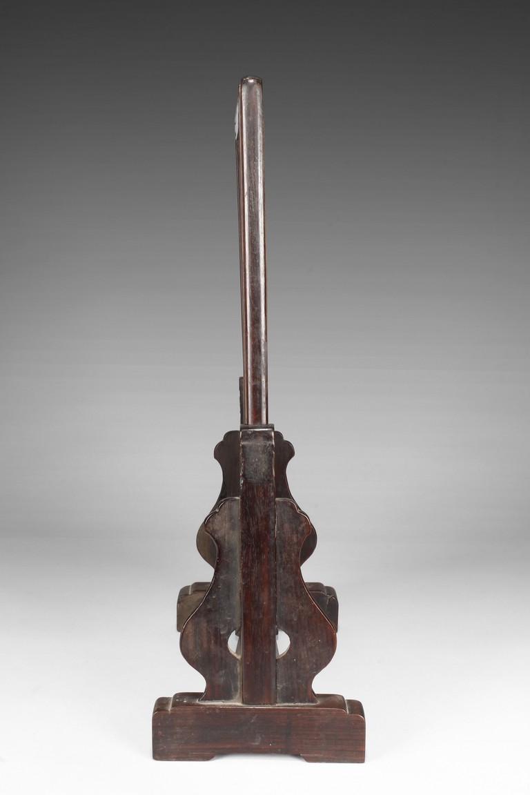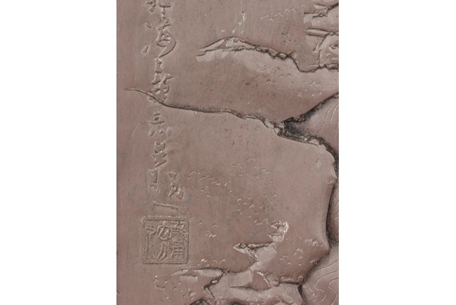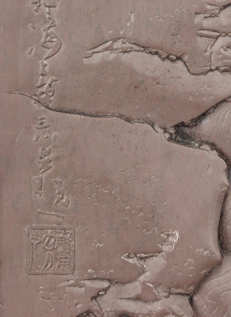 Of rectangular from, the Duan stone plaque depicts an elder and child in an riverside setting, resting near bamboo trees close to downstream , with poetry calligraphy and artist signature on top left, all enclosed in carved wooden frame, inset in original wooden stand, the front low relief carved with lotus flower and plants, the reverse in plain design. Qing Dynasty period.