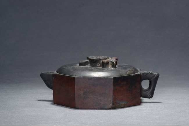 Of octagonal form, the teapot inkstone is carved with plum as finial, with short rectangular spout, bamboo formed handle, the body with fine patina. Qing Dynasty period.