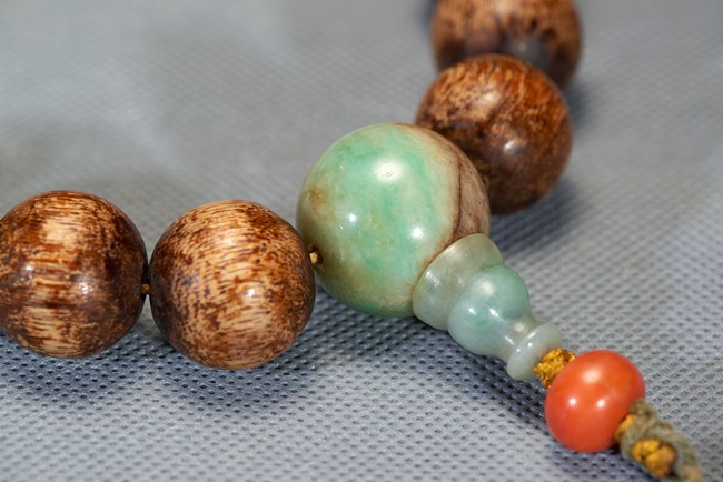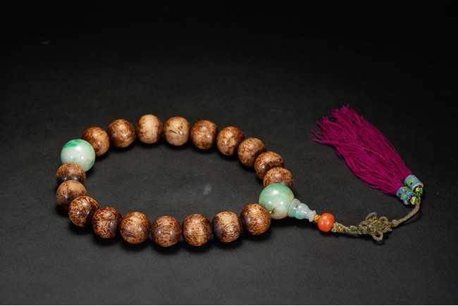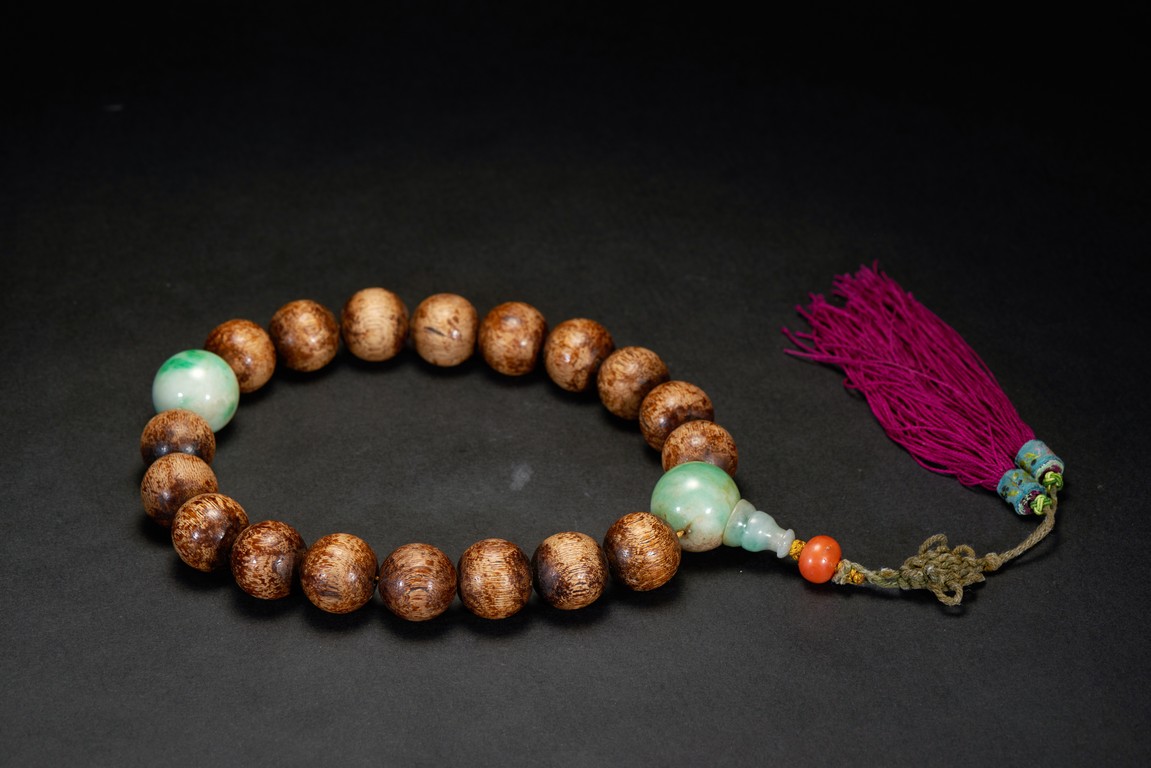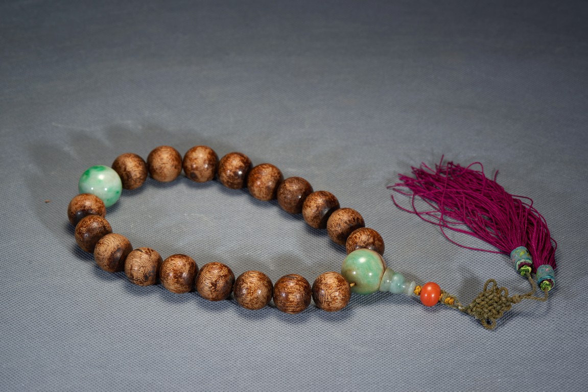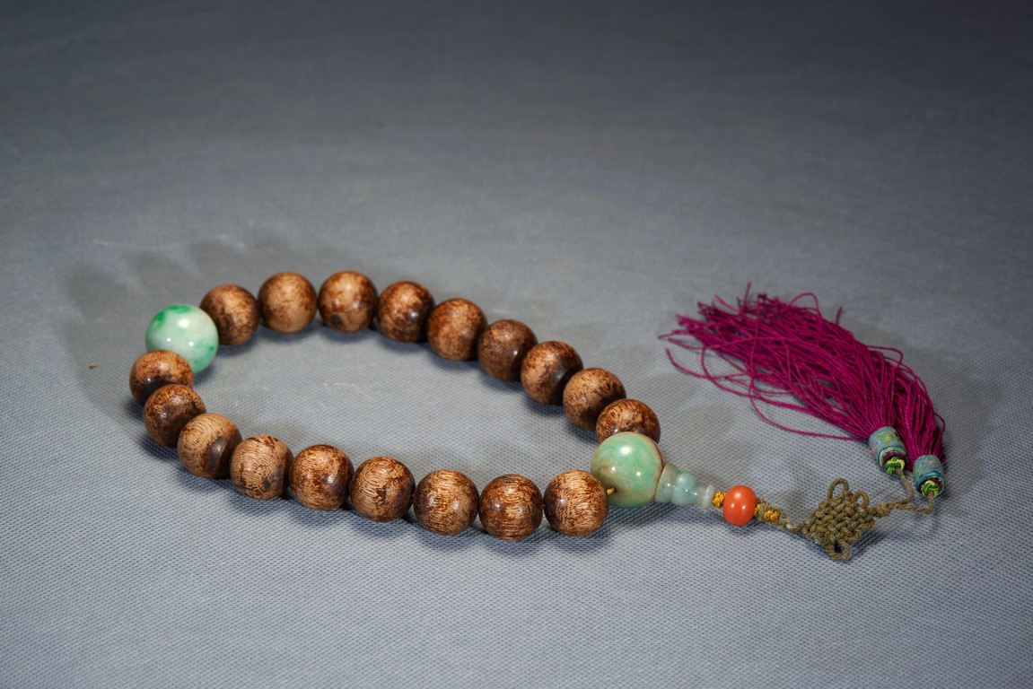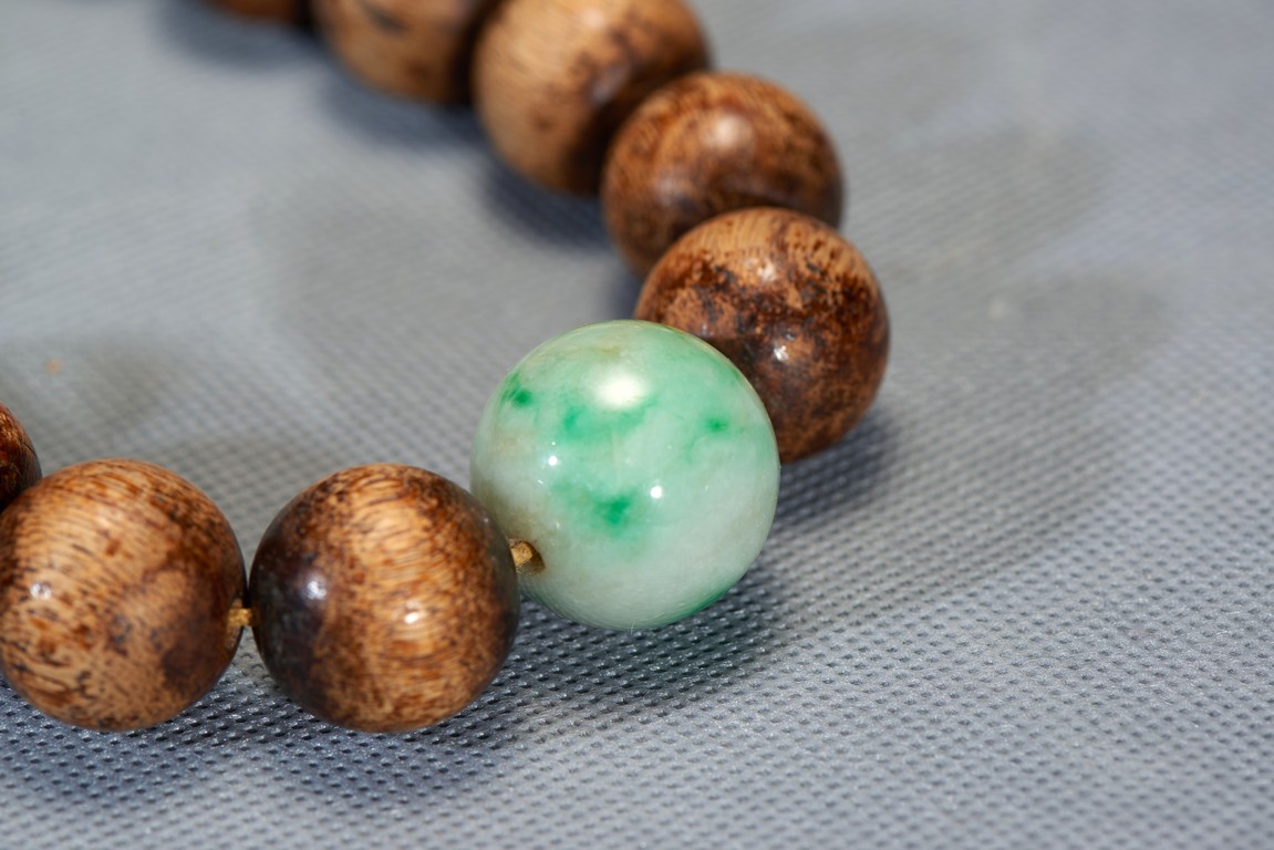 Comprising of 18 agarwood beads and in the middle spaced out with two jade beads, all are of rounded from and similar size. Qing Dynasty period.