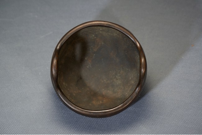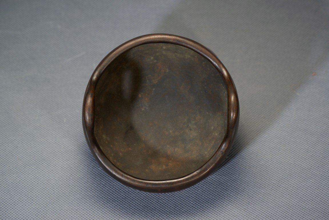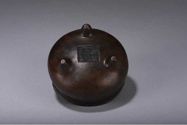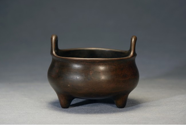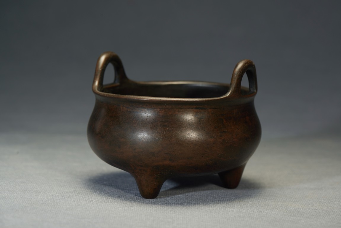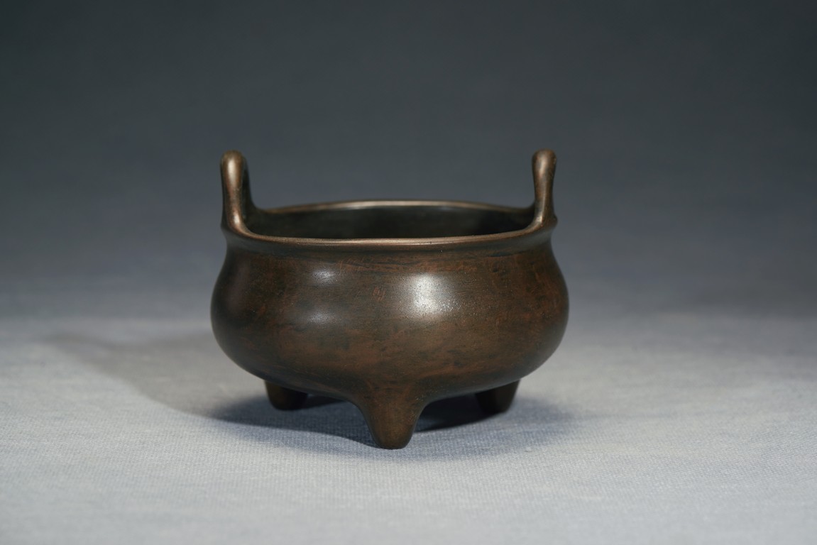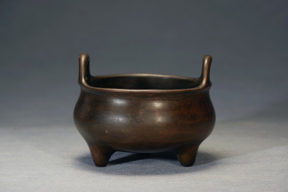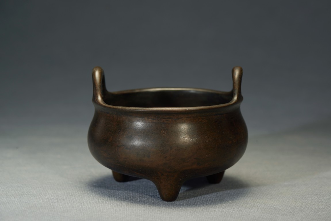 Raised on three tapering feet, the censer is of compressed globular form and the sides on the mouth rim surmounted with two upright arched handles, the base bears six character 'DA MING XUAN DE NIAN ZHI' mark. Qing Dynasty period.