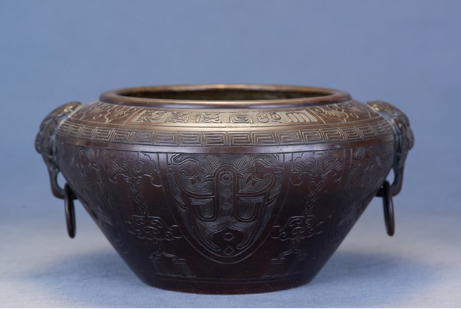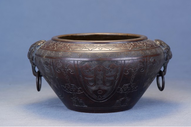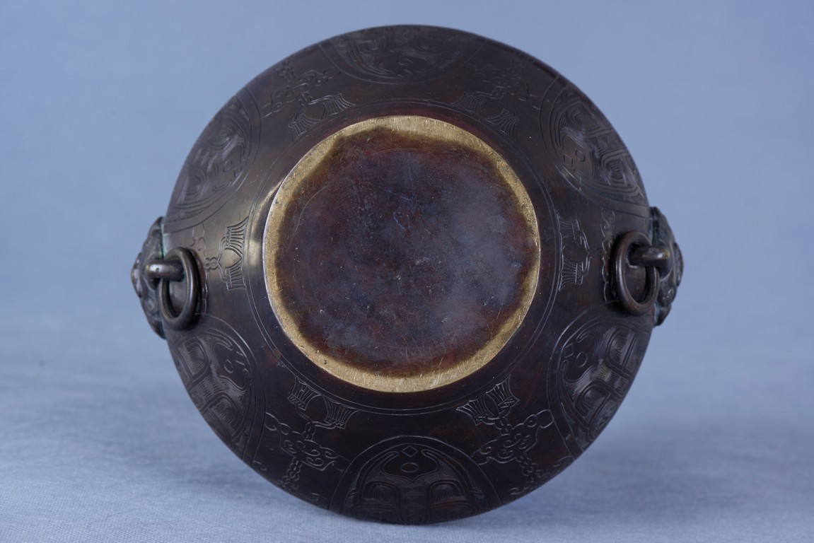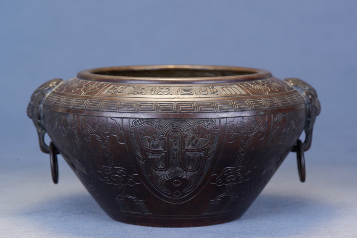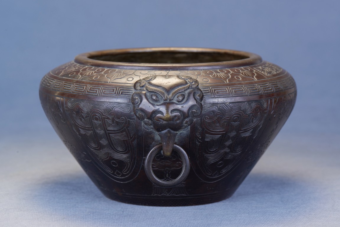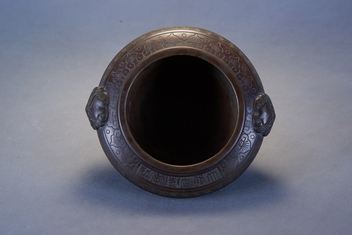 Of compressed globular form with an incurved mouth, the exterior deeply incised with stylized ram head and beast shape patterns around the body, all set below an band of carved ruyi pattern and of key-fret pattern. The shoulders set with an pair of lions clutching loose ring handles. Qing Dynasty period.