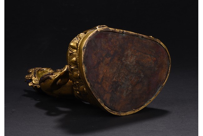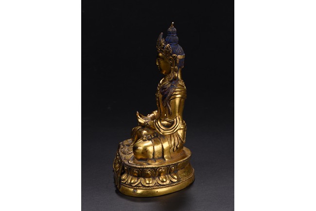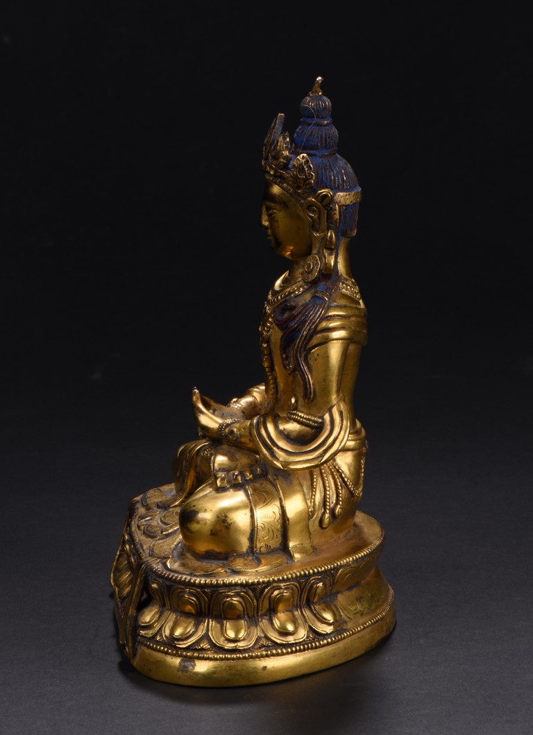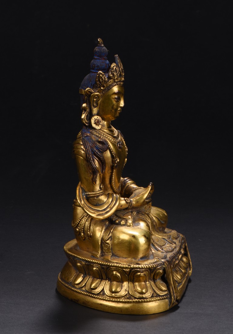 Seated in dhyanasana on an double-lotus base, the hems of his voluminous dhoti incised with an foliate motif adorned with an flowing sash over both arms, an elaborate beaded belt and various necklaces, the face with downcast eyes flanked by lotus earrings and flowing ribbons surmounted by an jeweled tiara, the hair pulled into an high chignon, the base sealed with an double-vajra. Qing Dynasty period.