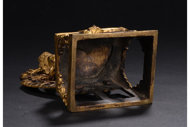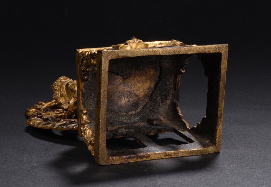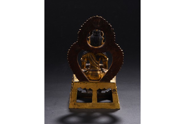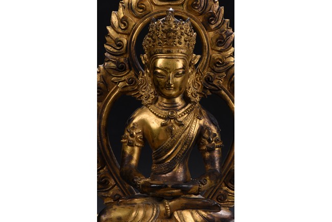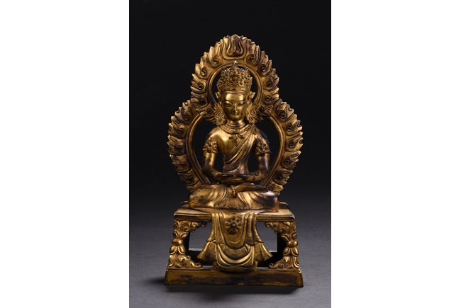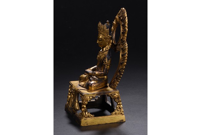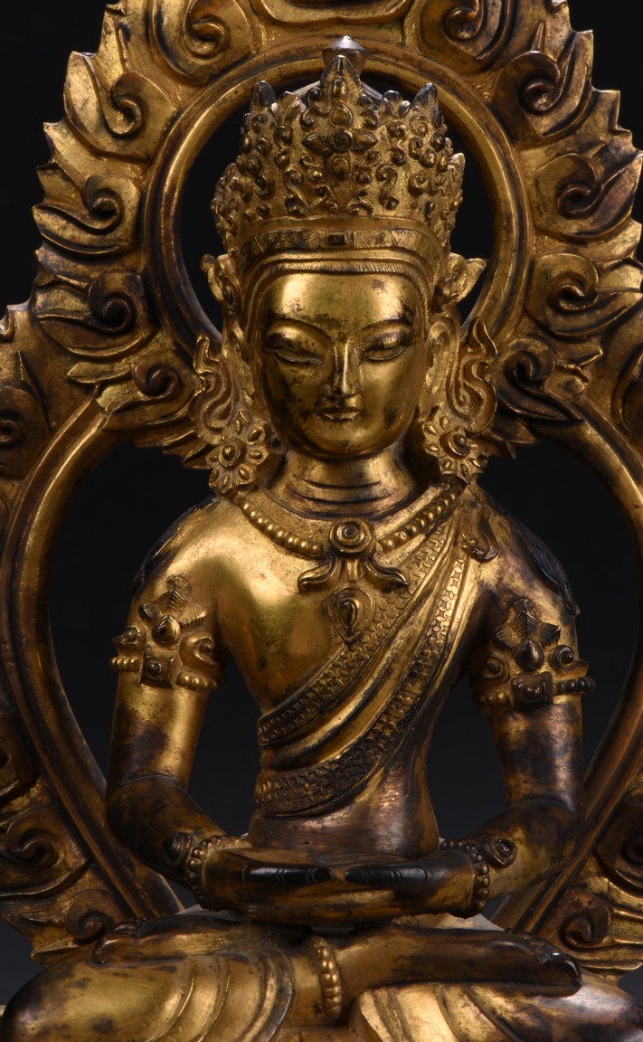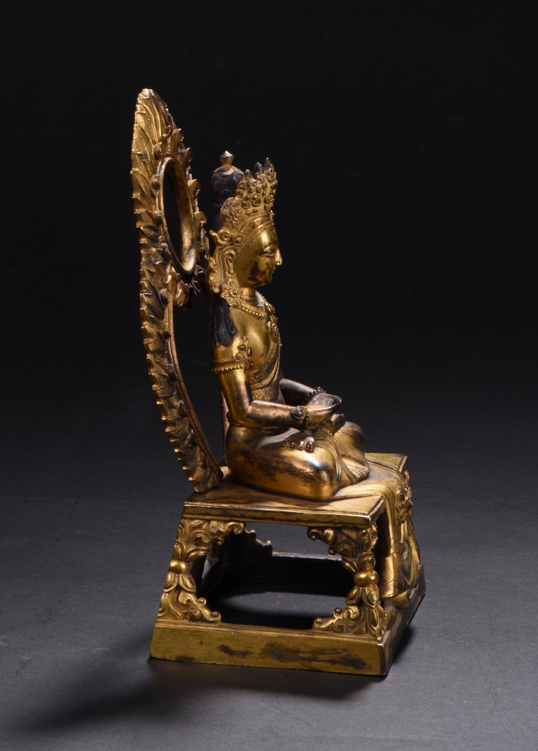 Shown seated in dhyanasana on an rectangular plinth, front draped in long cloth with flower head at center, the figure dressed in robes draped over the left shoulder leaving the right exposed and wearing an jeweled necklace, the face with serene expression beneath hair pulled up into an elaborate coiffure and fronted by an five-leafed tiara, surrounded by an flaming mandorla. Qing Dynasty period.