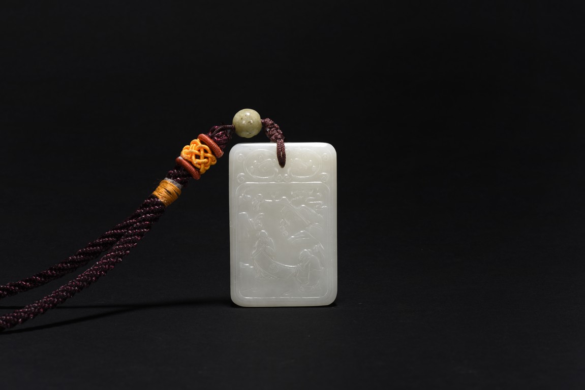 Of rectangular form, one side finely carved in shallow relief with two elderly gentlemen appreciating an scroll painting under a pine tree, the reverse carved with poem.