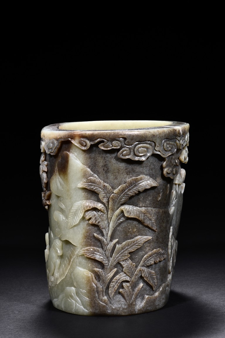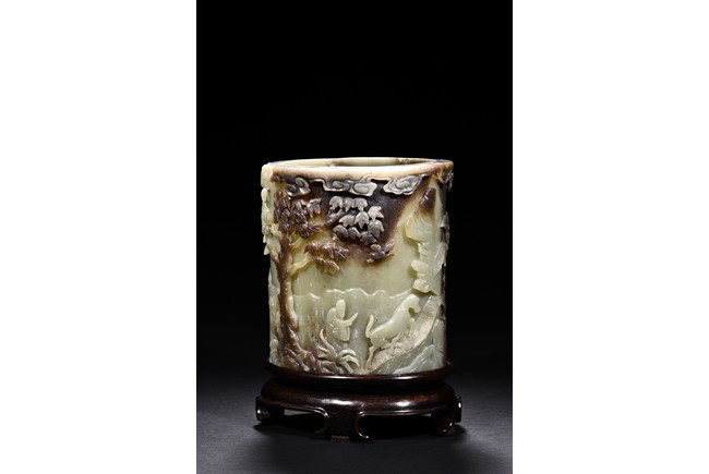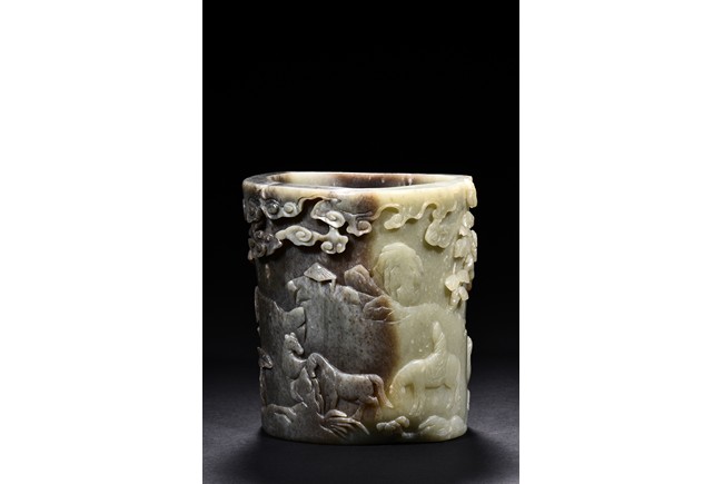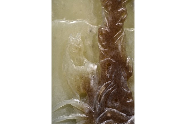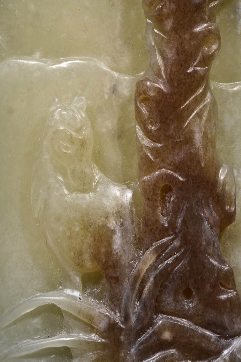 Of irregular round section, the exterior carved in relief with an elderly man and an horse walking on an narrow path, the other side carved with an scholar sitting upon an horse and two horses ahead of him, all in a deep mountain setting, with various trees issuing from rocky outcrops, mountains in the background, and auspicious clouds above. The stone is of overall greenish celadon tone with large areas of greyish brown tone. Accompanied with a hardwood stand. Qing Dynasty period.