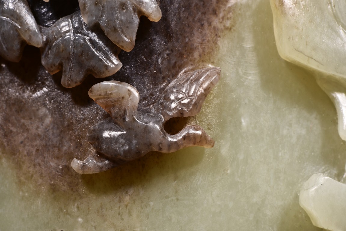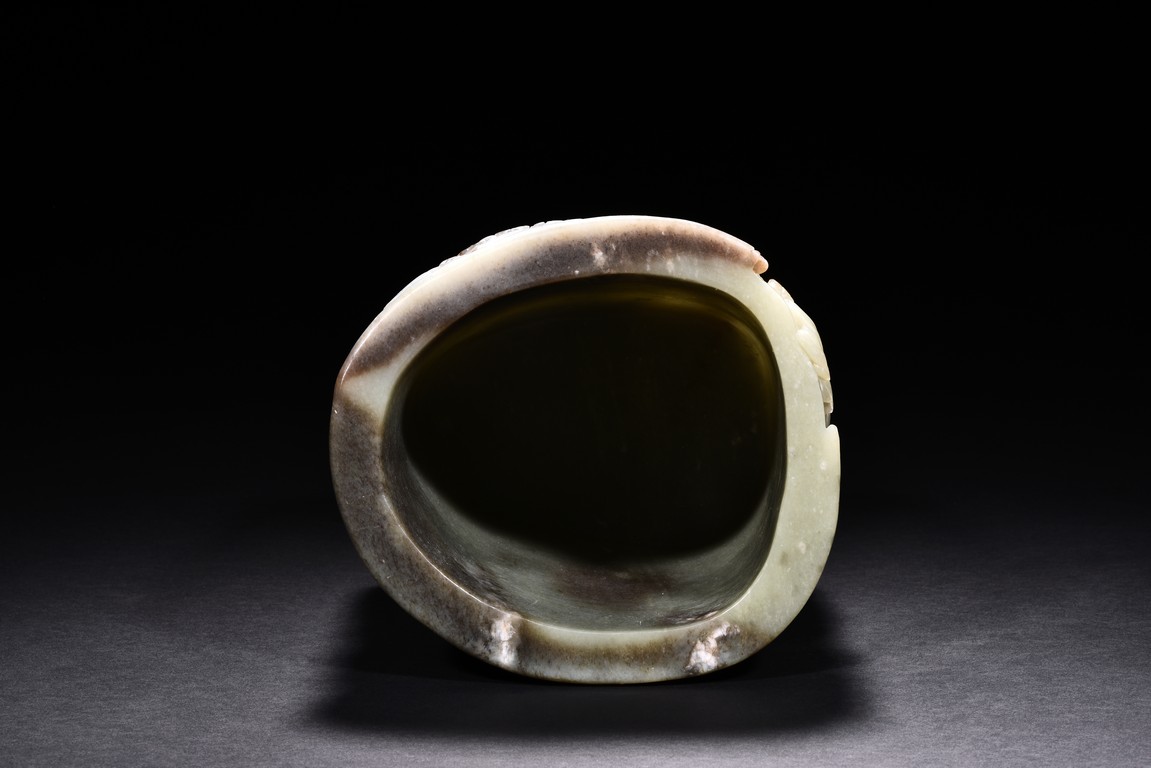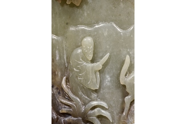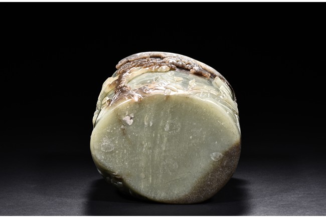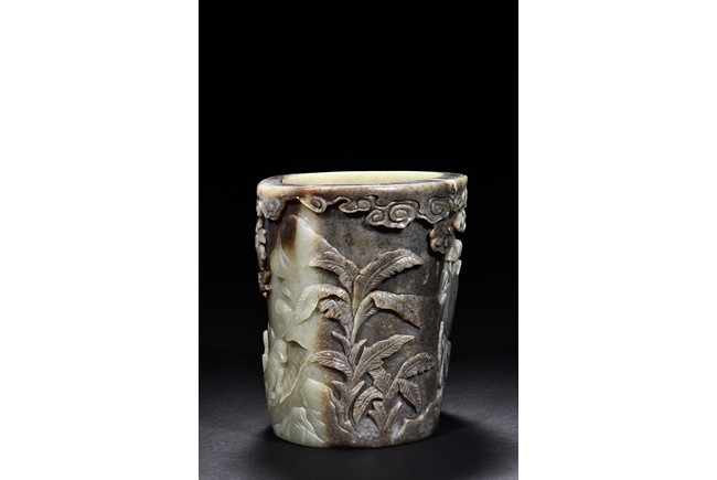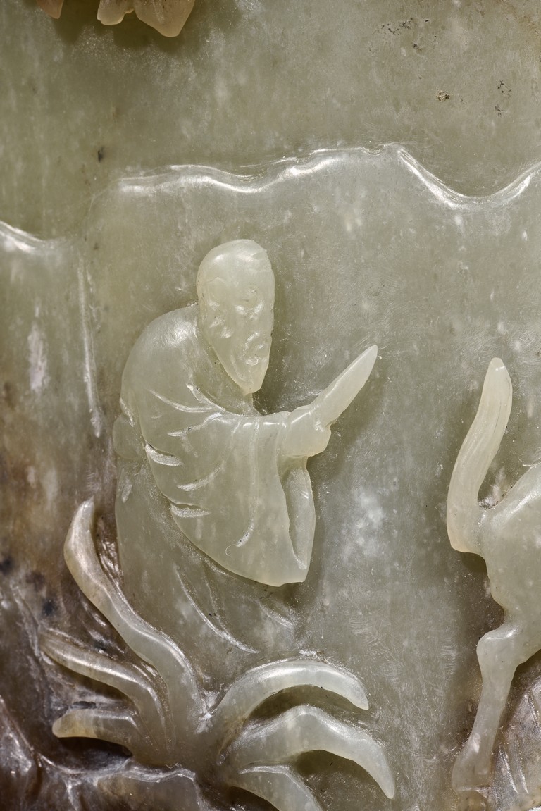 Of irregular round section, the exterior carved in relief with an elderly man and an horse walking on an narrow path, the other side carved with an scholar sitting upon an horse and two horses ahead of him, all in a deep mountain setting, with various trees issuing from rocky outcrops, mountains in the background, and auspicious clouds above. The stone is of overall greenish celadon tone with large areas of greyish brown tone. Accompanied with a hardwood stand. Qing Dynasty period.