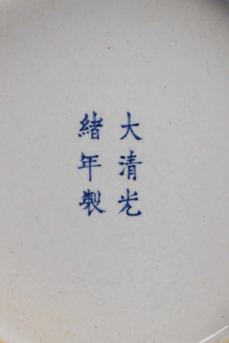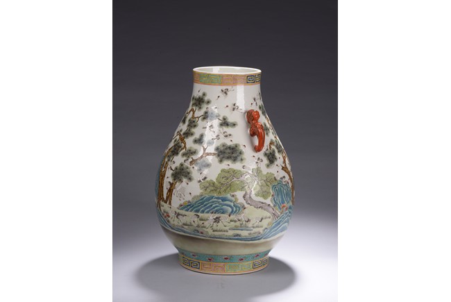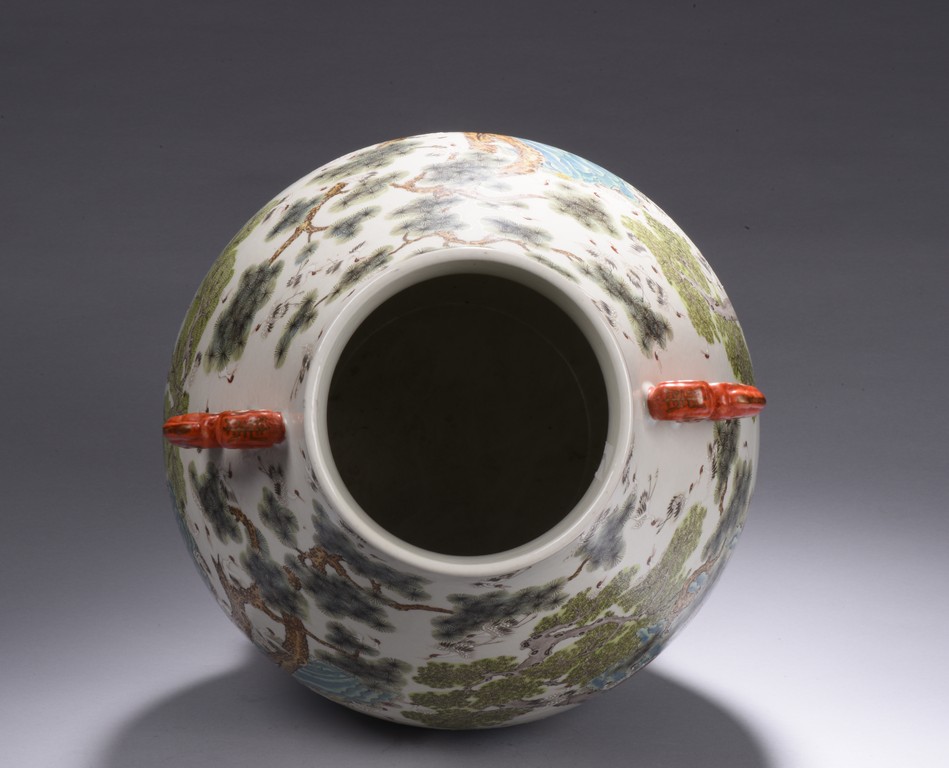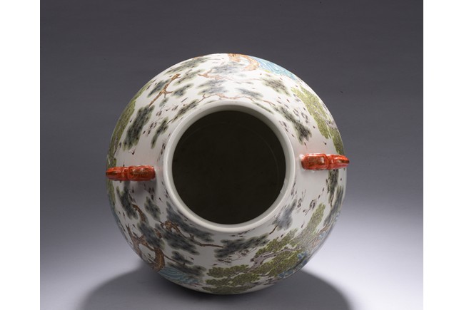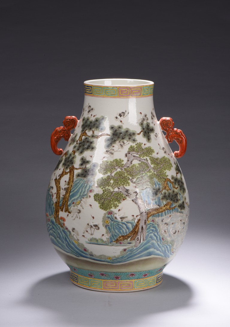 Of bulbous from, the vase's wide and round body supported by straight ring foot, with two lingzhi handles attached to the side, the body painted with an scene of hundred cranes in the vicinity of pine trees, mountains, and rivers, all between scrolling key-fret patterns on top and flower patterns on bottom.The base bears an six character 'DA QING GUANG XU NIAN ZHI' mark. Late Qing Dynasty period.