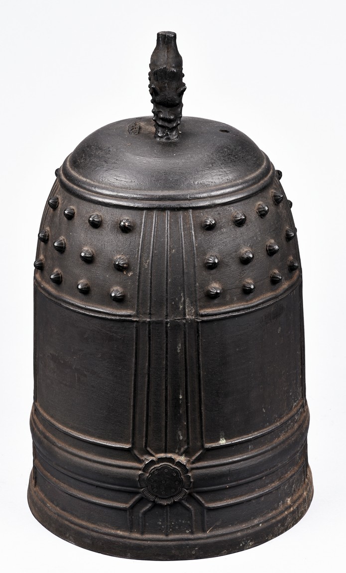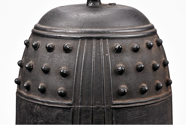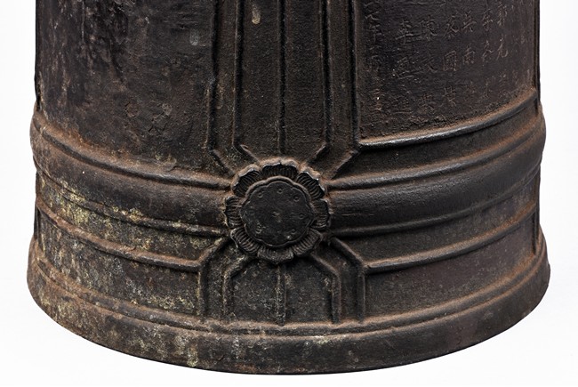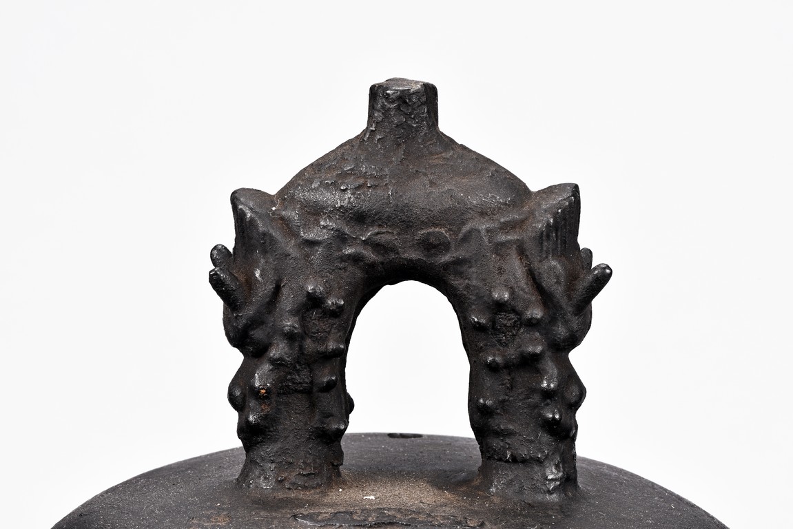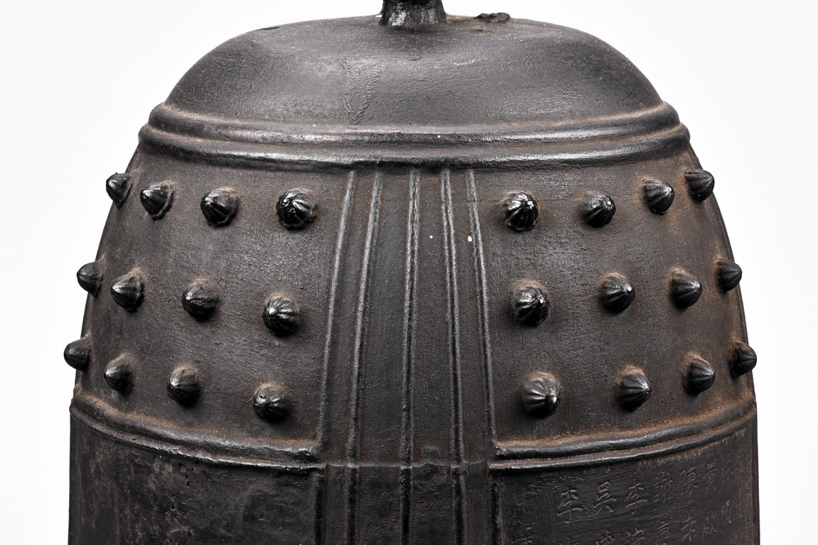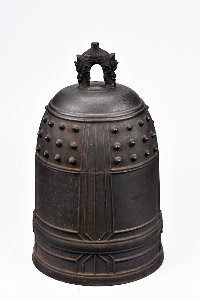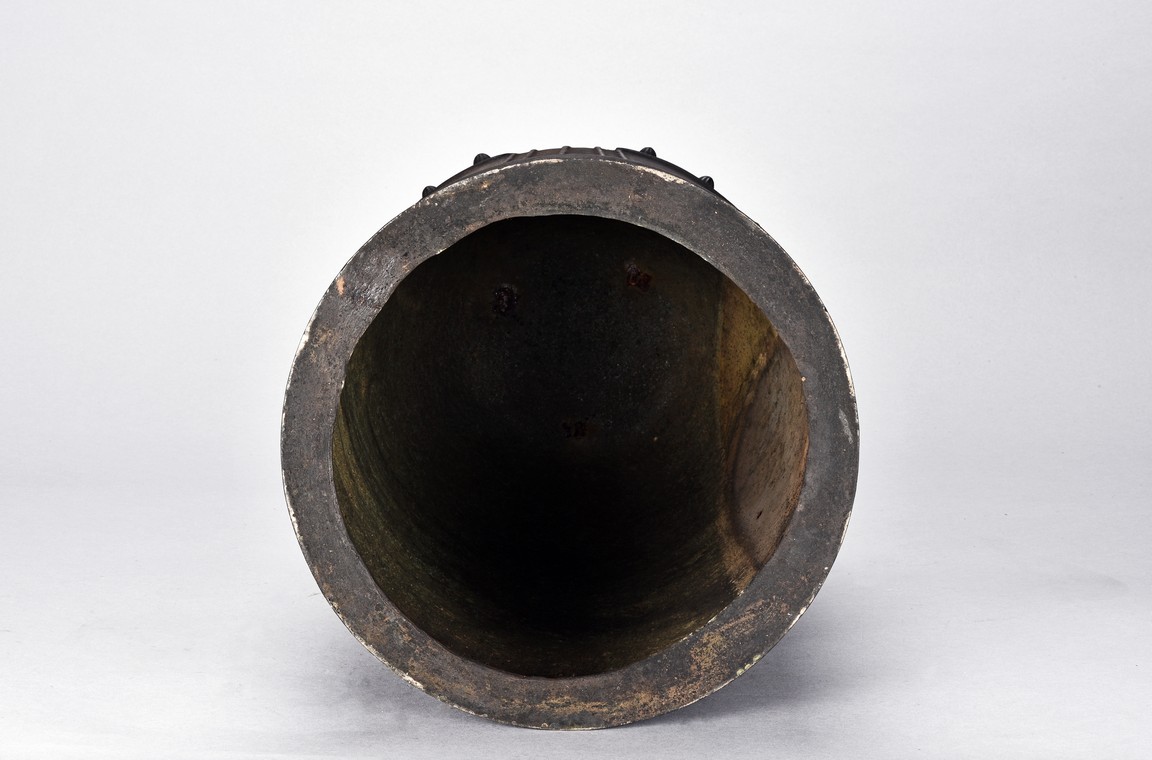 Cast with an double mythical beast loop handle, the deep sides slightly flaring, the body decorated with raised stubs and incised with names of donors for establishment of an Buddhist temple. Republic period.
