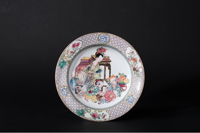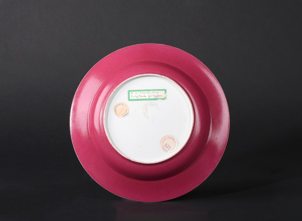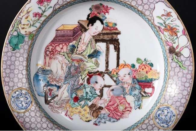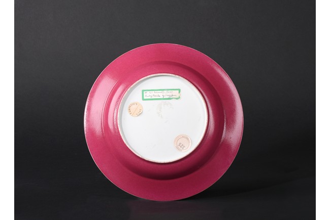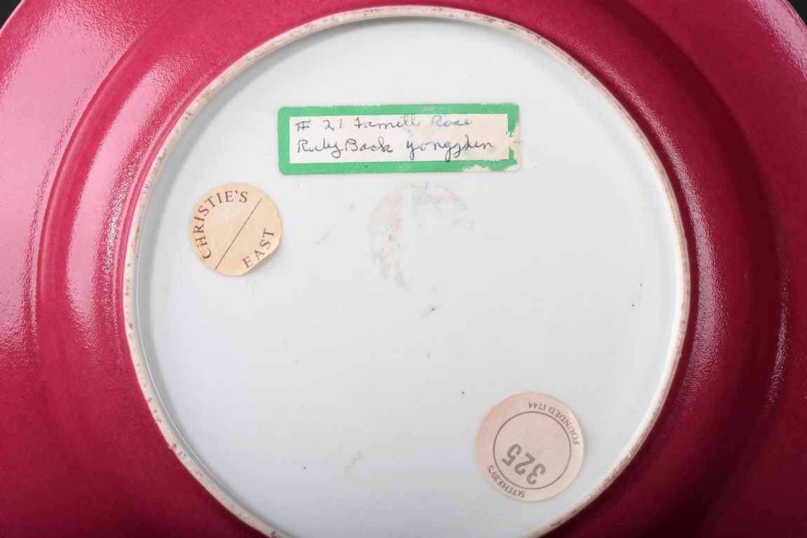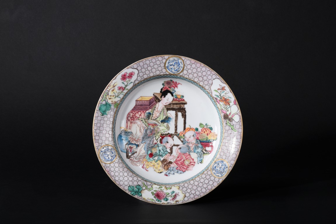 The dish elaborately painted with a scene of lady and his three boys in an interior setting with garden seats and bamboo table, all within a blue ground floral band beneath floral diaper band on the inverted rim with fruit and flower shaped floral reserves interrupted by dragon roundels, the reverse covered in rich ruby red enamel. Qing Dynasty Yongzheng period.