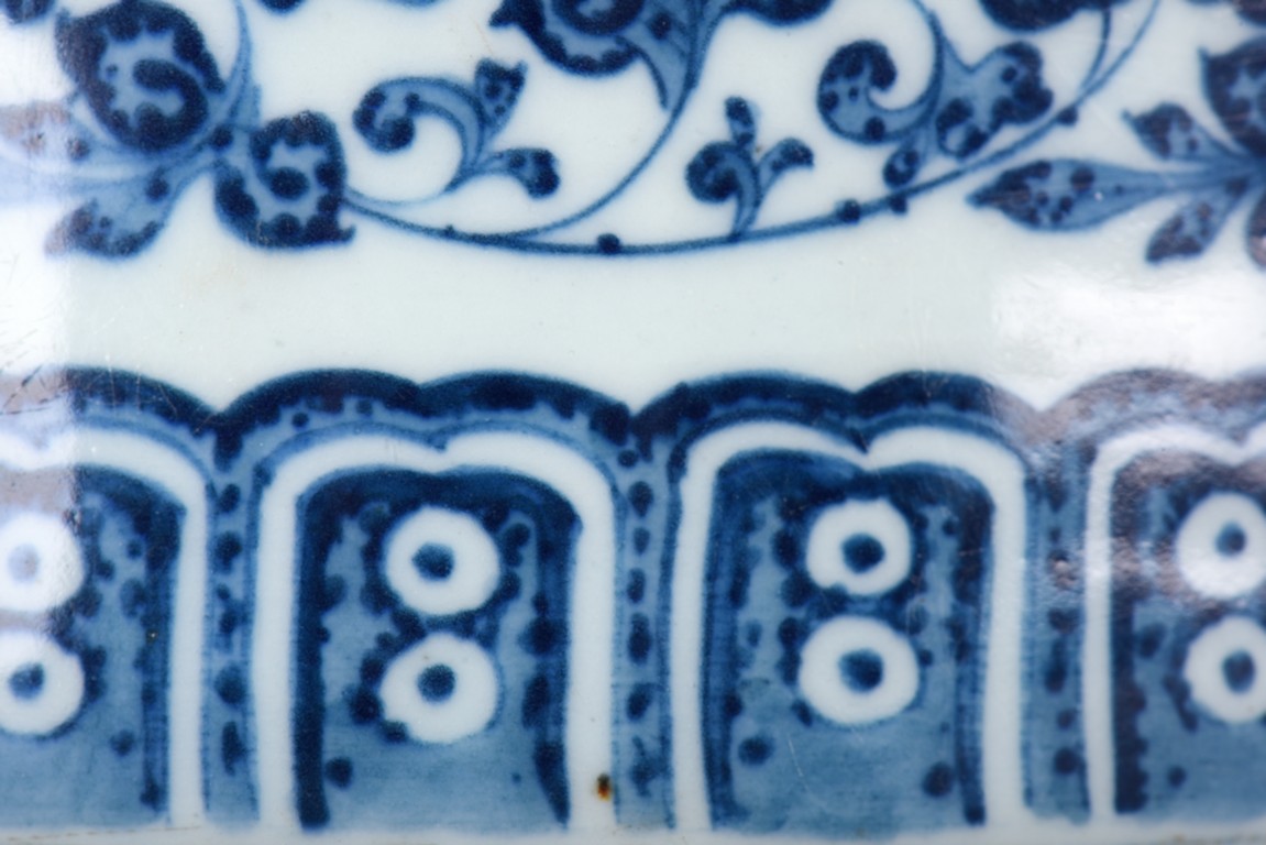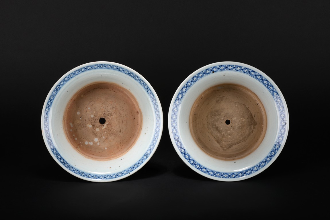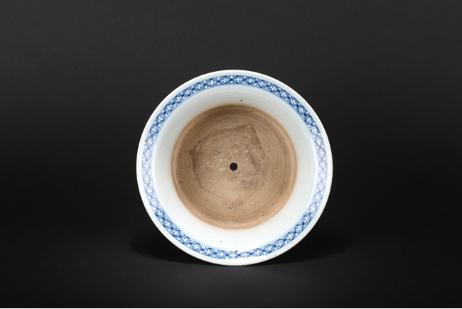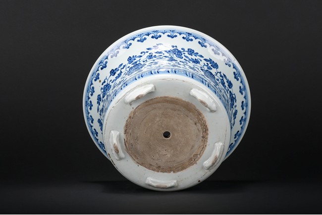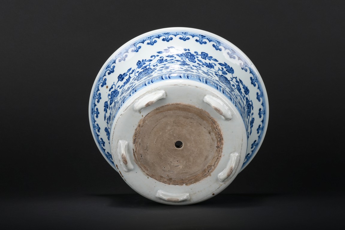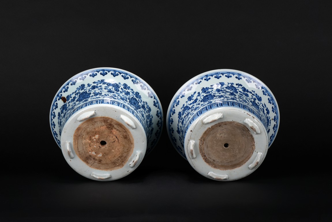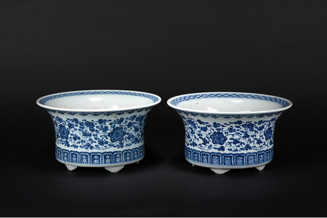 Each supported on five stub feet, the body rising to widely flared mouth rim, exterior finely painted in cobalt-blue with scrolling lotus flower pattern. Qing Dynasty period.