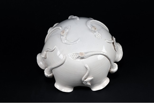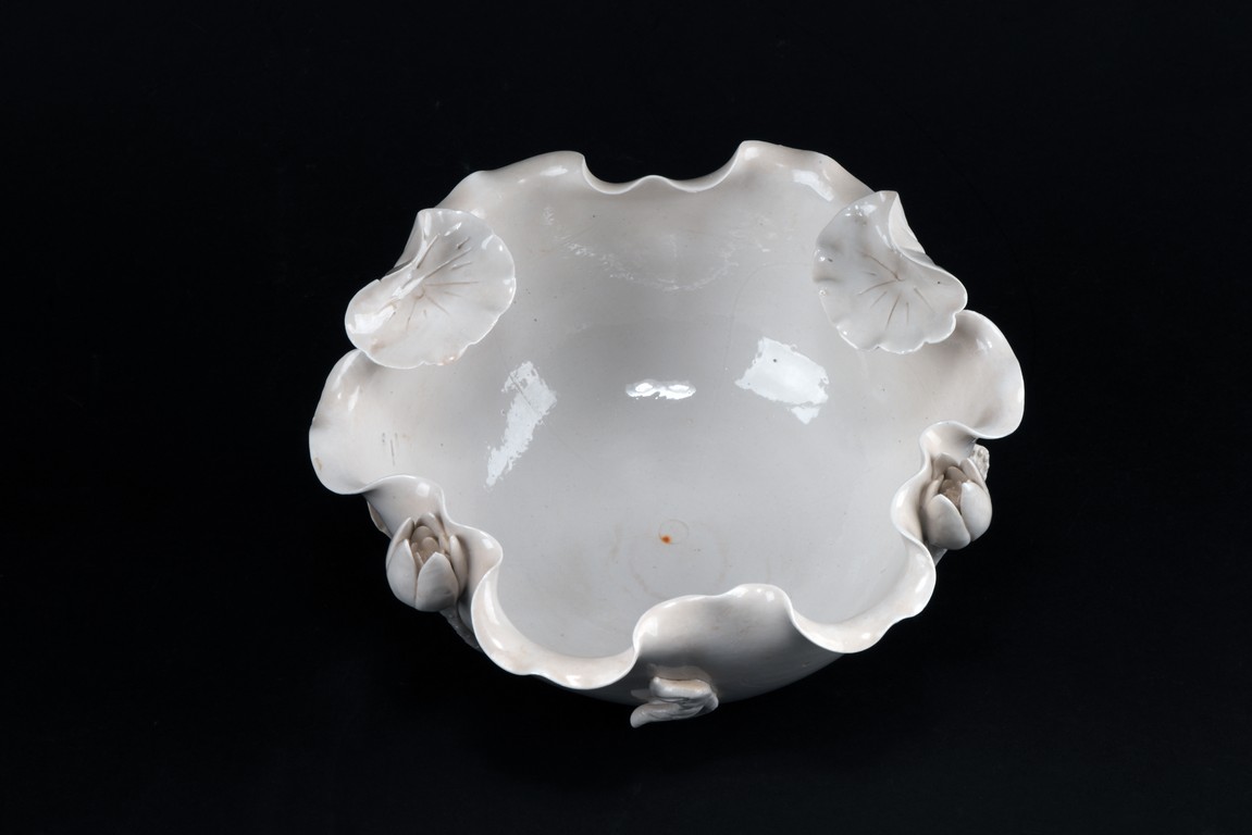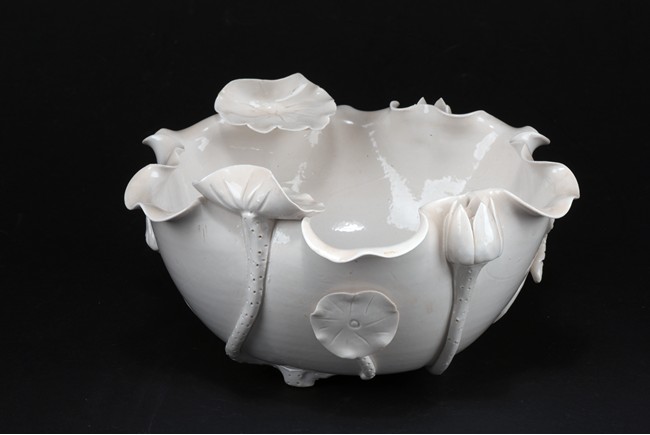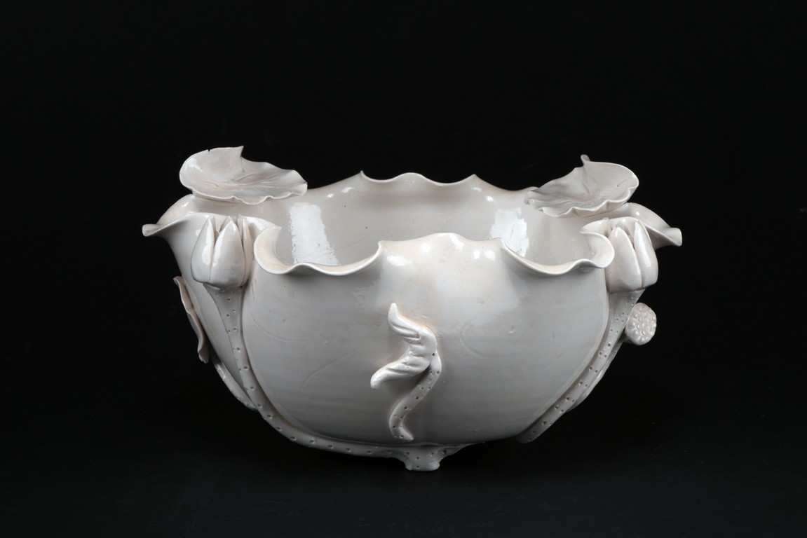 Modelled in the form of lotus leaf with irregular mouth rim, the body is moulded with lotus buds and leaves in relief. Accompanied with an fitted hardwood stand. Qing Dynasty period.