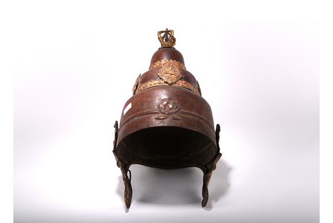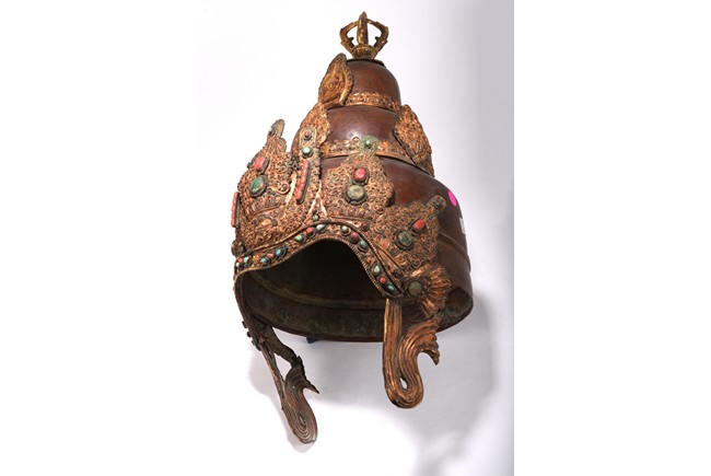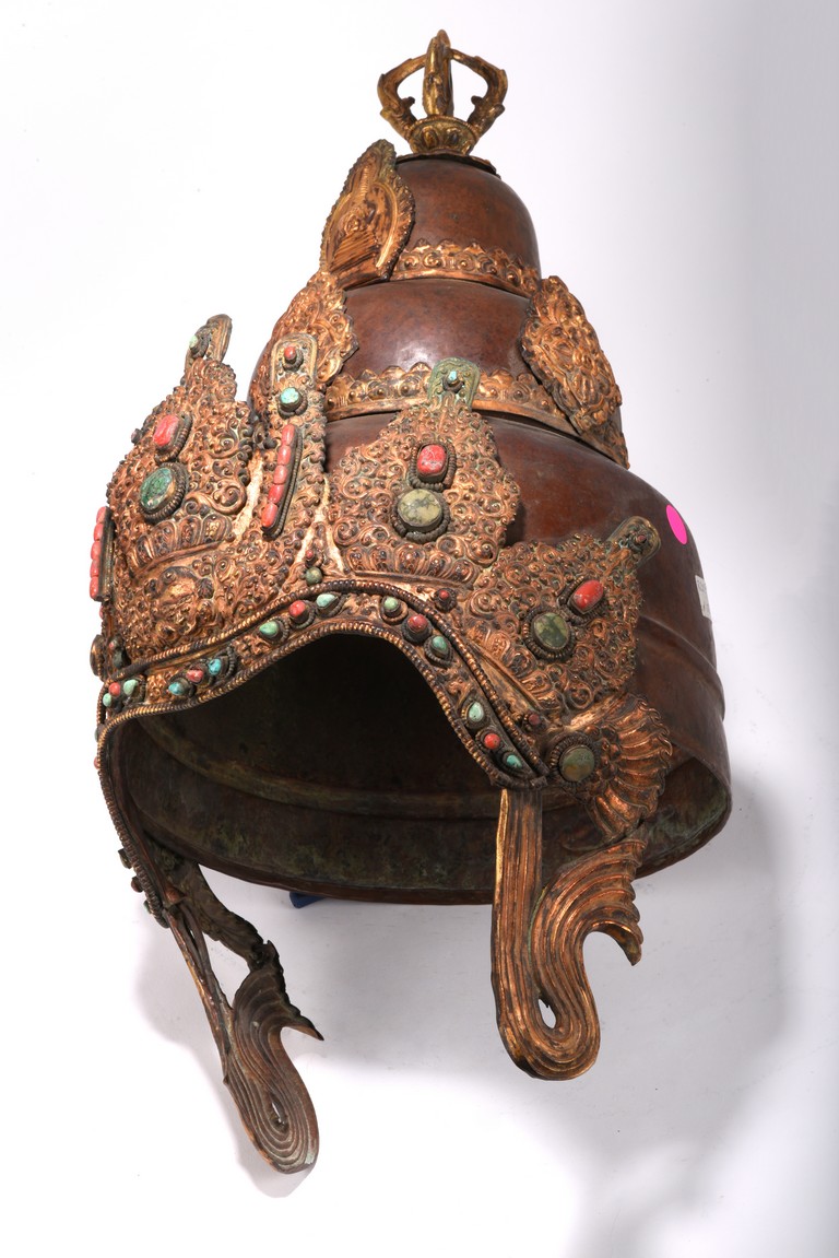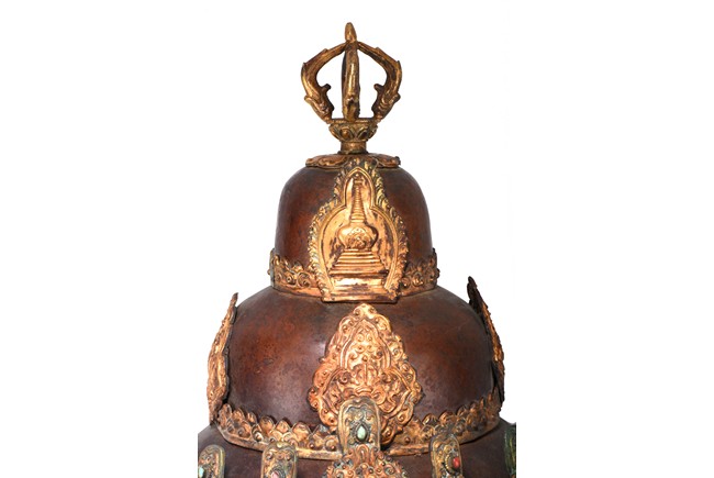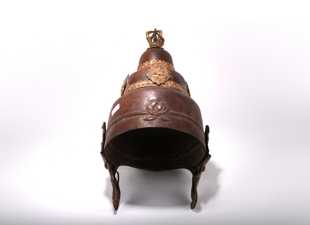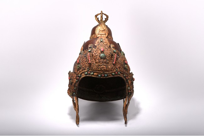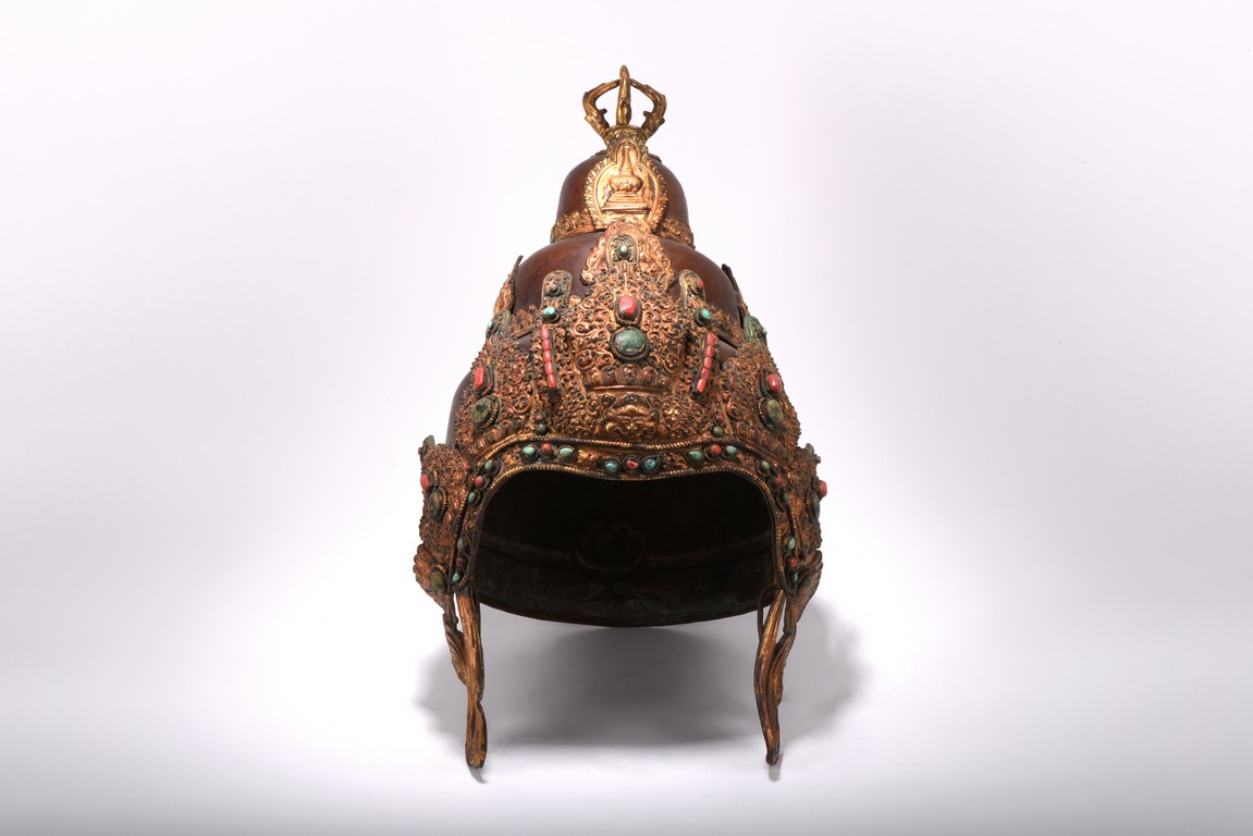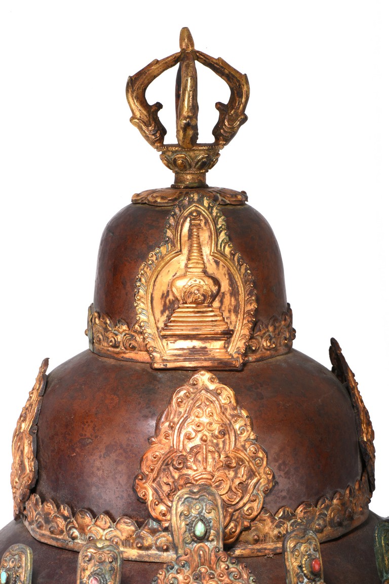 Partially gilt bronze, inlaid with turquoises and coral beads on gilt-bronze repousse, topped with an double vajra. This richly decorated Tibetan arcaya ritual helmet was probably the property of an tantric master. Qing Dynasty period. 19th century.