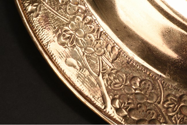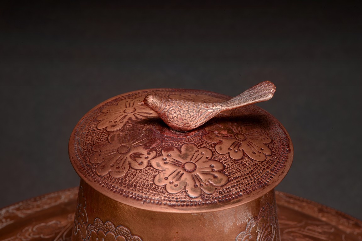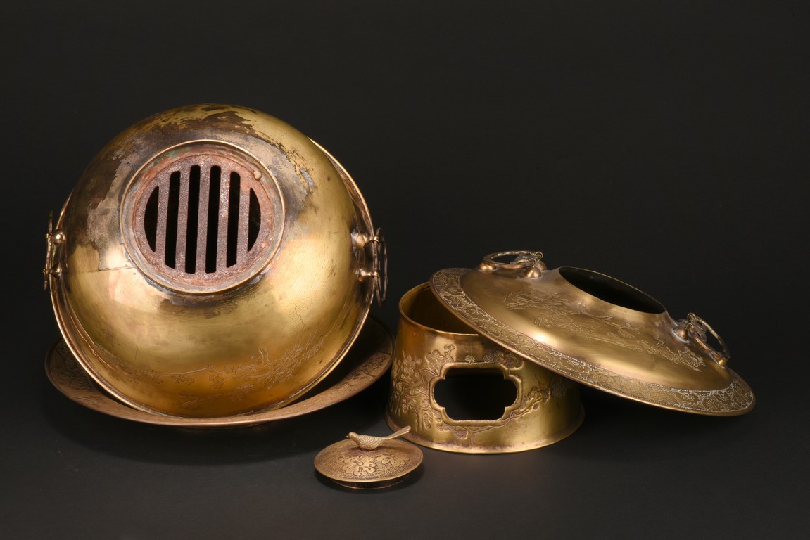 The hot pot with steep rounded sides, supported on an tall foot, the body etched with leafy plum pattern, flanked by two loose ring handles, the cover further decorated with similar plum design, topped with an bird finial. Republic period.