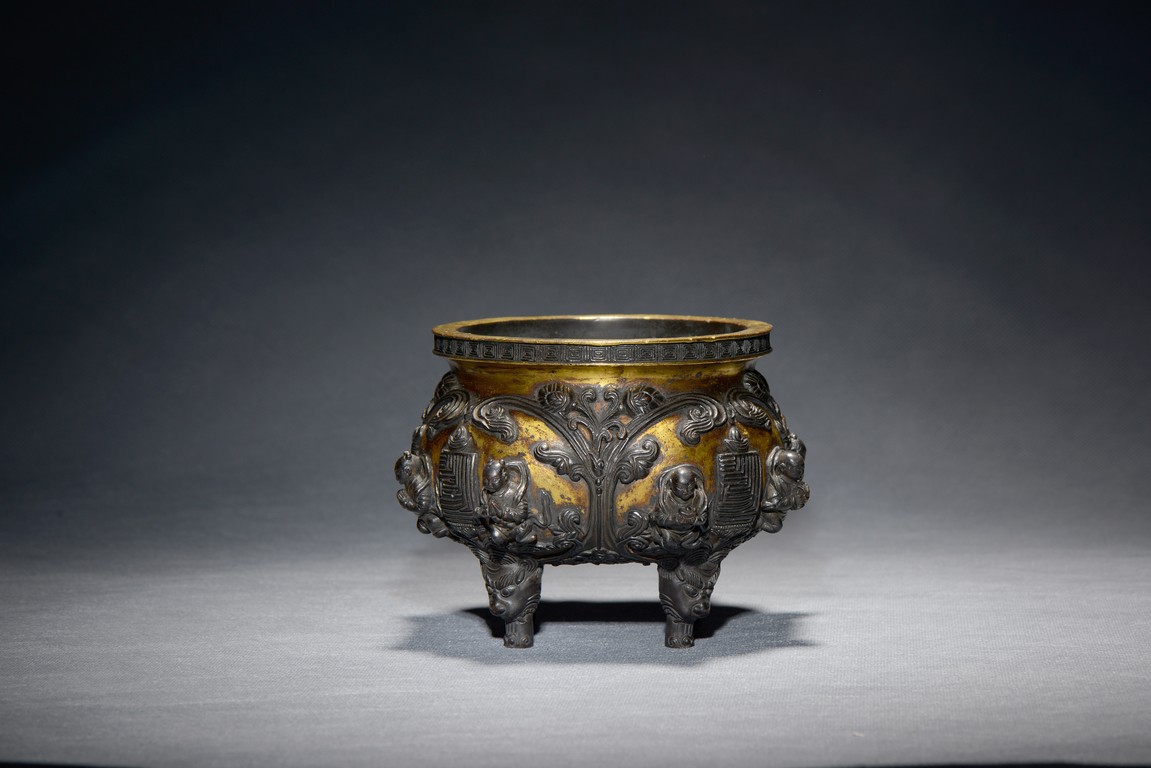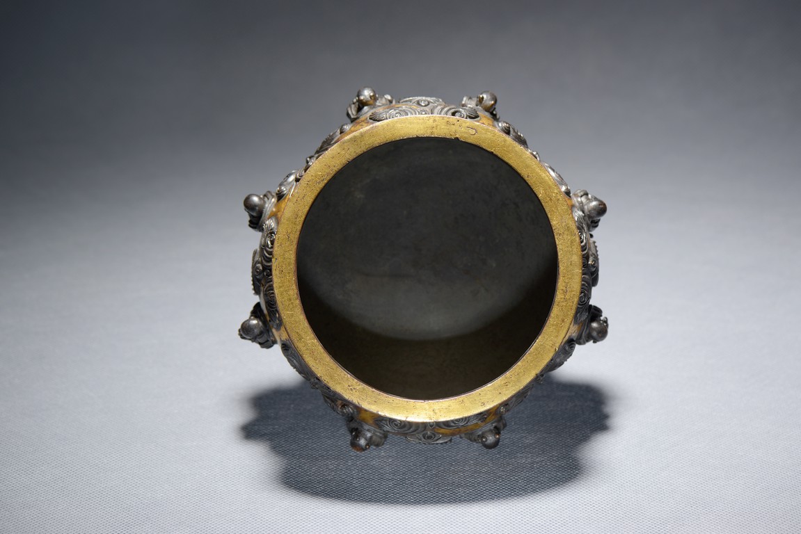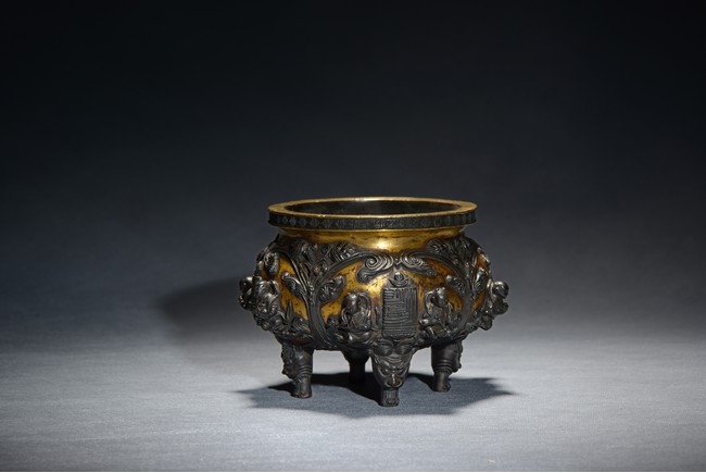 Supported on four mythical beast mask feet, the body finely cast in repousse with two fairchildren flanking an rectangular motif on four sides, spaced out by scrolled border emerging from the base, all reserve on gilt-bronze ground. The base with an three character mark surrounded by auspicious clouds. Qing Dynasty period.