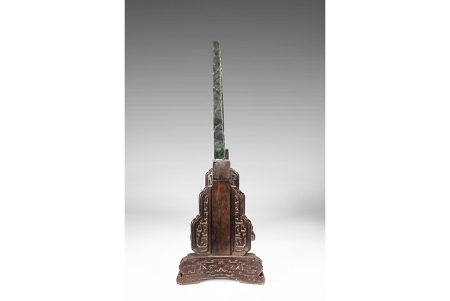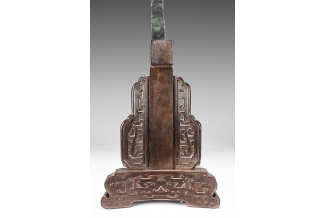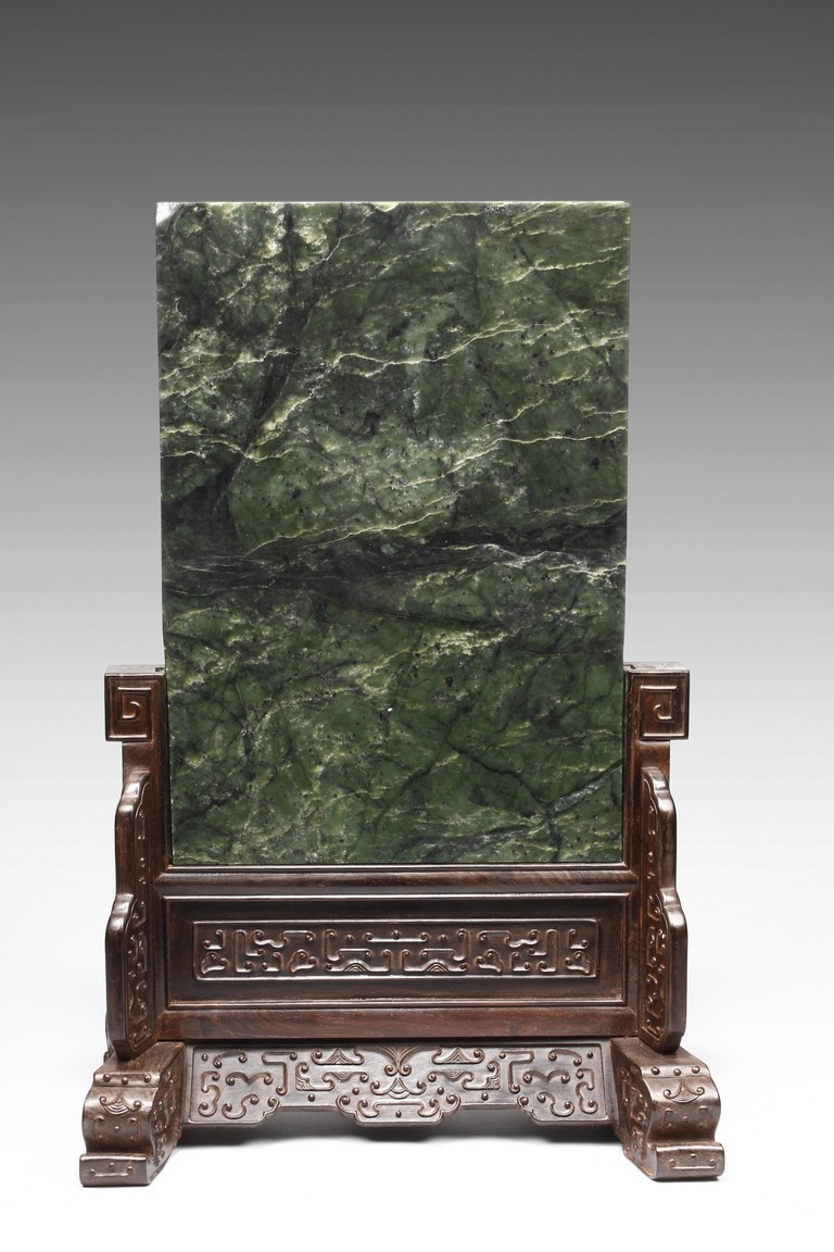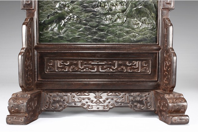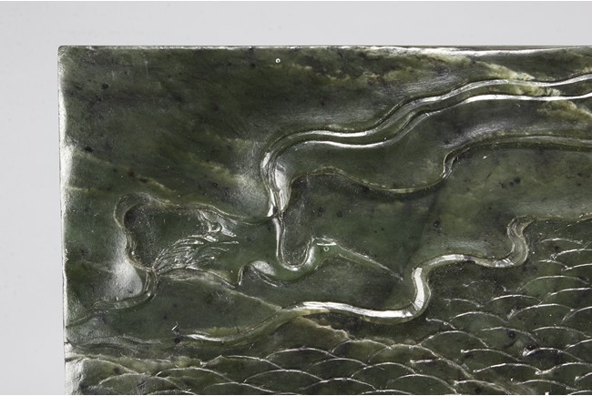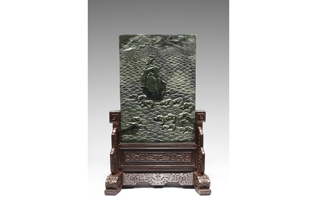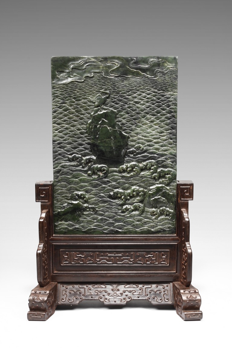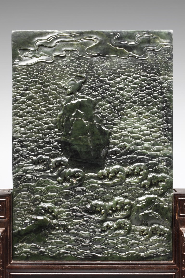The plaque is delicately carved in relief to depict an sea cliff landscape. It is detailed with an crane standing on top of an cliff with one leg lifting up, its head turned back to view the sky where another crane emerging from the clouds, all above an boundless ocean with turbulent sea waves. Qing Dynasty Period.
