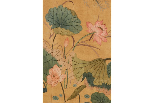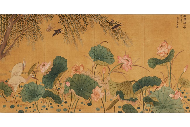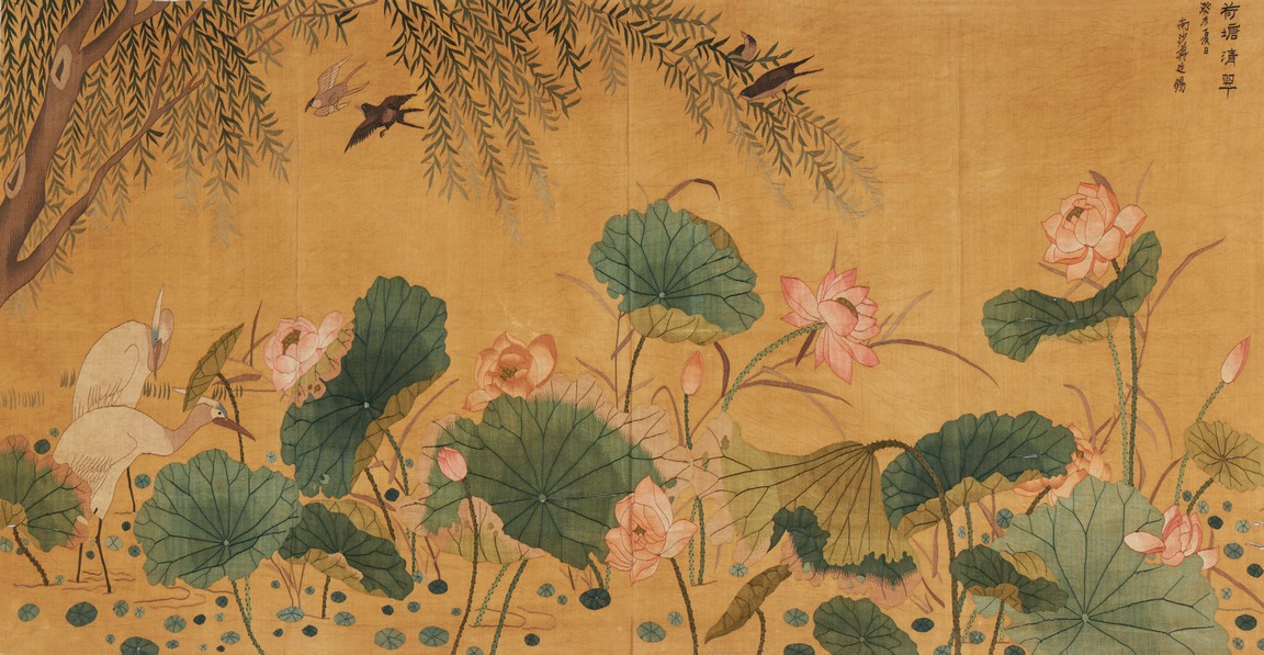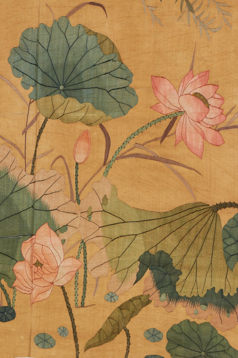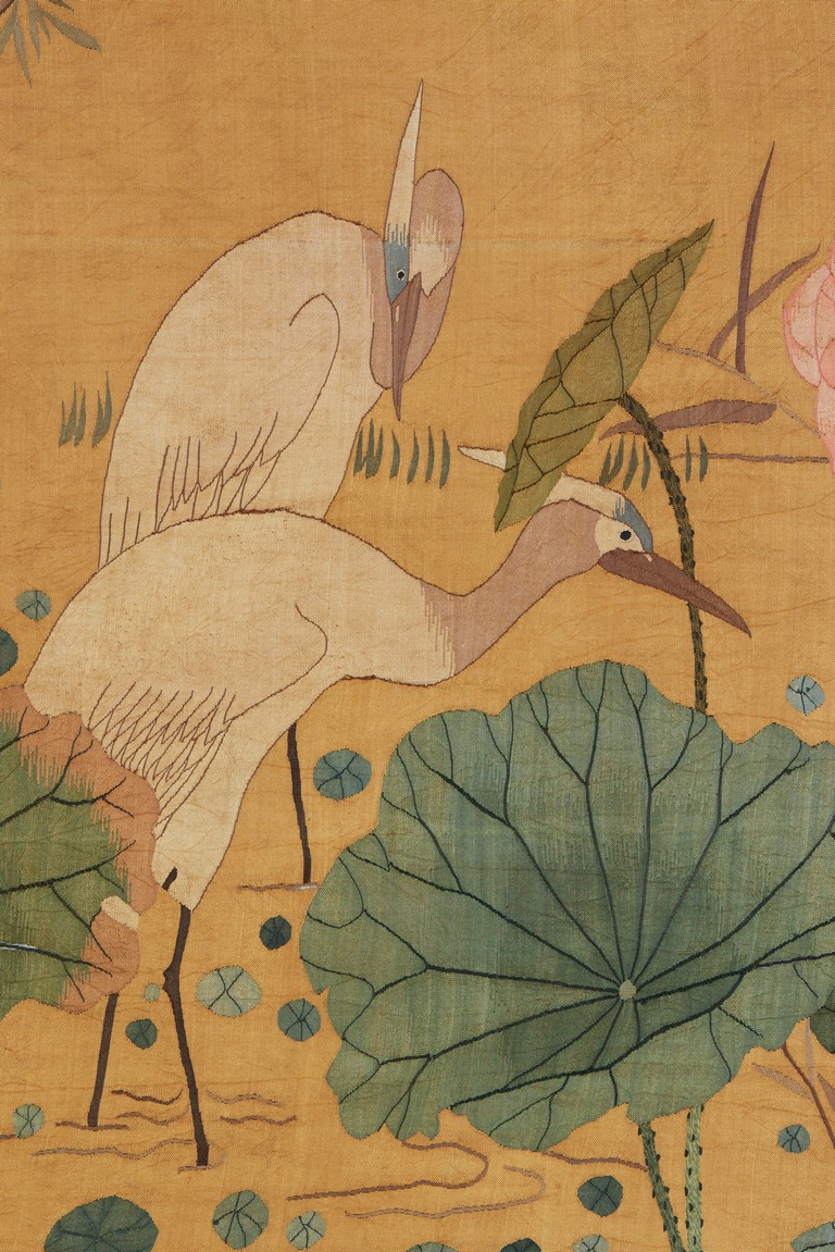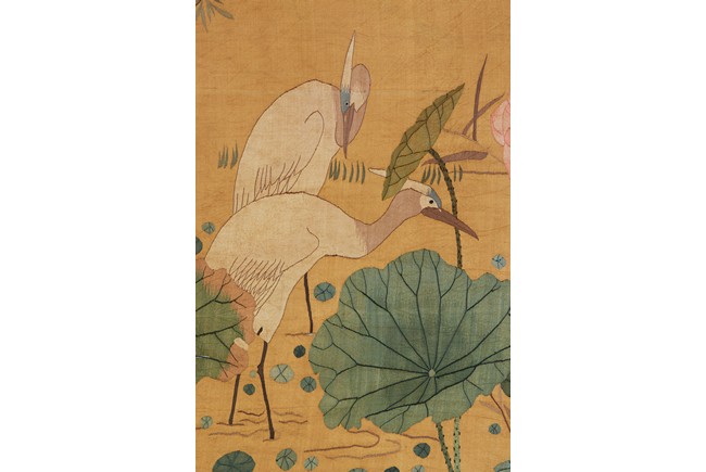 Of horizontal rectangular form, the ochre yellow silk ground embroidered with two white cranes standing on the left side of the lotus pond with pink lotus blossom, with inscriptions and artist sign. Qing Dynasty period.