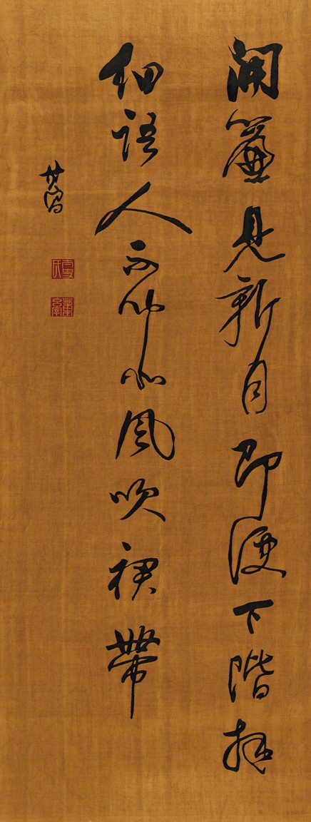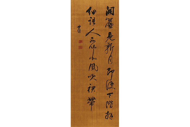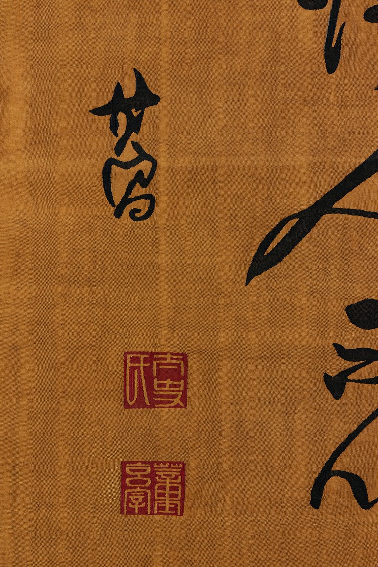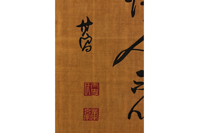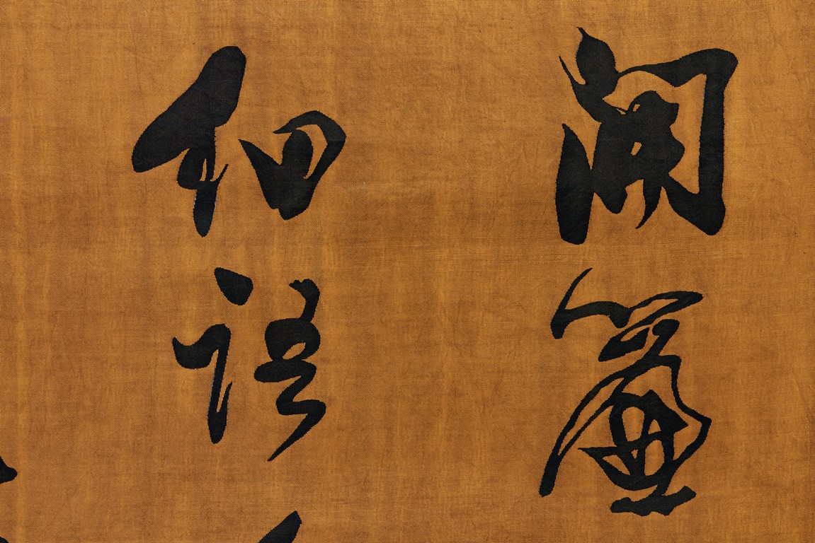 Ink on embroidered scroll. Cursive calligraphy. Hanging scroll. With the sign and two seals of the artist. Qing Dynasty period.