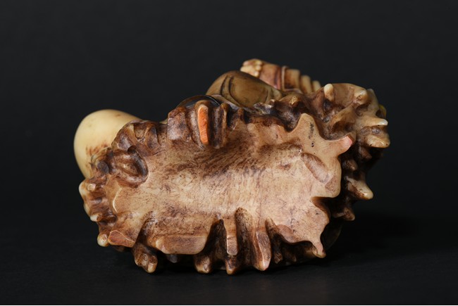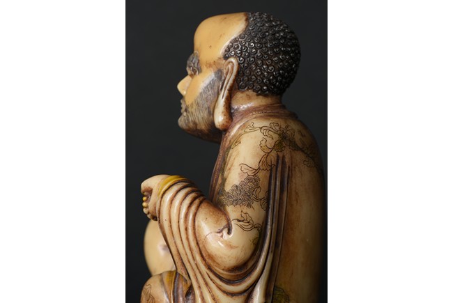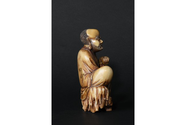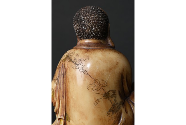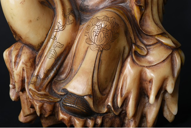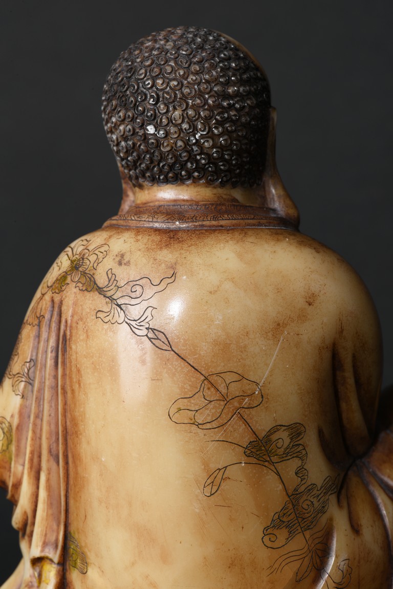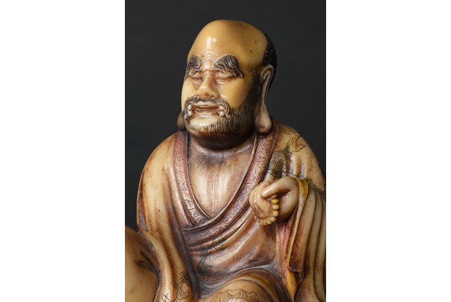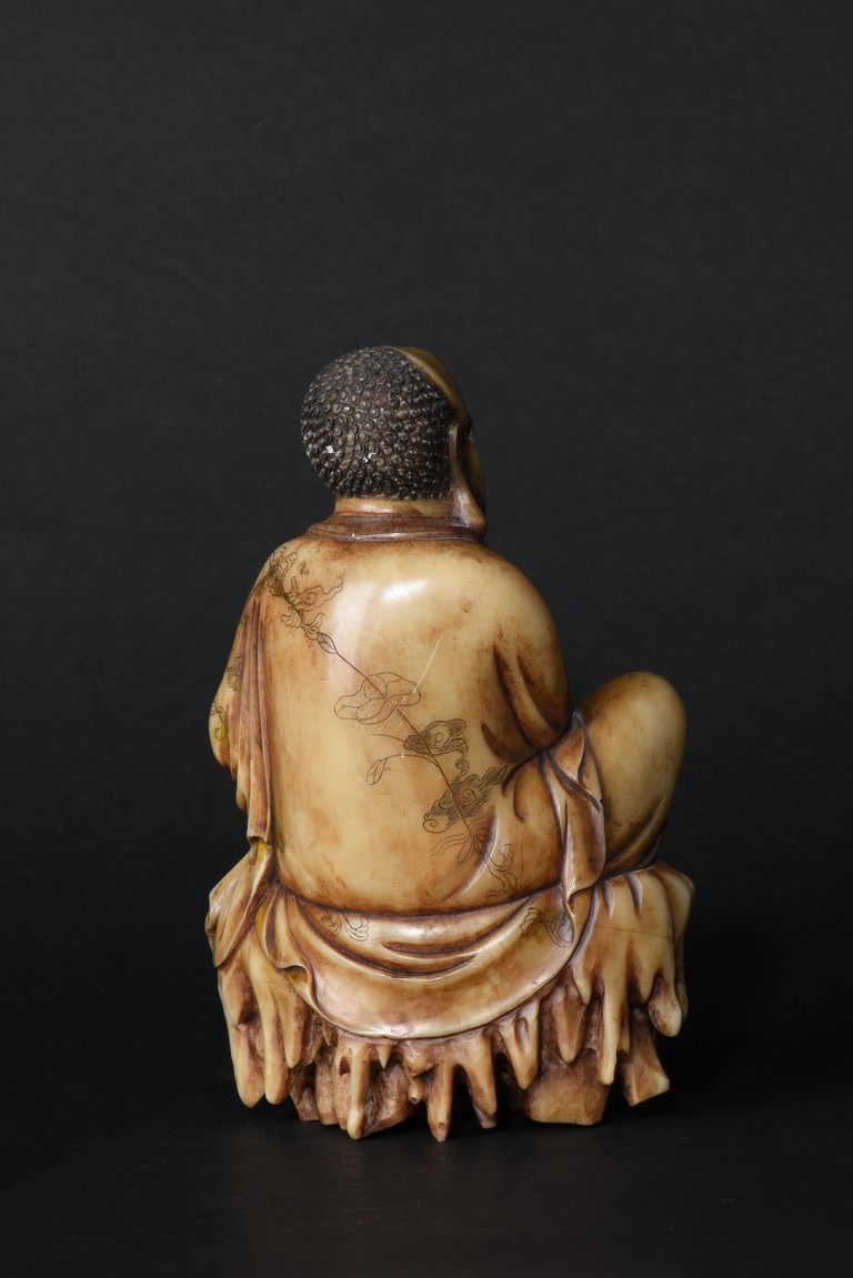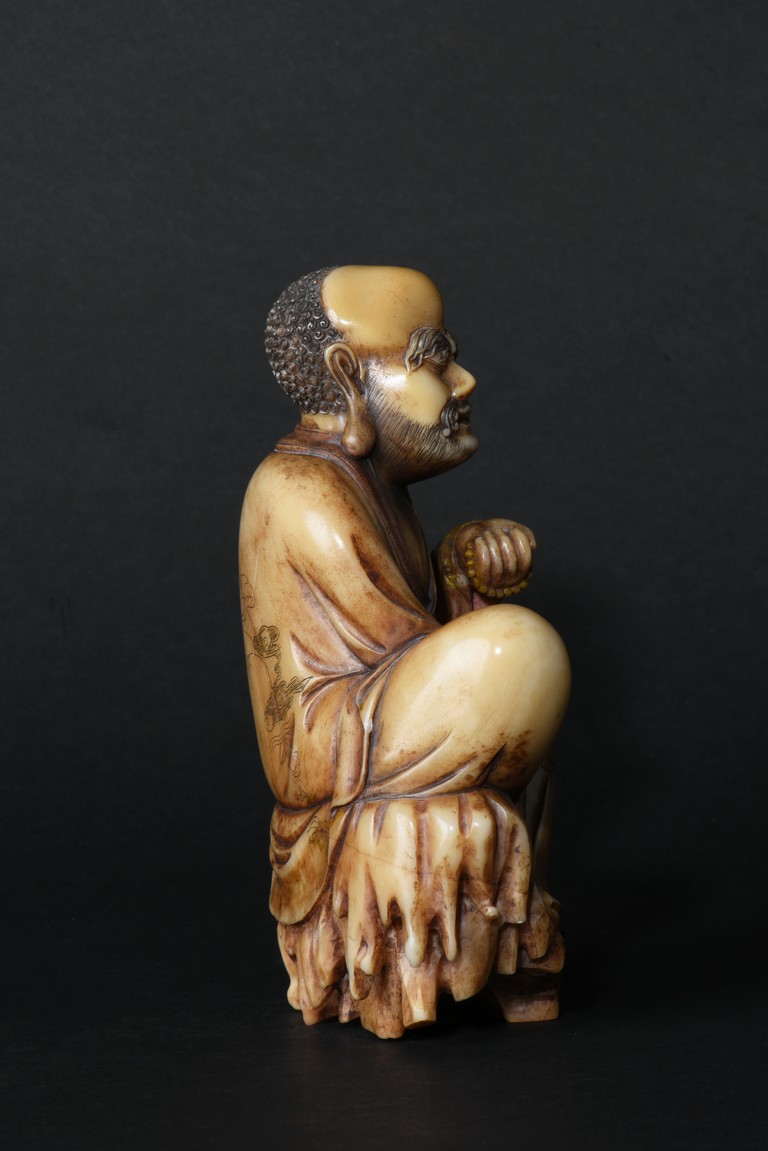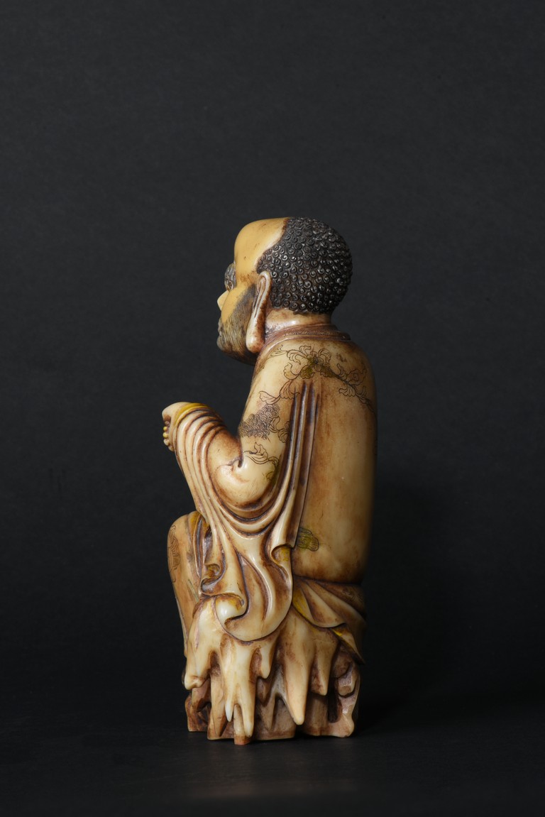 The cream-colored shoushan stone finely carved in the form of a luohan seated in meditative pose, with right knee raised and left foot stepped on rock, dressed in loose fitting robe incised with scrolled floral decoration, partly open at chest, left hand holding a string of beads. Qing Dynasty period.