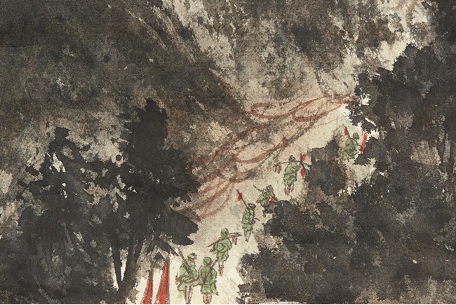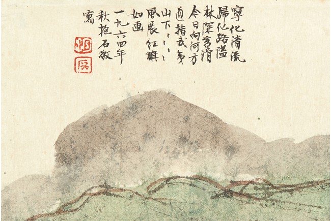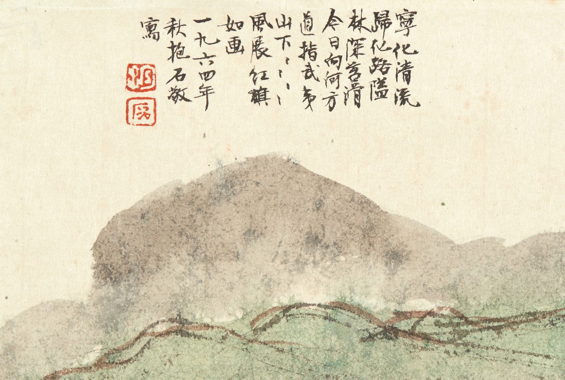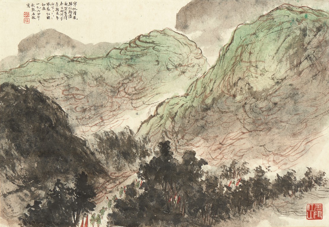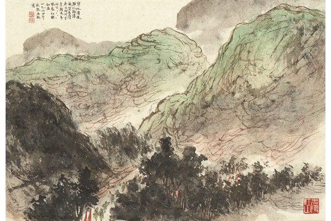 Ink and color on paper. Landscape. Signed Fu Baoshi and with three seals of the artist. Attributed to Fu Baoshi.