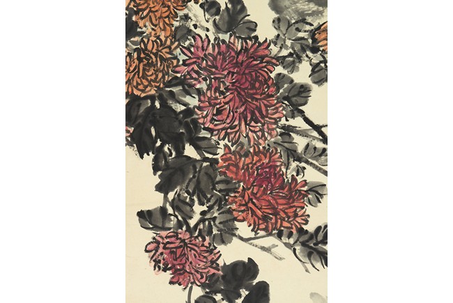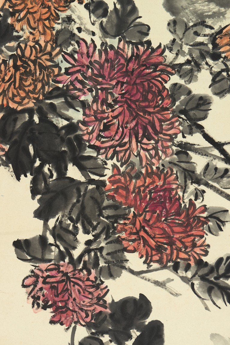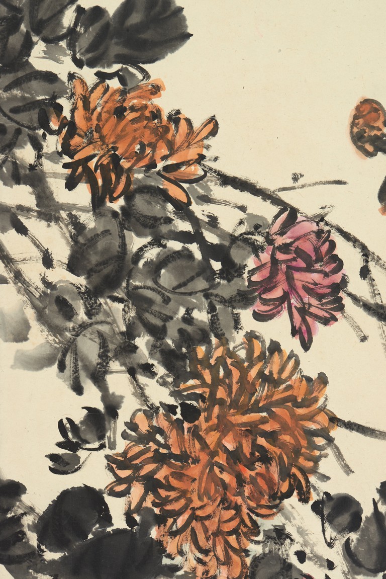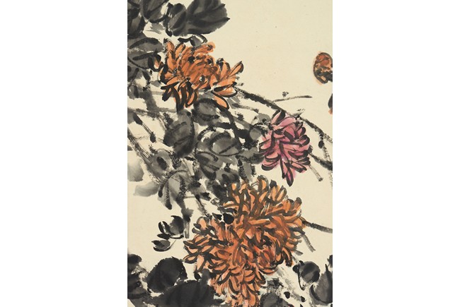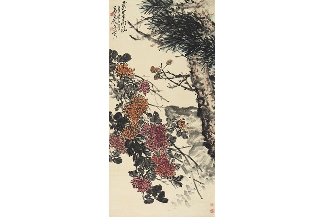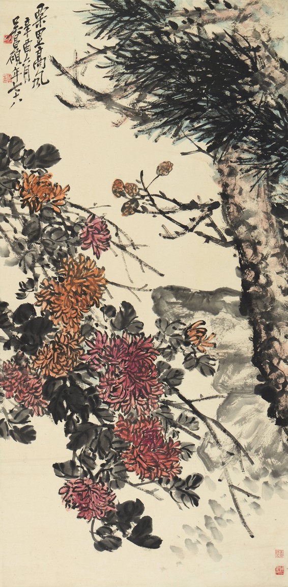 Ink and color on paper. Chrysanthemum. Signed Wu Changshuo and with four seals of the artist.