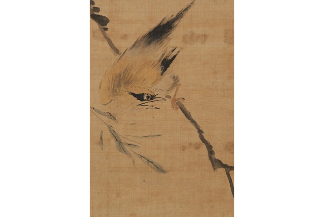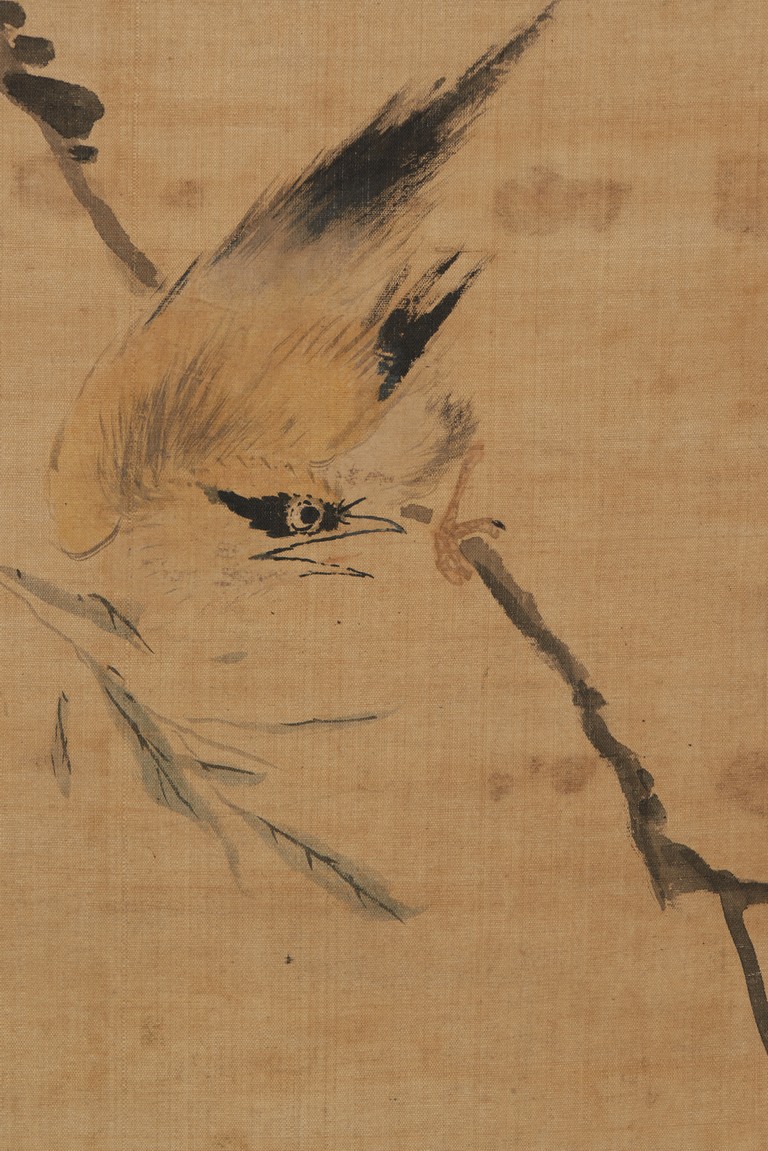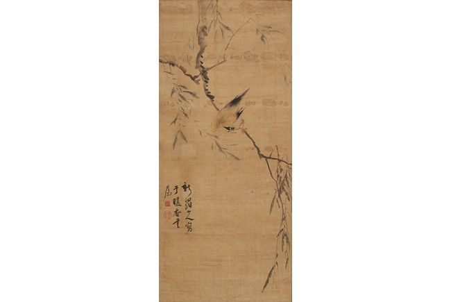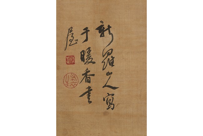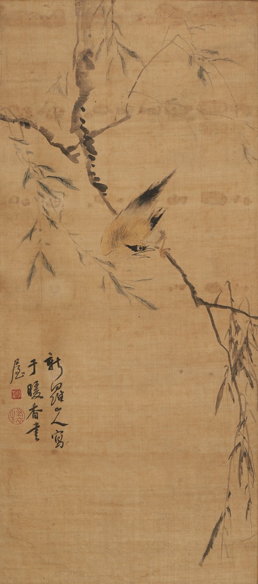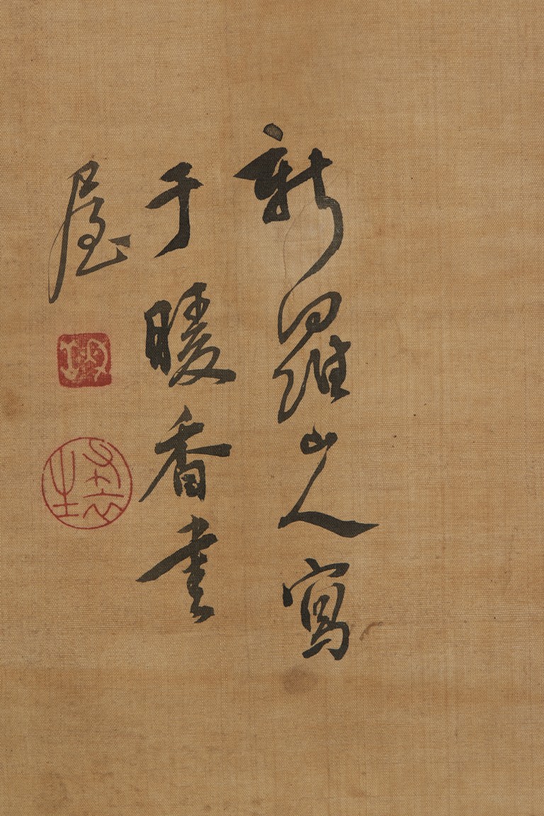 Ink and color on silk. Flower and bird. Signed Xin Luo Shan Ren and with two seals of the artist. Attributed to Hua Yan.
