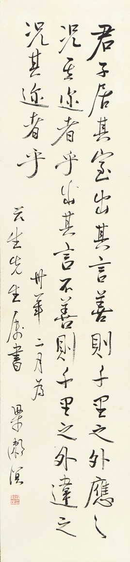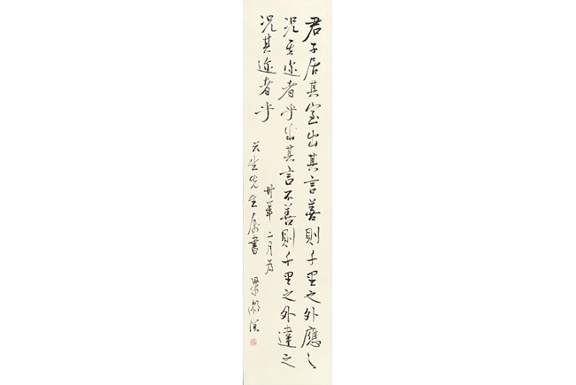 Ink on paper. Calligraphy. Framed. Signed Liang Shuming and with one seal of the artist.