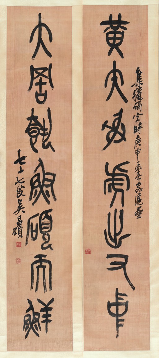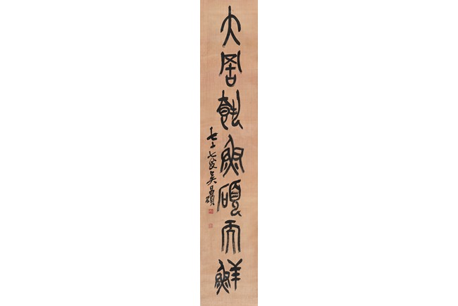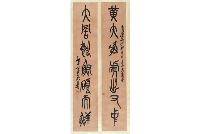 WU CHANGSHUO: INK ON SILK CALLIGRAPHY HANGING SCROLL 吳昌碩 篆書七言聯 絹本 立軸