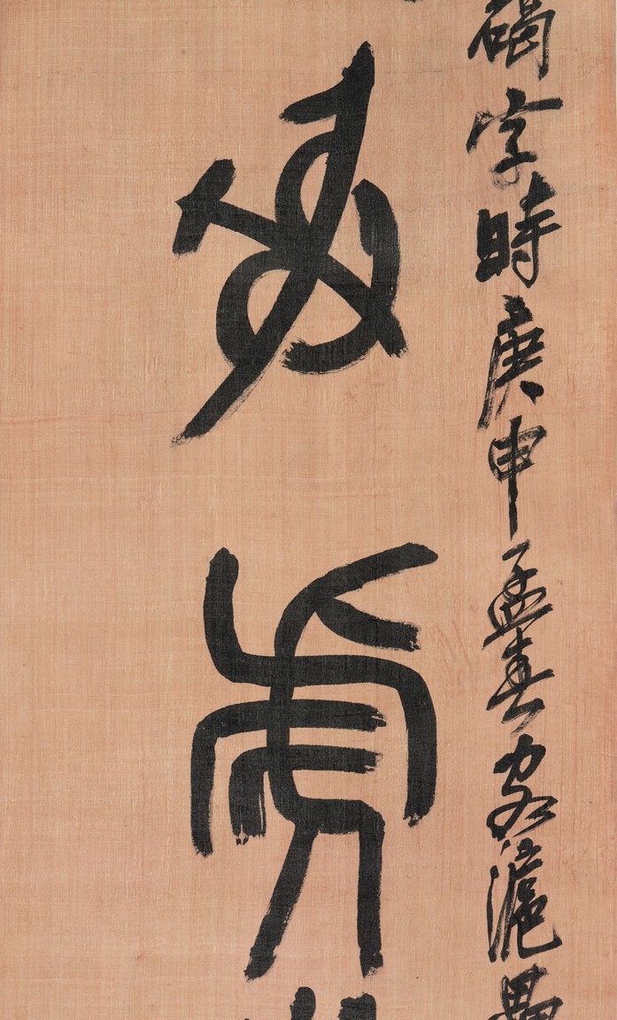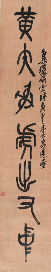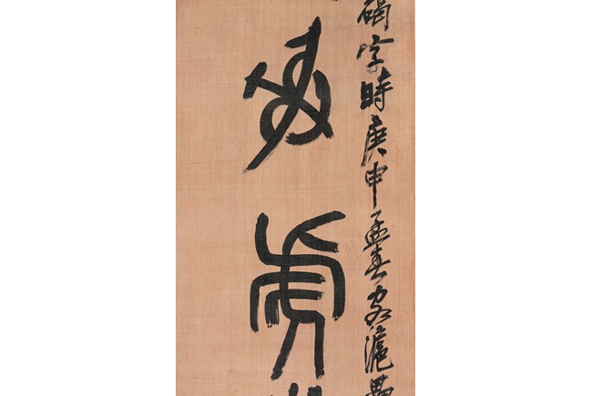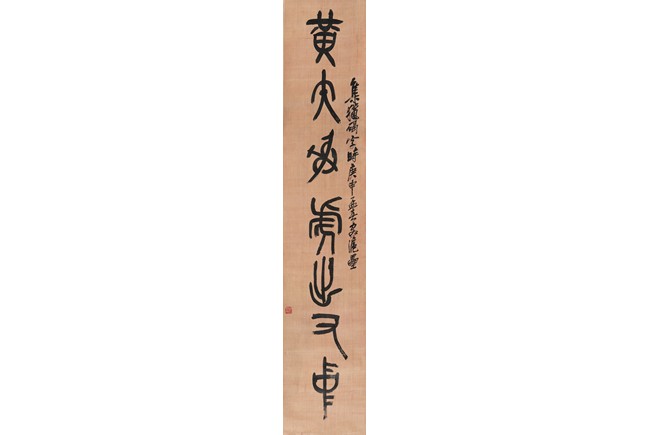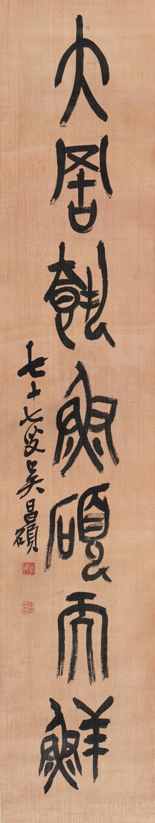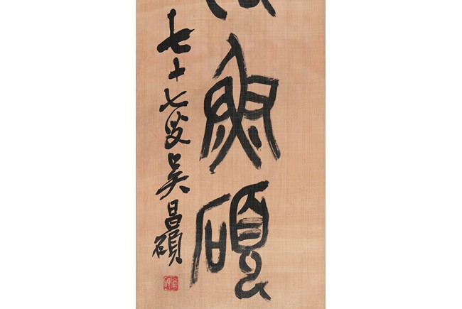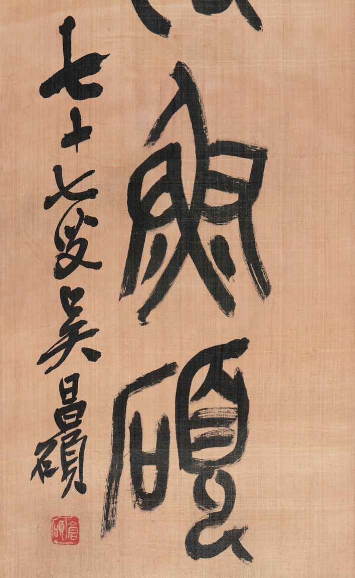 Ink on silk. Seal script. Hanging scroll. Signed Wu Changshuo and with three seals of the artist.