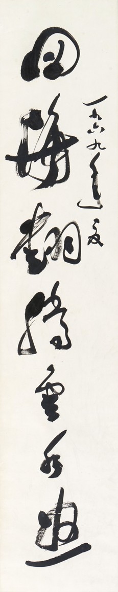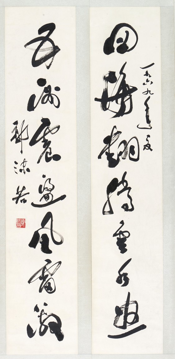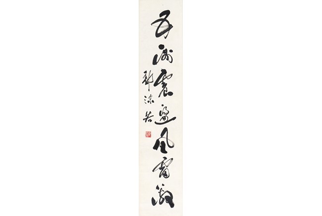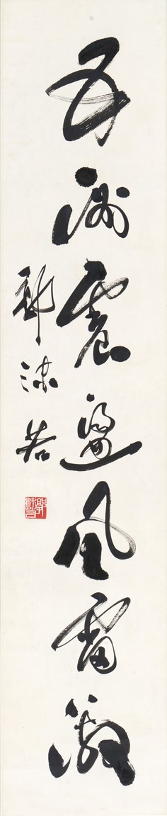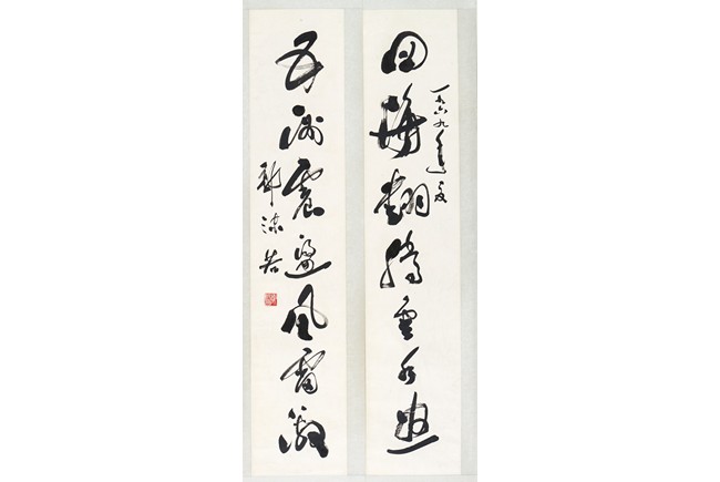 GUO MORUO: INK ON PAPER CALLIGRAPHY HANGING SCROLL 郭沫若 草書七言聯 紙本 鏡心