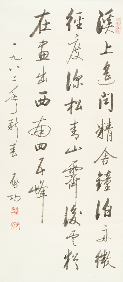 Ink on paper. Running script calligraphy. Signed Qi Gong and with three seals of the artist.