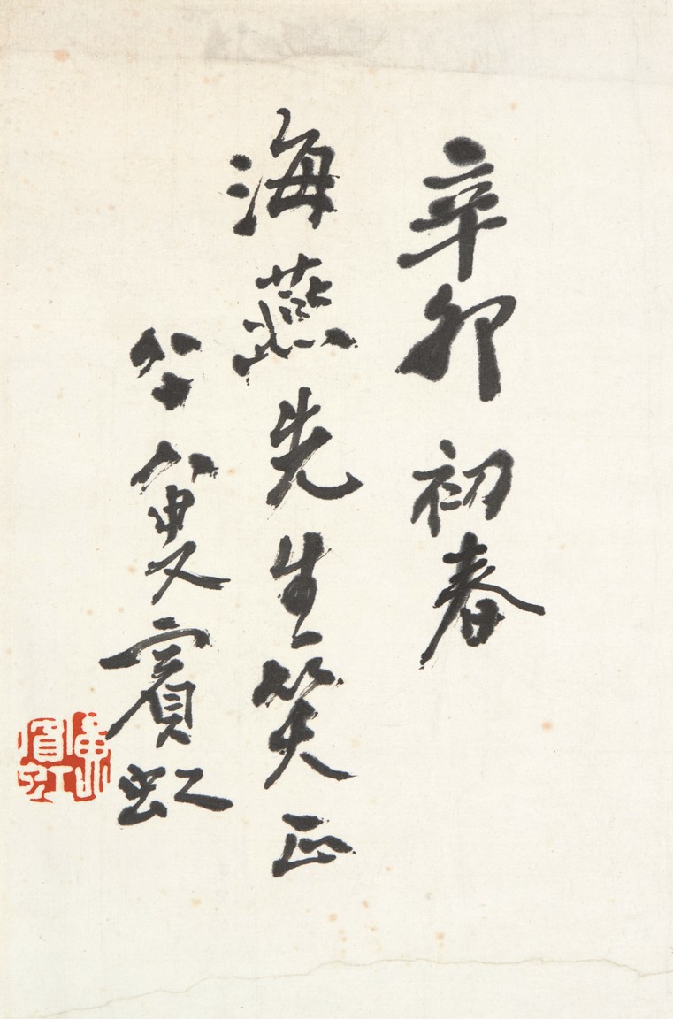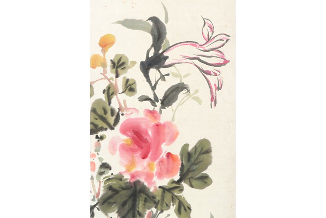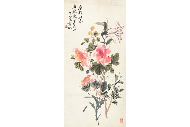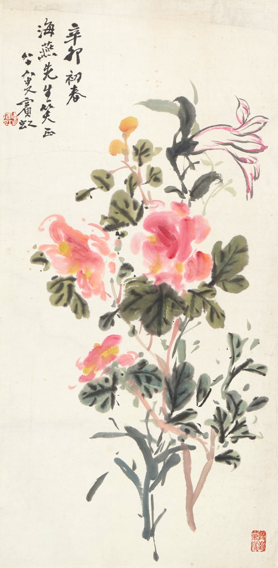 Ink and color on paper. Flowers. Signed Binhong and with two seals of the artist.