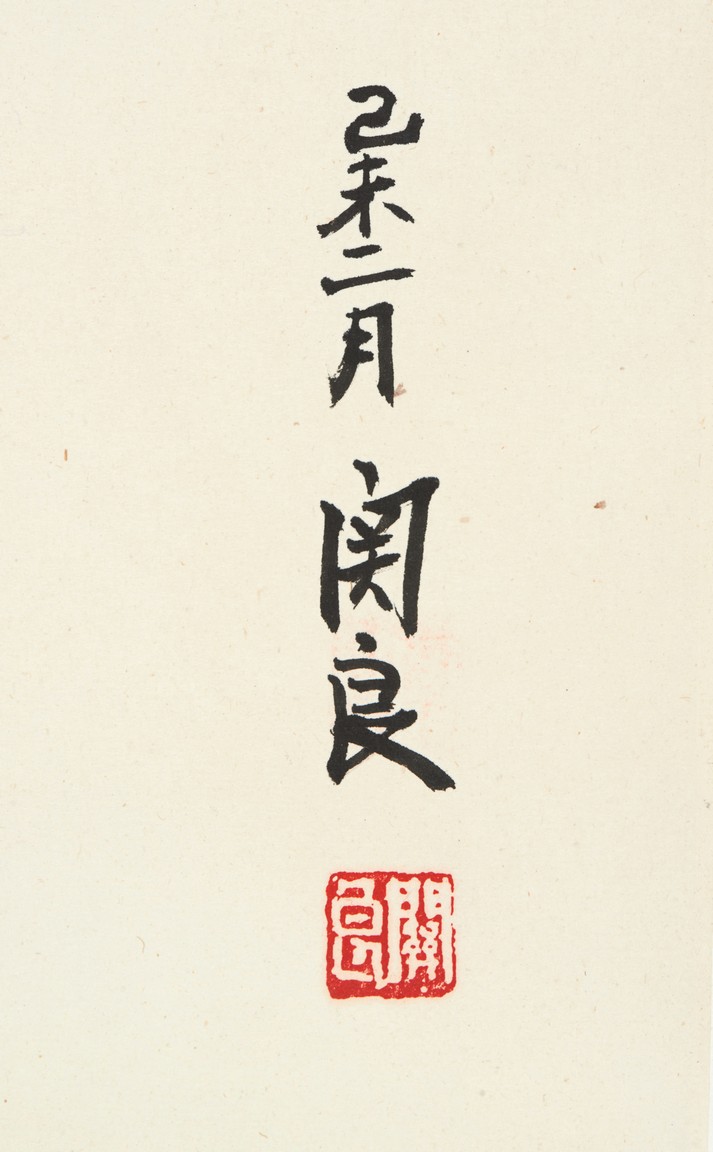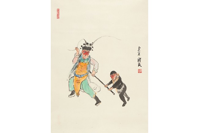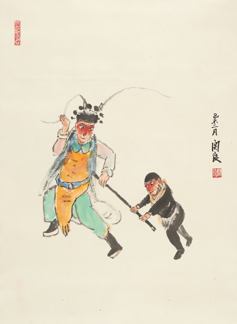 Ink and color on paper. Opera figures. Signed Guan Liang and with two seals of the artist.
