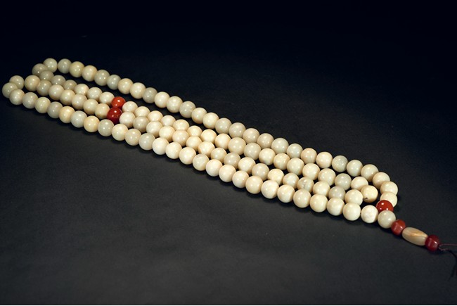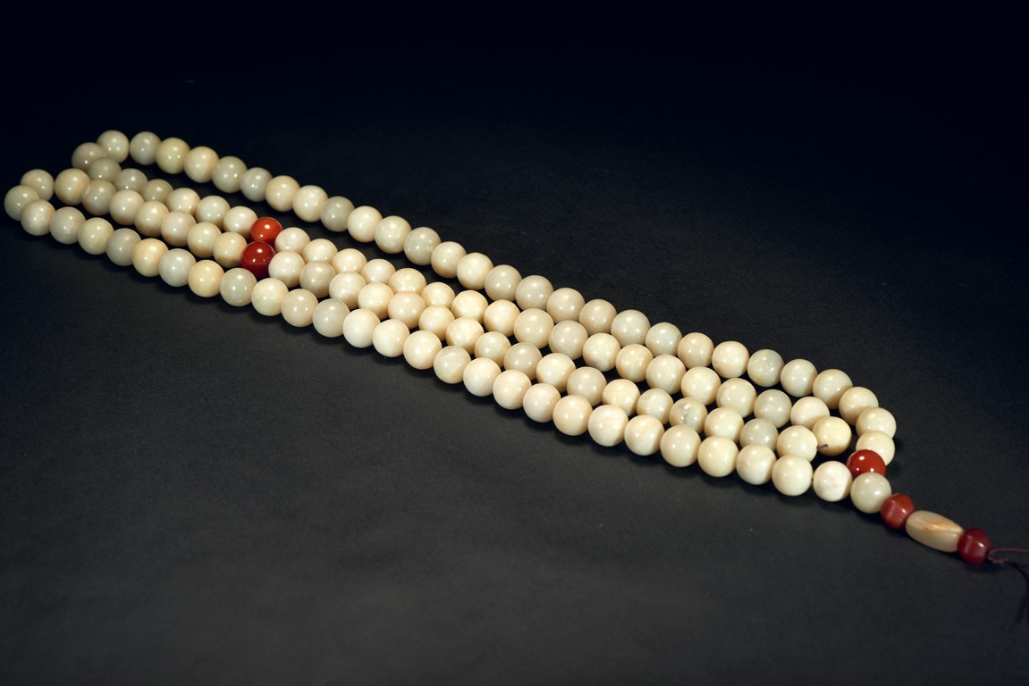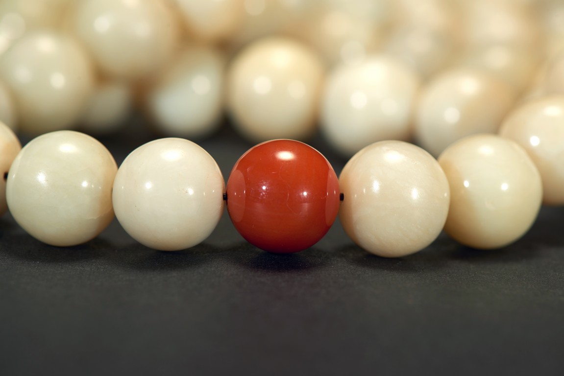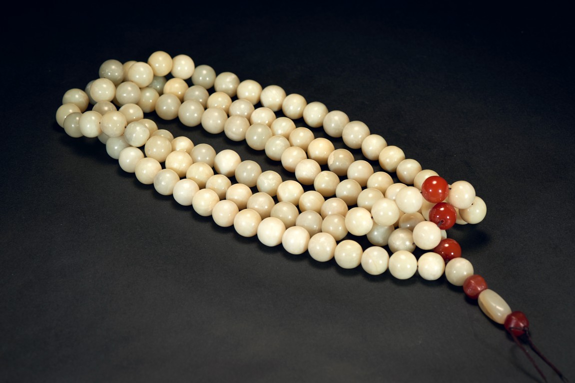 Each of rounded form and composed of white jade, coral and amber beads of similar size.The smoothly polished jade of warm white and yellowish colour with russet inclusion.