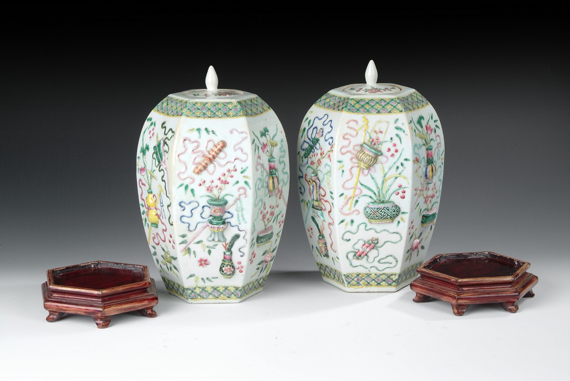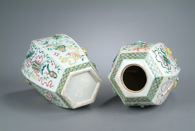 Of drum from, the faceted body decorated with an raised 'hundred antiques' design, each of the six lobes depicting different items, in between scrolling flowers pattern at the top and bottom, and an cover with butterfly flying around flowers. Completed with original wooden stands. Late Qing Early Republic period.