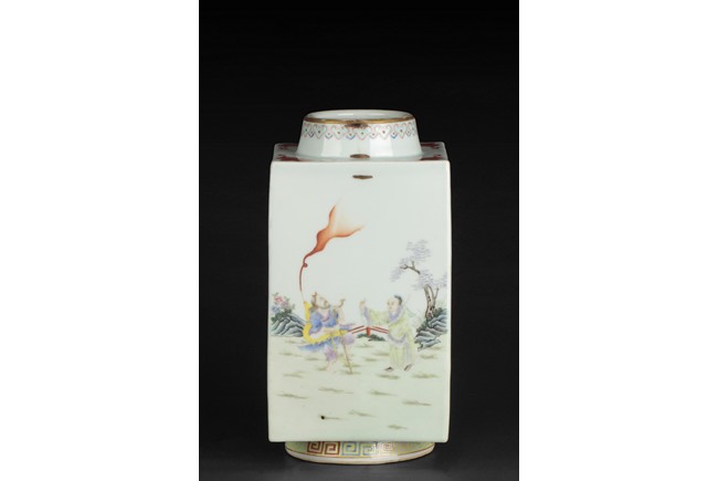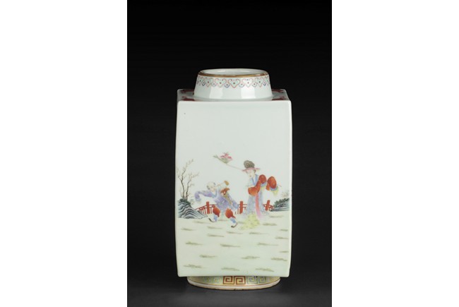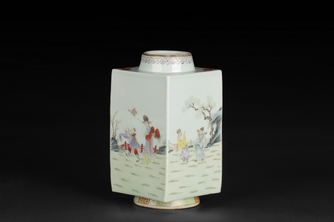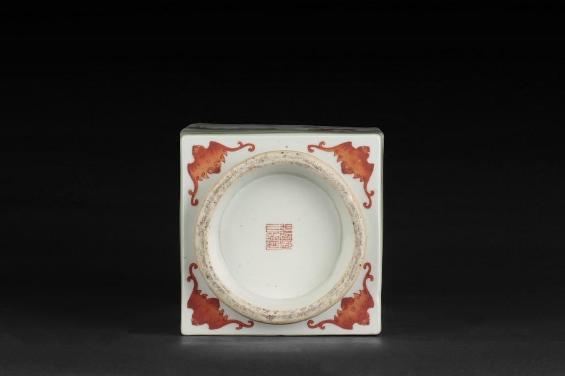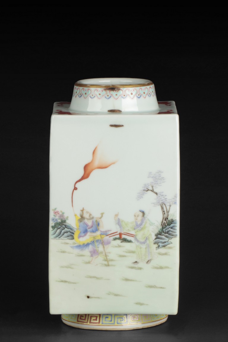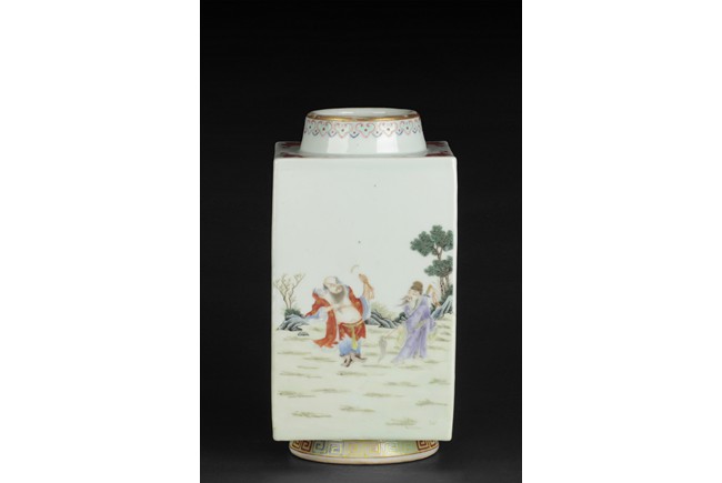 Of rectangular from, each side of the exterior painted with two Immortals in garden setting, the ring foot with key-fret patterns, shoulder with an bat in each corner, and neck with Ruyi head patterns; bottom bears six characters 'QIANLONG' mark. Repairs on the neck/rim. Qing Dynasty period.