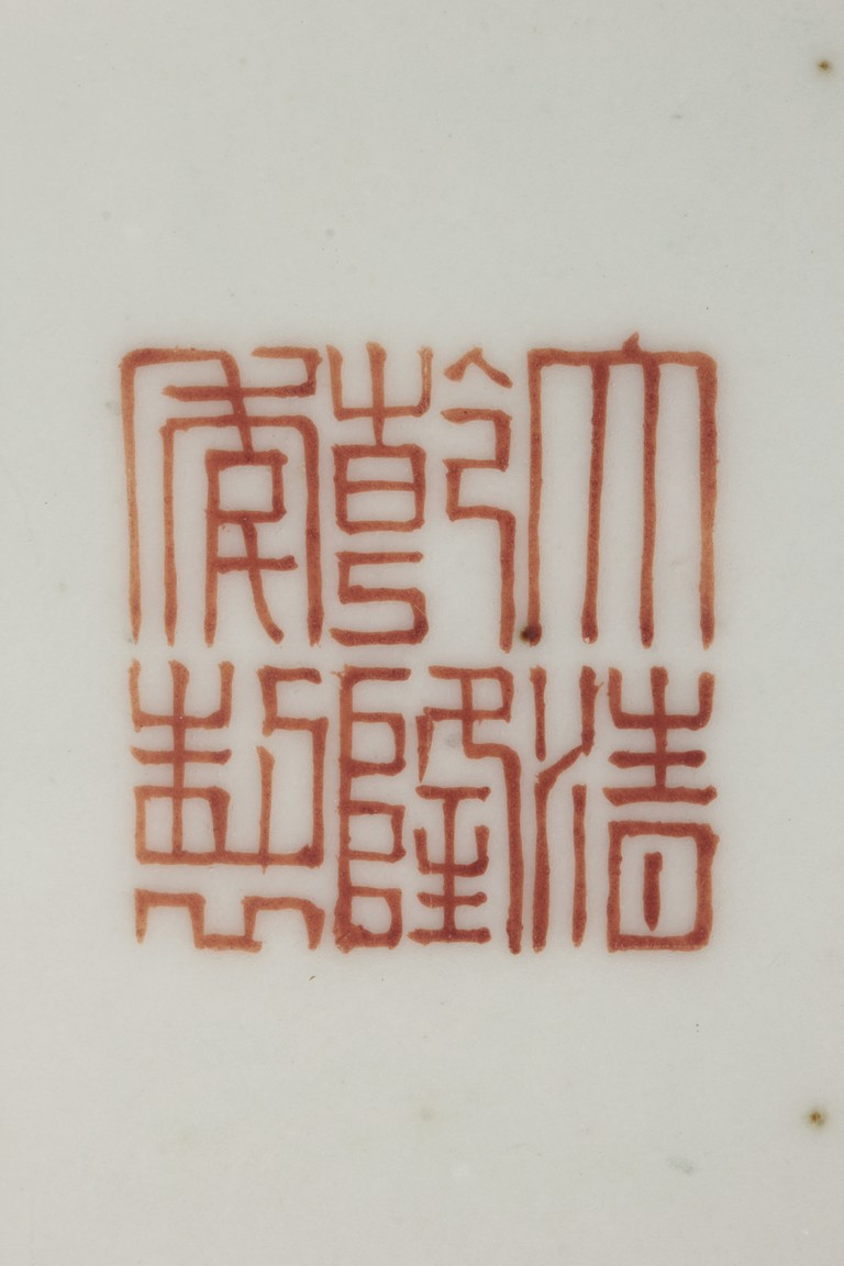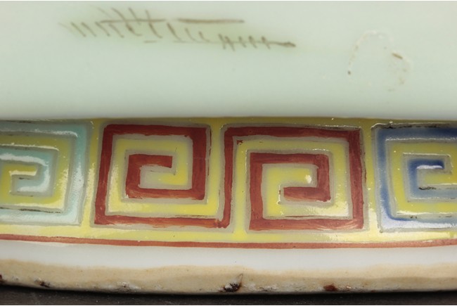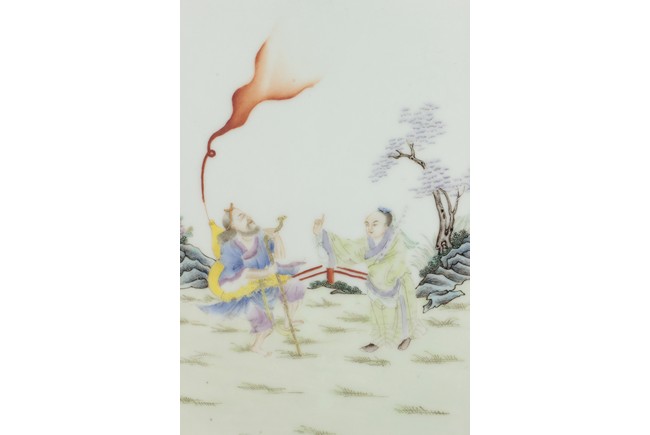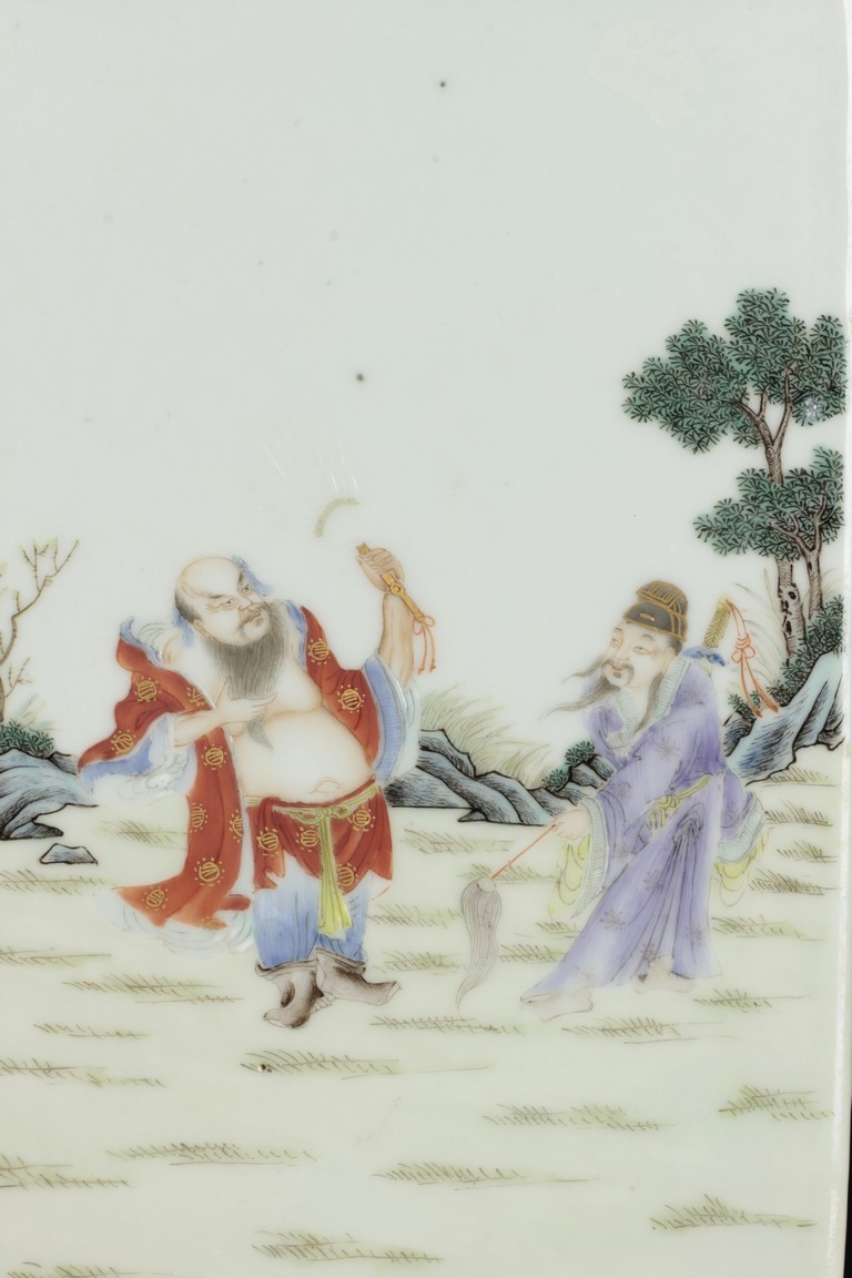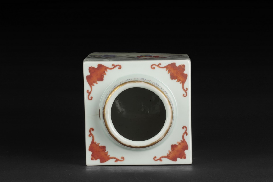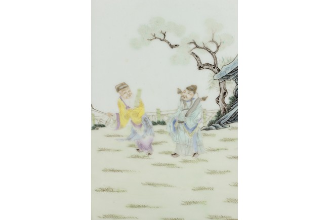 Of rectangular from, each side of the exterior painted with two Immortals in garden setting, the ring foot with key-fret patterns, shoulder with an bat in each corner, and neck with Ruyi head patterns; bottom bears six characters 'QIANLONG' mark. Repairs on the neck/rim. Qing Dynasty period.