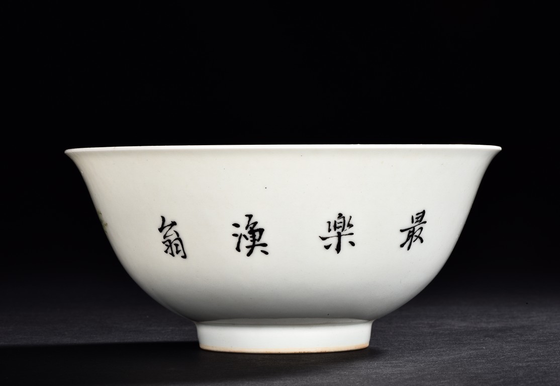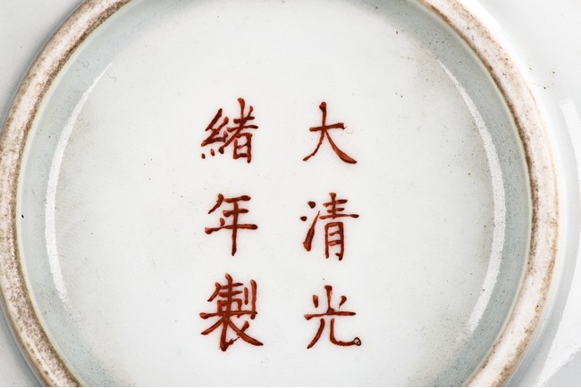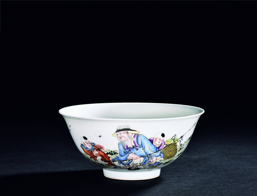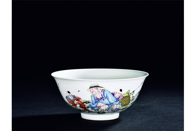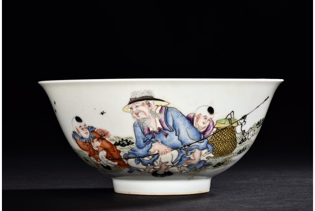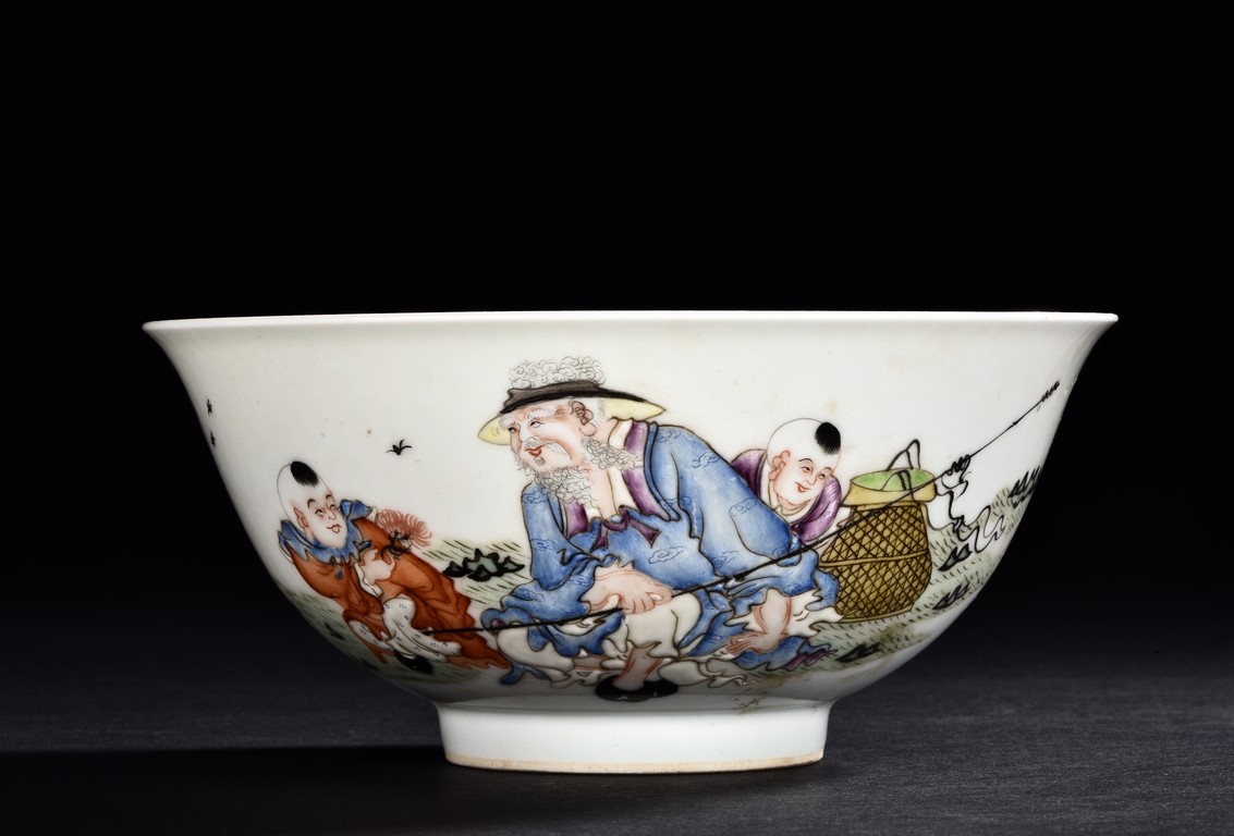 Raised on an circular bottom foot ring, the body raised to an slightly flared rim, the body enamelled with figural scene of elderly man and two boys. The bottom bears six character ' Guang Xu' mark. Qing Dynasty Guangxu period.