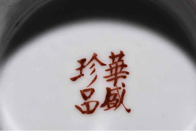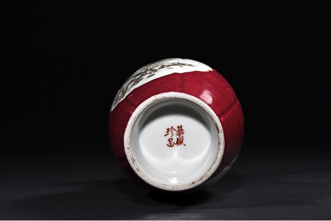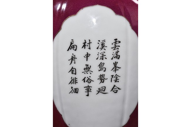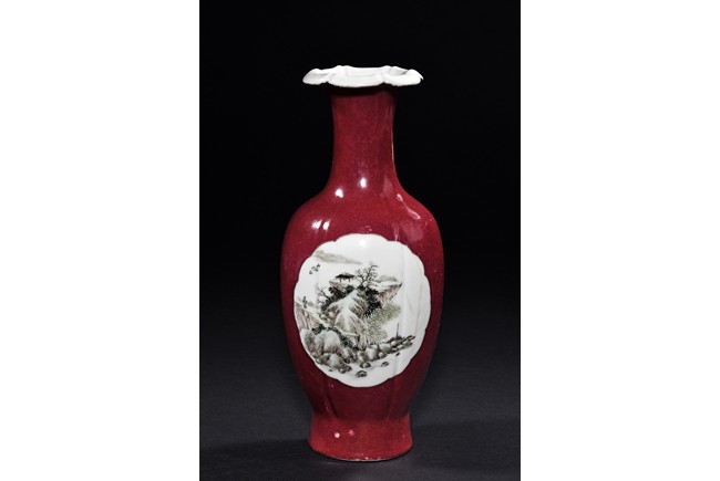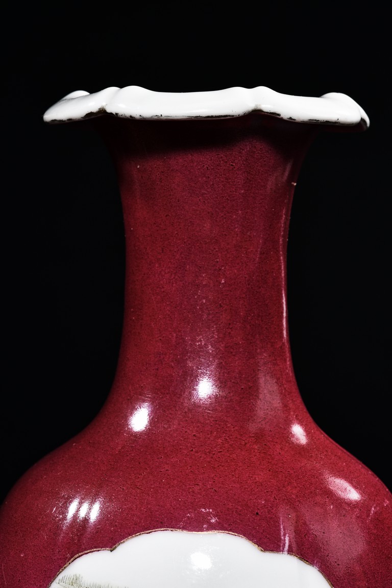 The vase rises to an widely flared rim with six lobes, the body covered in red glaze with two medallions on both sides enclosing an landscape scene and semi-cursive poem. The bottom bears four character mark 'Hua Sheng Zhen Pin'. Late Qing Dynasty period.