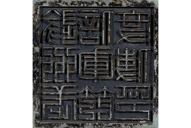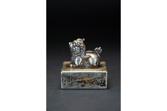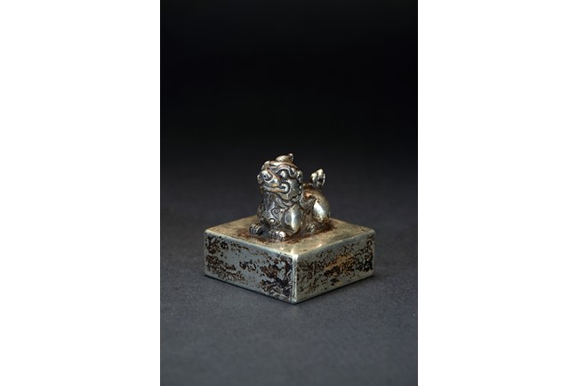 The square seal finely cast with an recumbent mythical beast on top as finial, the head detailed with powerful nose and large protruding eyes, the seal underside cast with nine characters in clerical script. Qing Dynasty period.