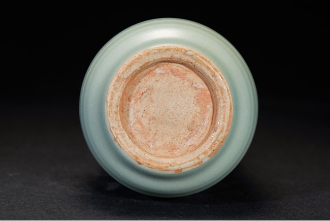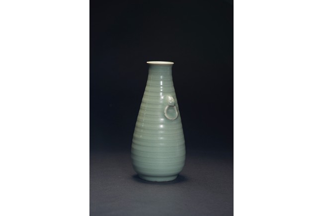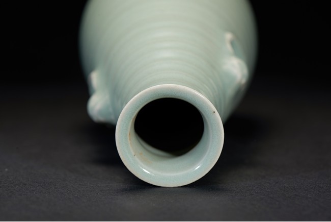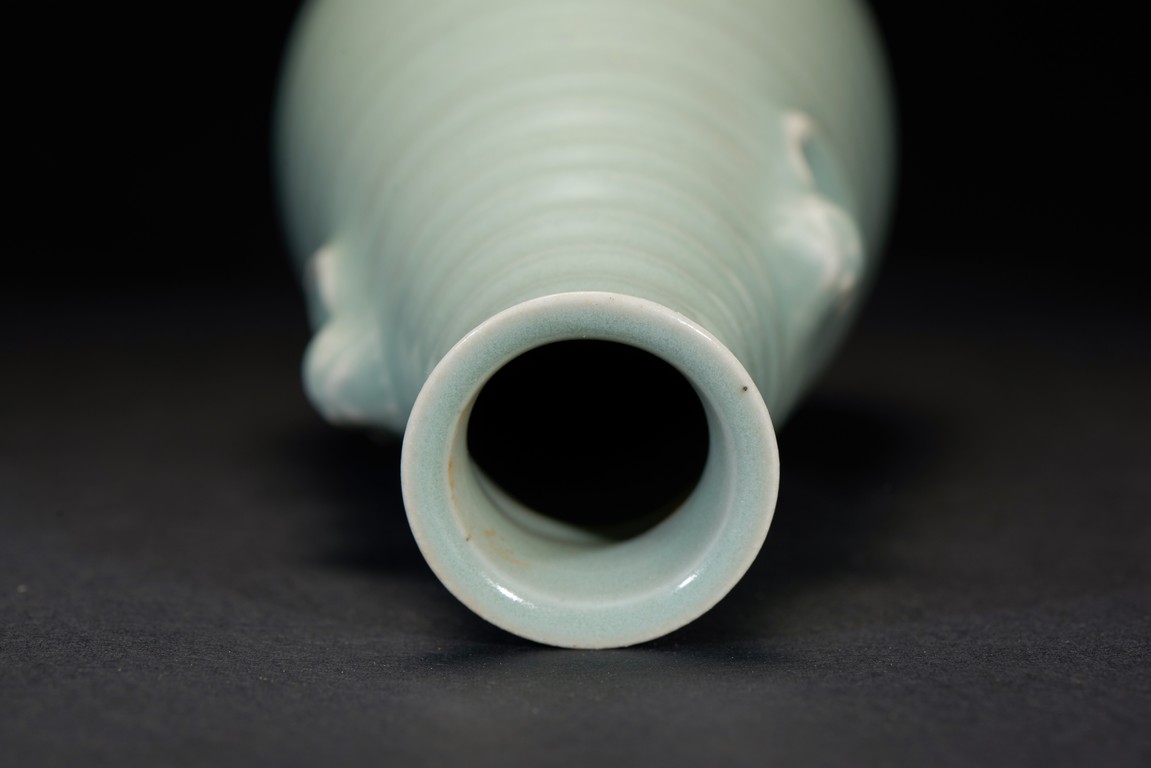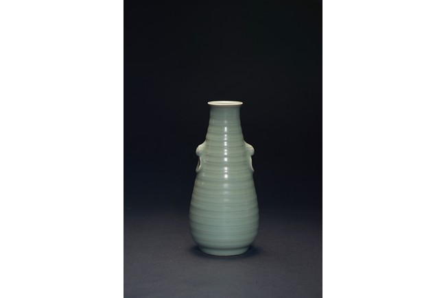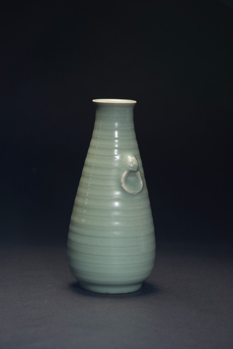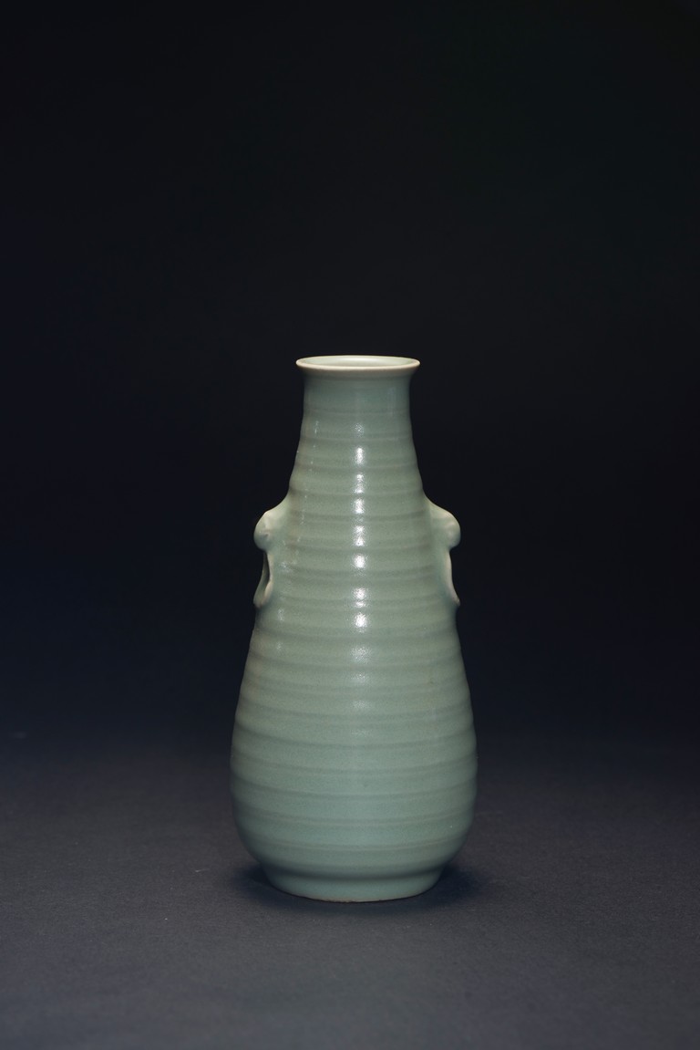 Of long pear-shaped form, raised on short circular foot, the body overall covered with celadon glaze, the shoulder side flanked by an pair of beast head with two circular handles in relief.