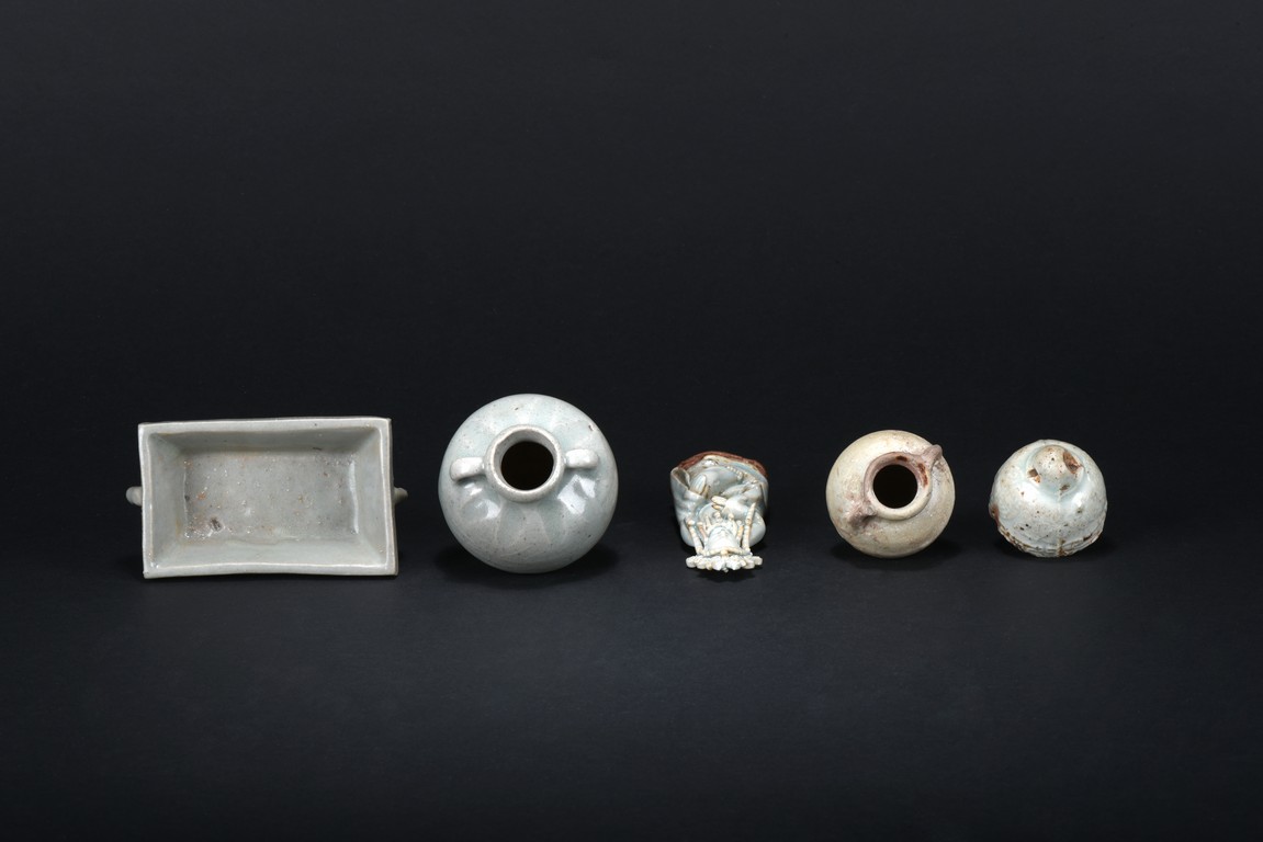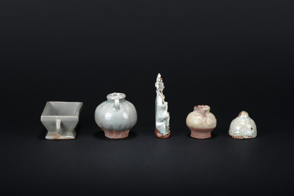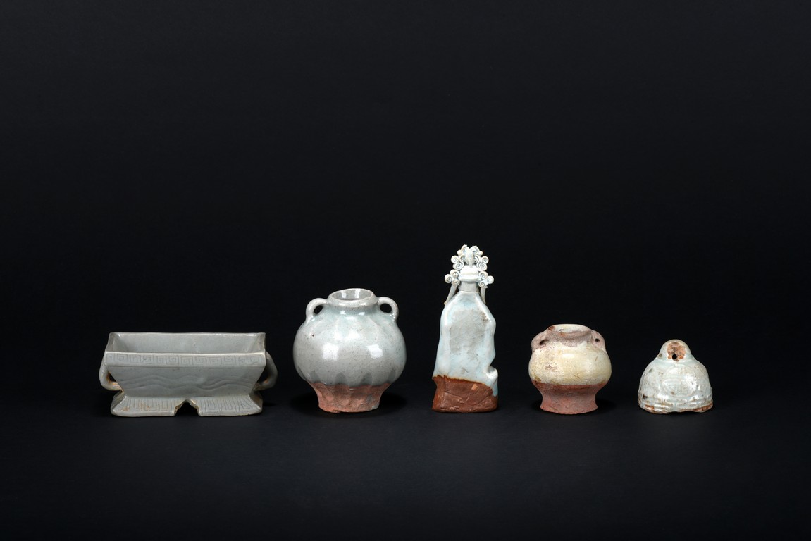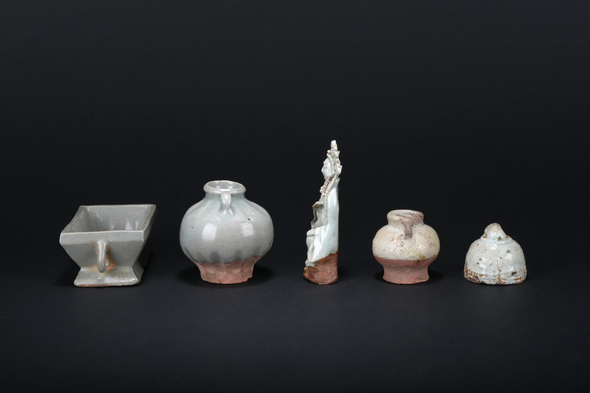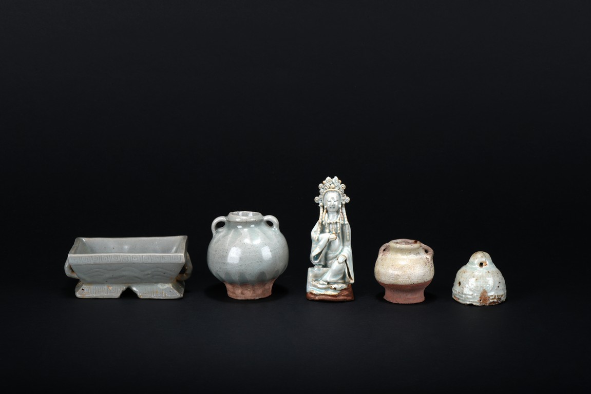 Consisting of an blanc-de-chine guanyin figure, an archaistic celadon vessel, two glazed two-ear jars, and an celadon weight. Ming Dynasty period.